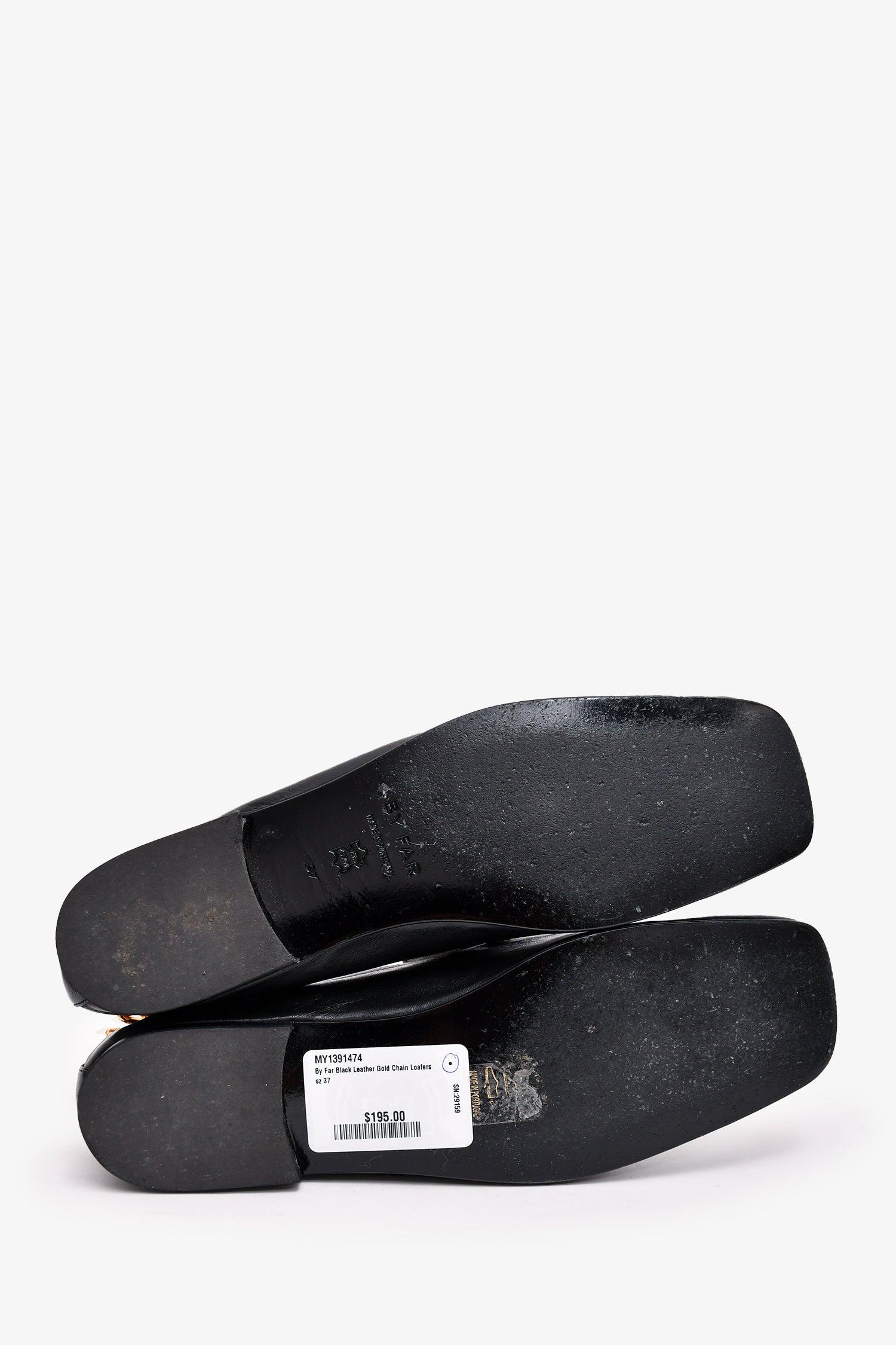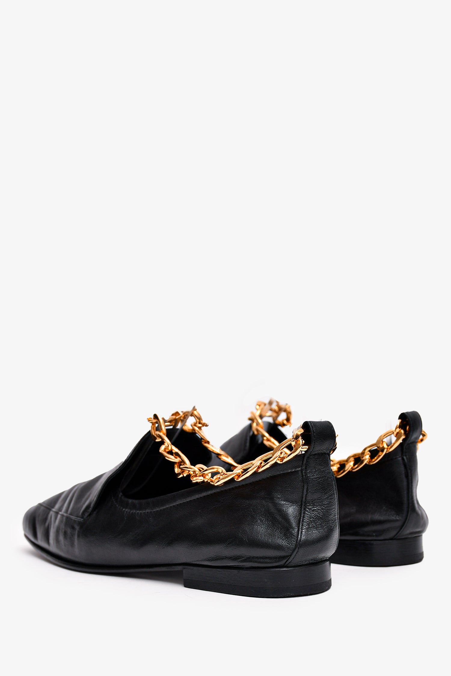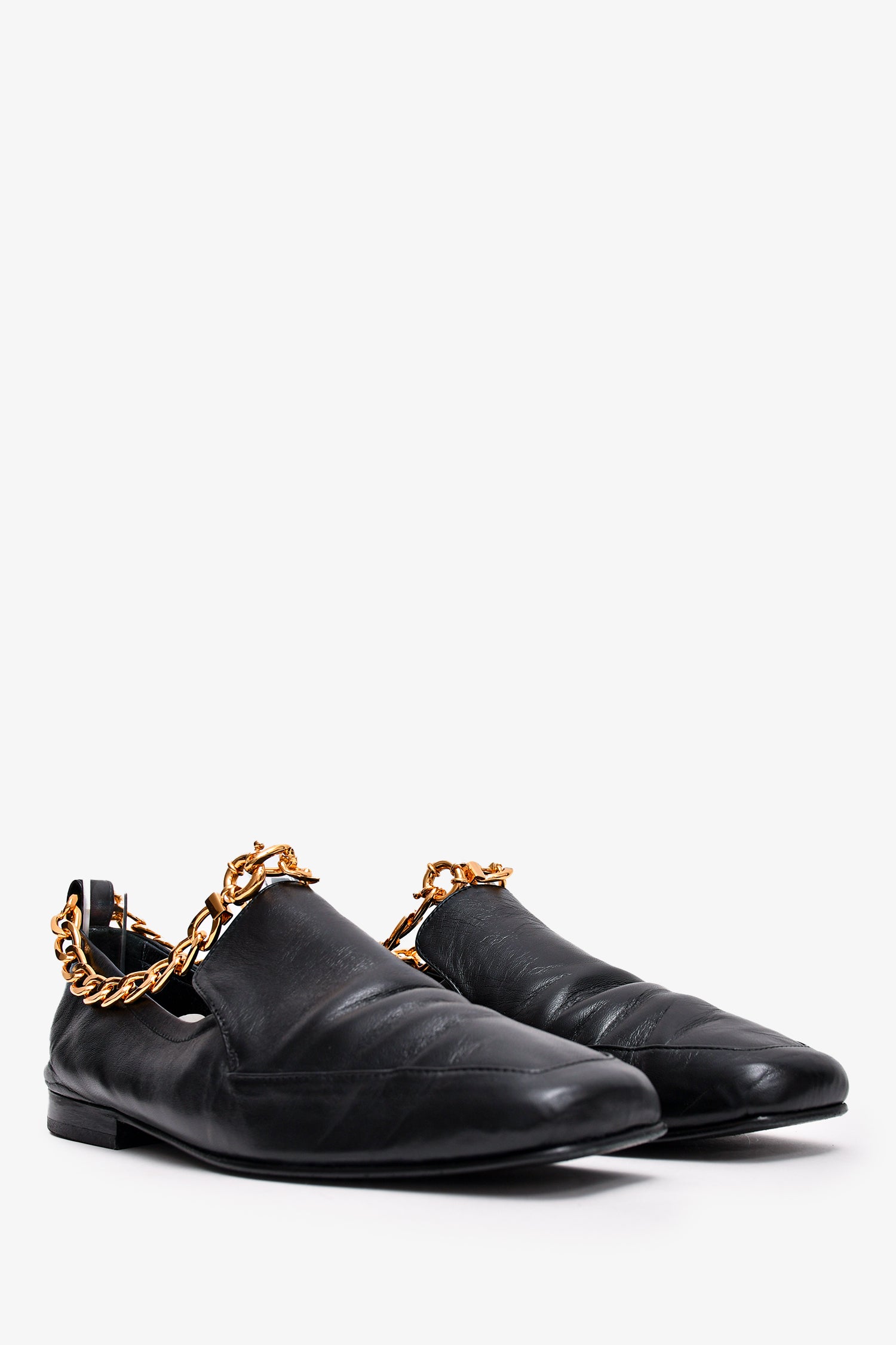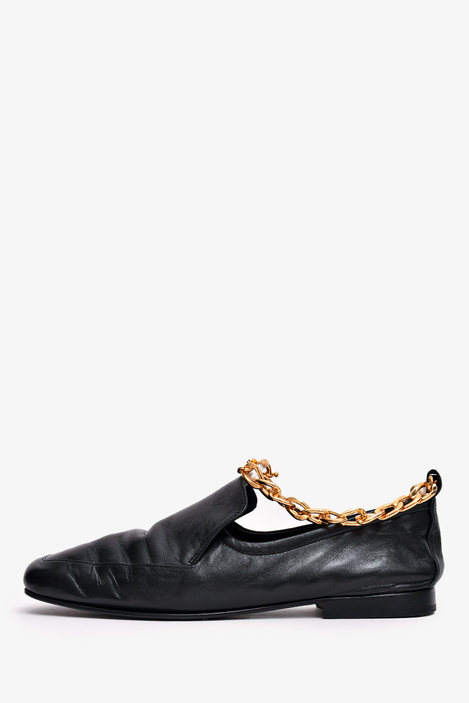 Refresh availabilityBy Far Black Leather Gold Chain Loafers. Slip on with ankle chain strap. Tonal stitching.