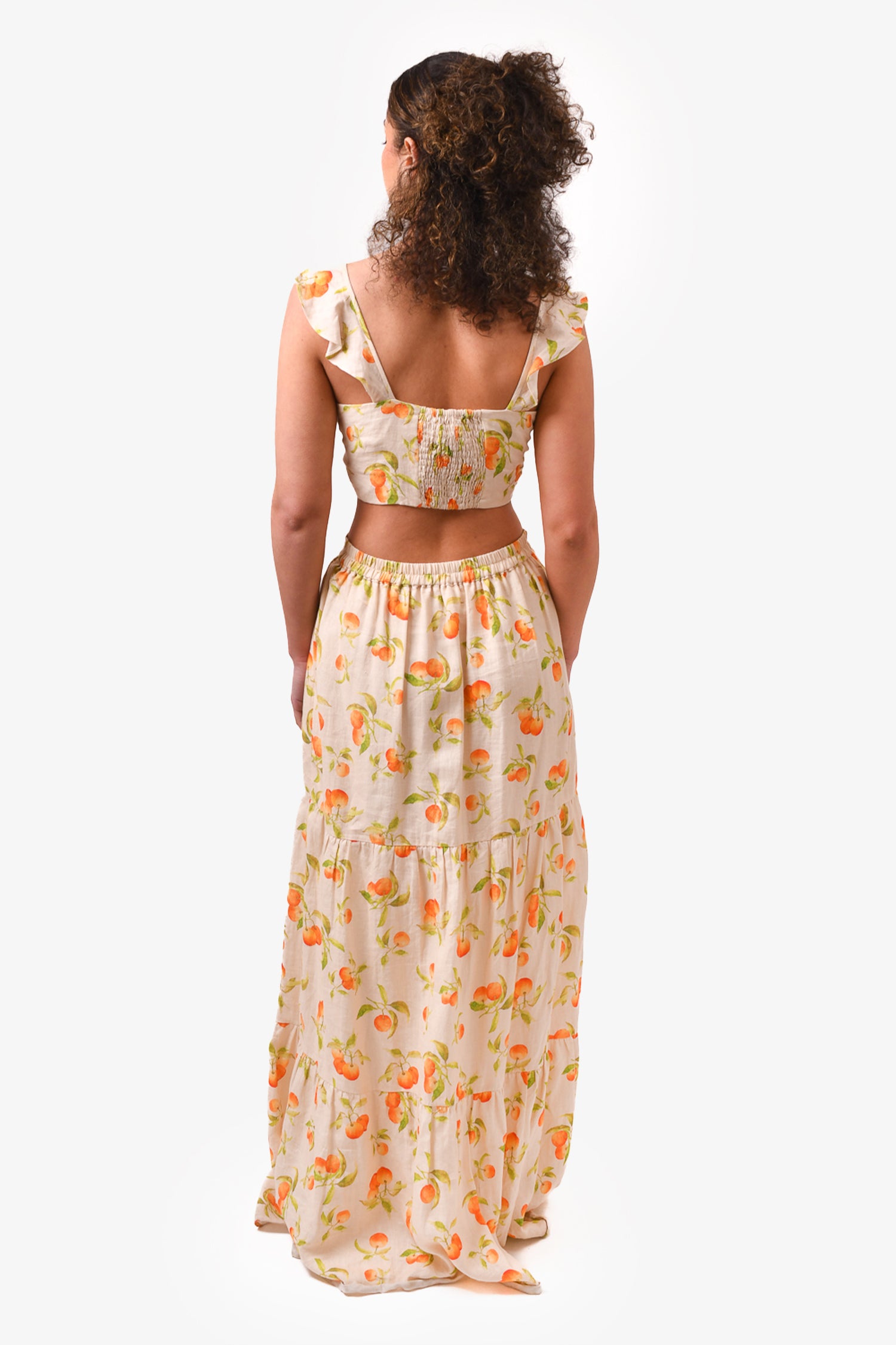 Refresh availabilityCami NYC Beige/Orange Printed Maxi Skirt Top Set with Button Front Detail. Front tie closure. Elasticated backing on top and skirt. Lined. Tonal stitching.