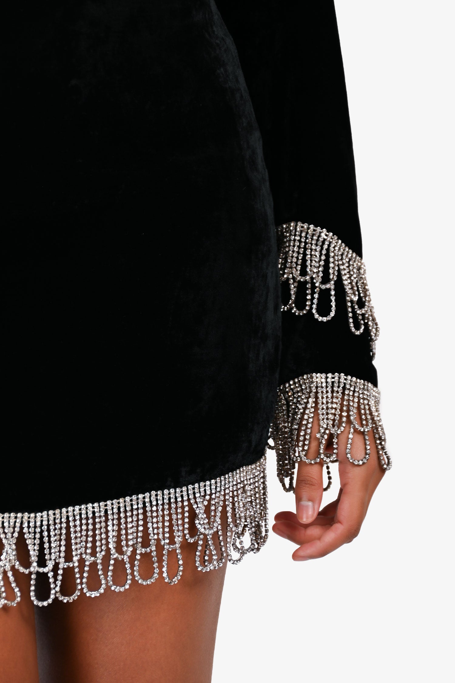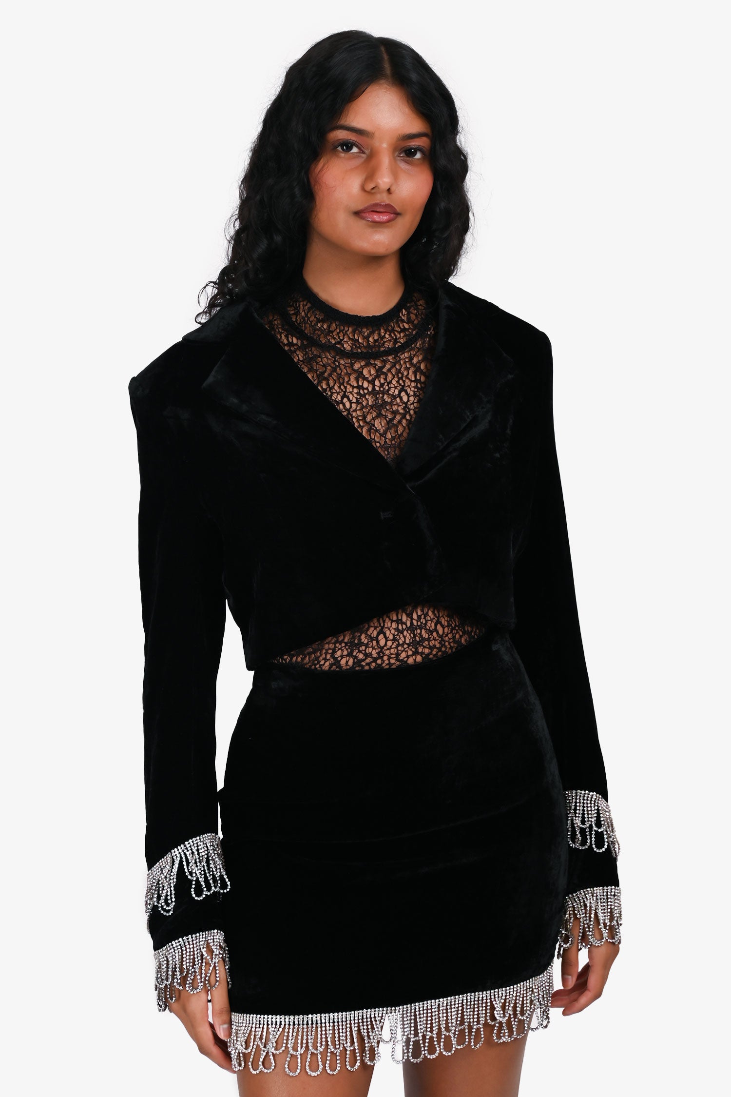 Camila Coelho Black Velvet Crystal Cuffed Cropped Jacket + Skirt Set Size XS