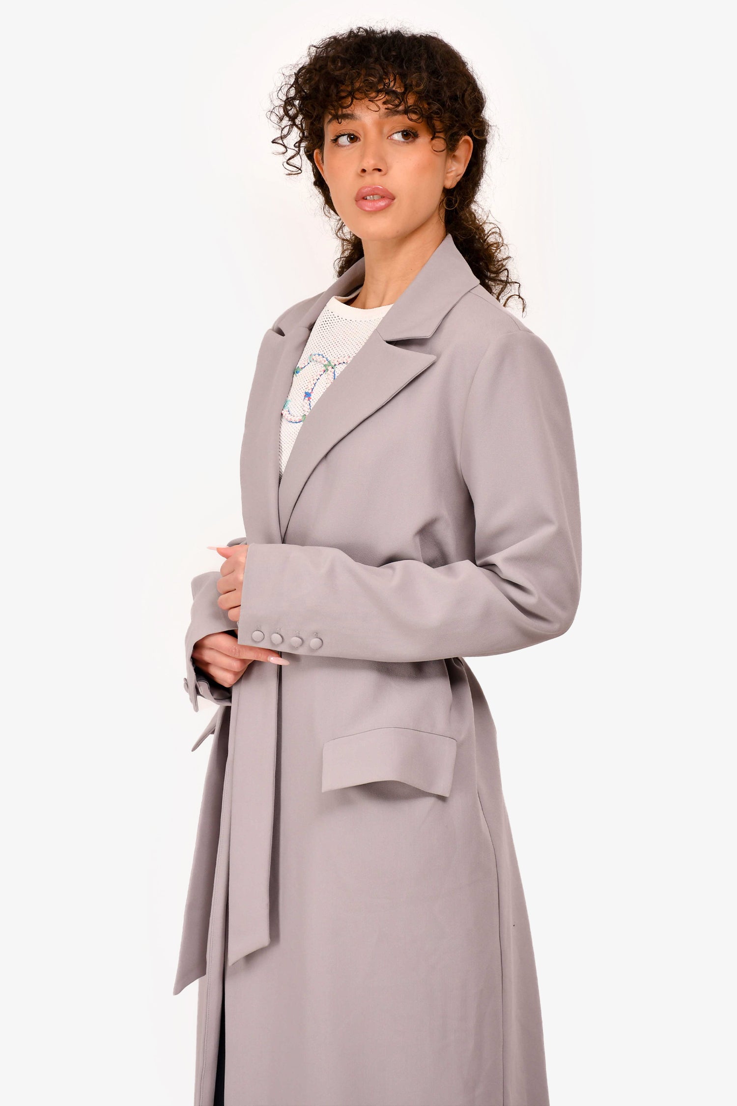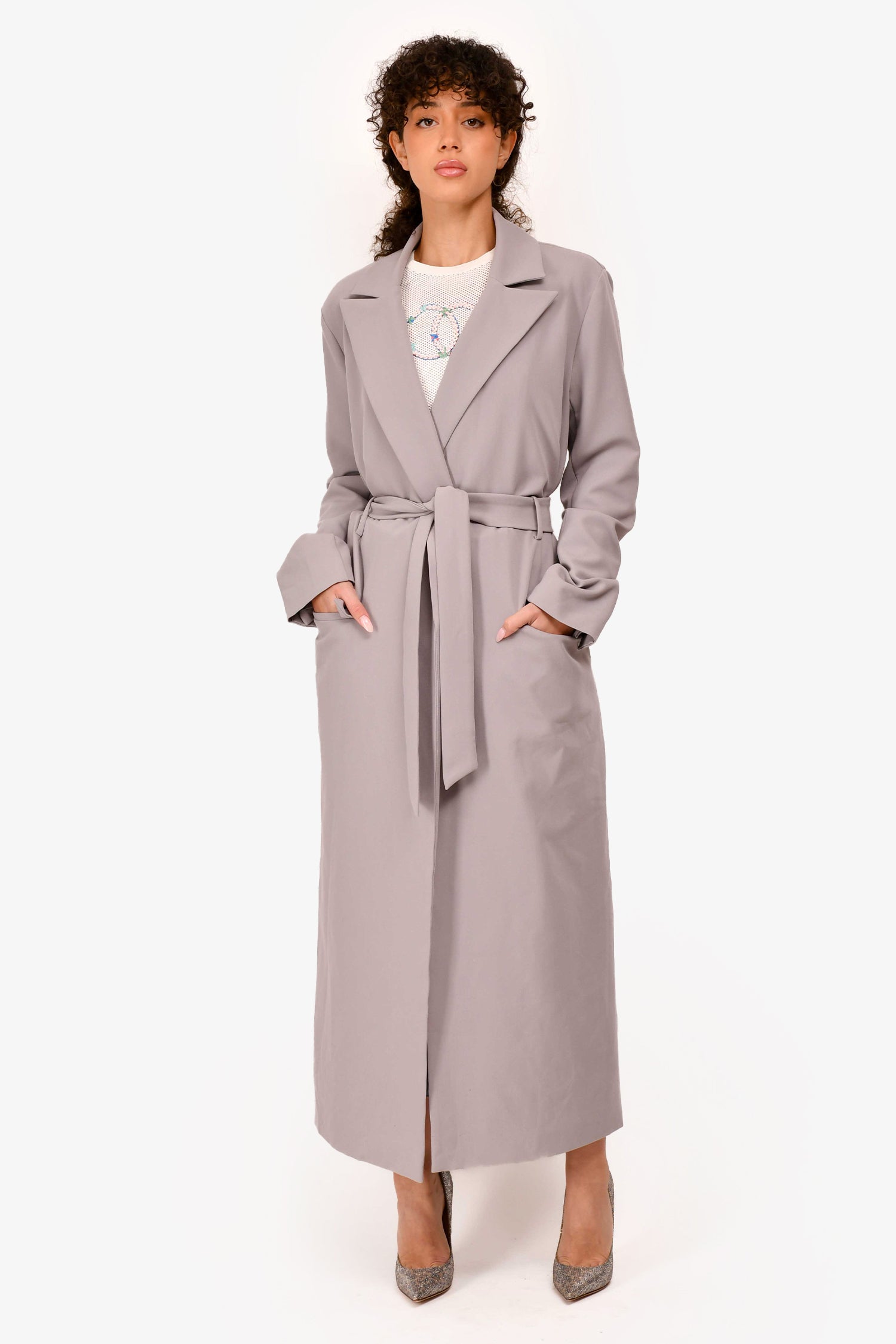Refresh availabilityCamila Coelho Grey Belted Light Trenchcoat. Lined interior. Tonal waist-belt. Side pockets with flap closures. Tonal stitching.