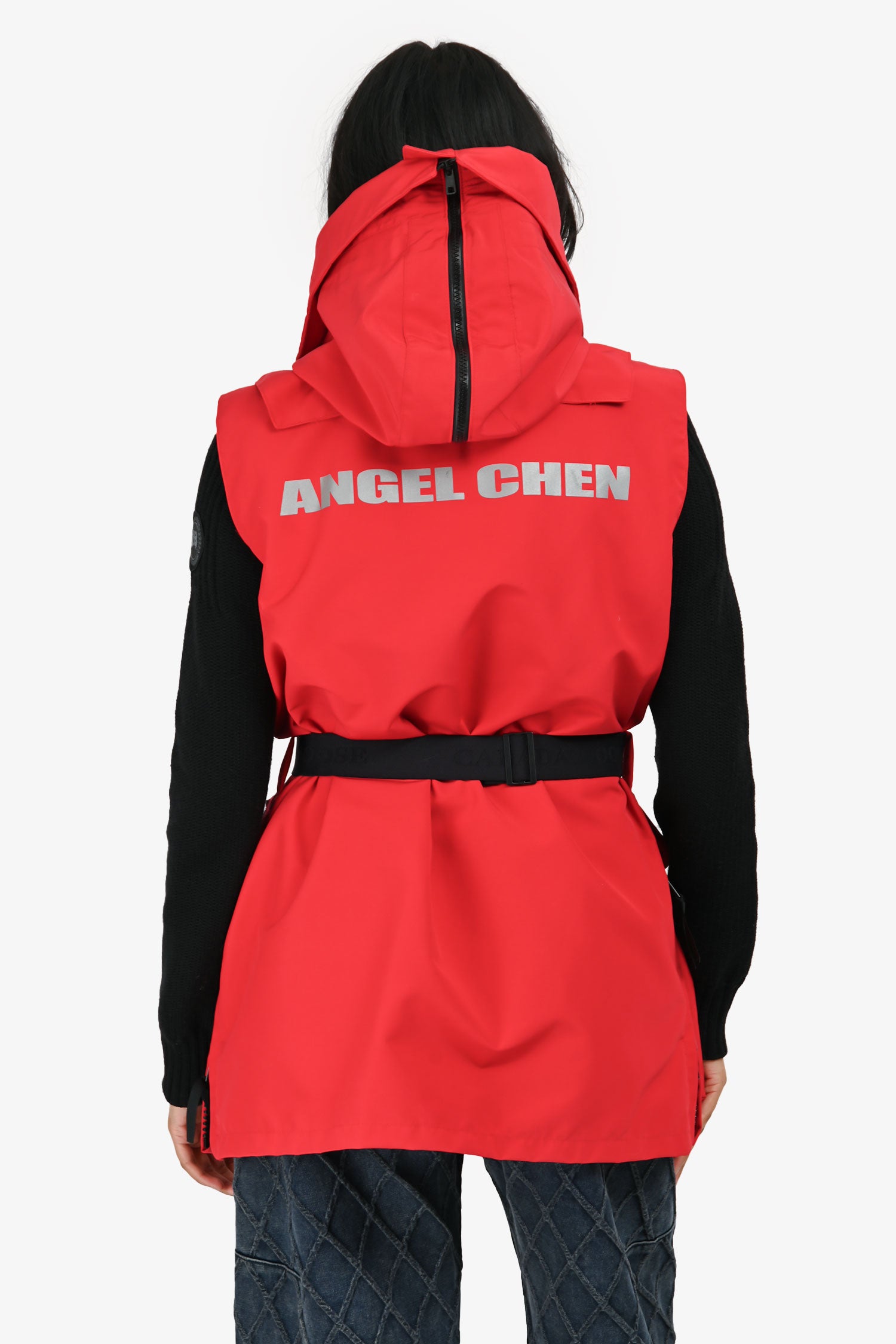 Refresh availabilityCanada Goose Angel Chen Red Edition Chaka Vest. Slip-on. Front 2-way zip and snap placket closure. Stand collar with removable hood and front snap closure. 2 exterior chest pockets with velcro flaps; 2 exterior flap pockets with snap closures; 2 exterior slip pockets; 1 interior zip pocket. Adjustable and removable waist belt. Side seam zipper details. Tonal stitching.