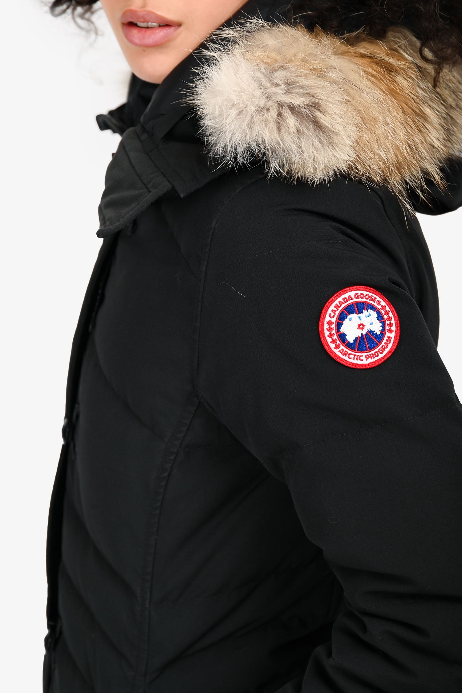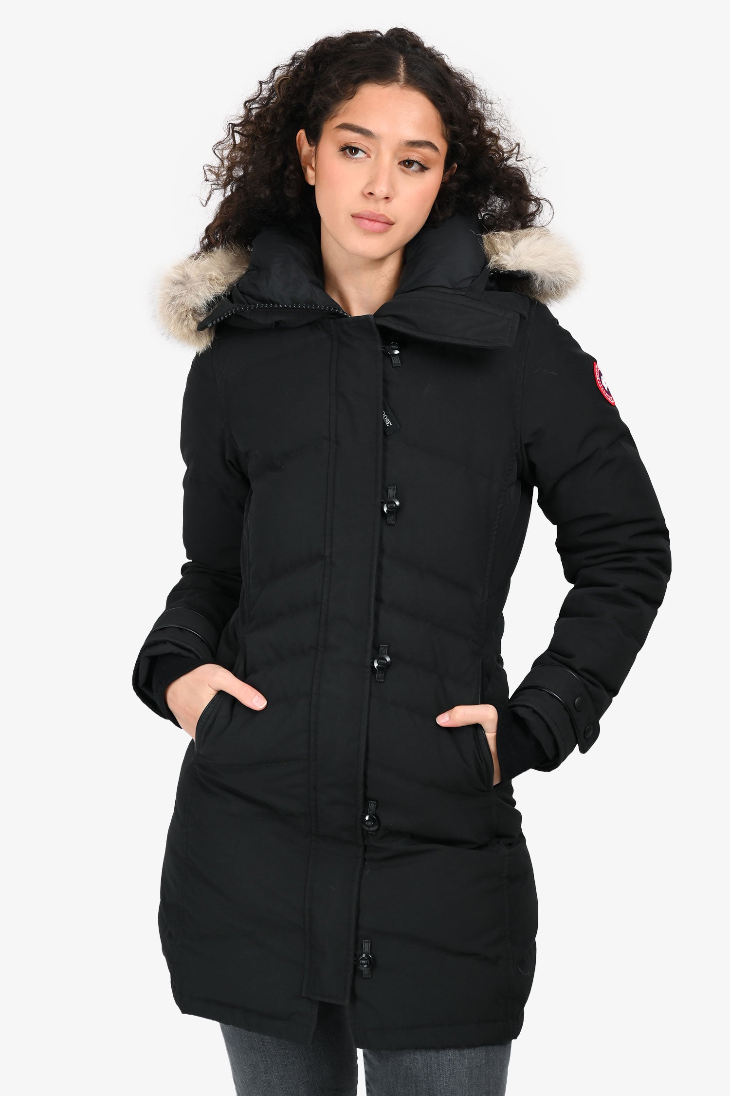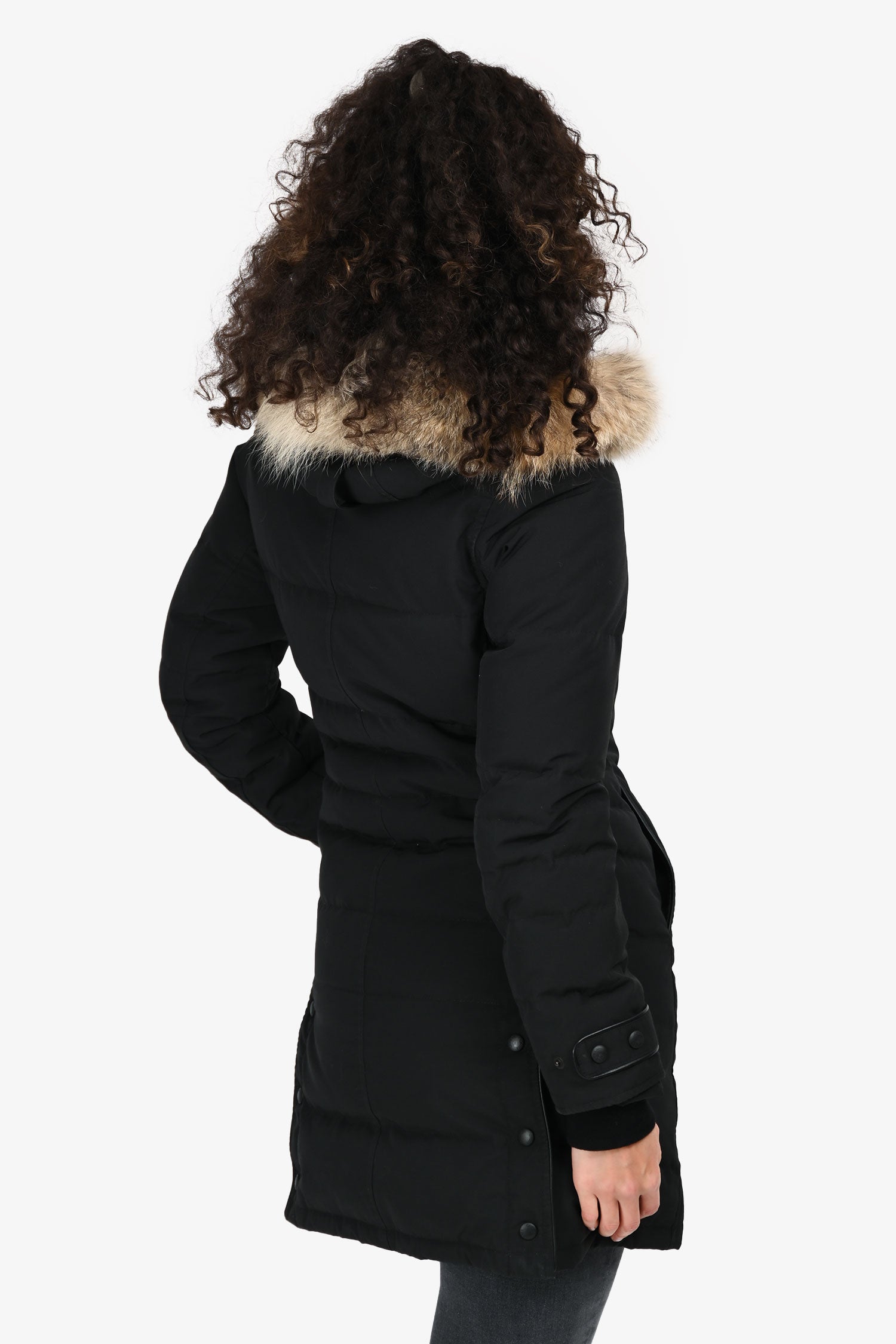 Refresh availabilityCanada Goose Black Down/Coyote Fur Trimmed Midi Jacket. Slip-on. Hooded neckline with removable fur trim. Front 2-way zip with button loop closure. Cuffs with a strap and snap closure. Ribbed interior cuff. 2 exterior slip pockets; 1 interior slip pocket; 1 interior zip pocket. Snap button closures at the hem. Tonal stitching.
