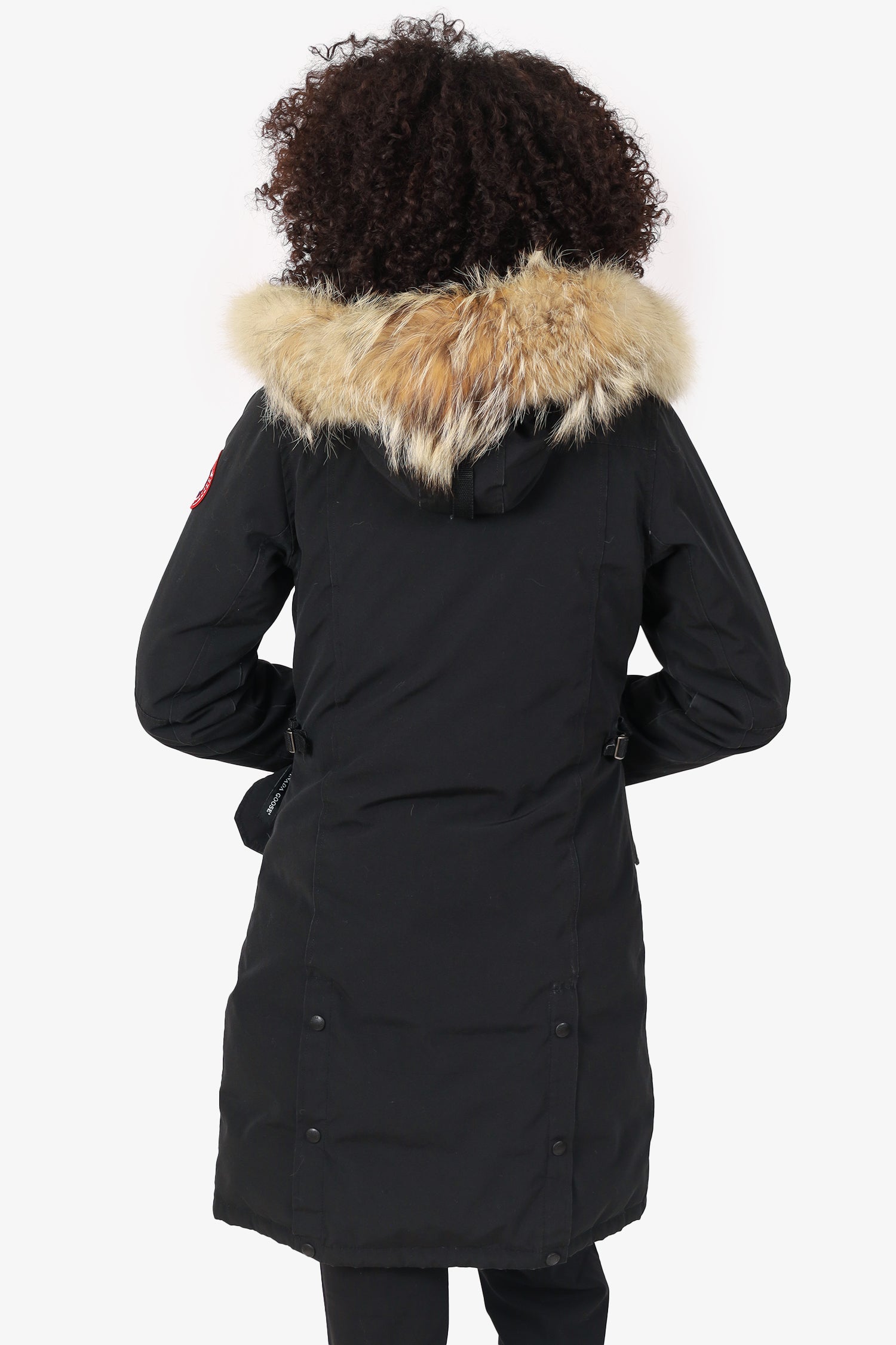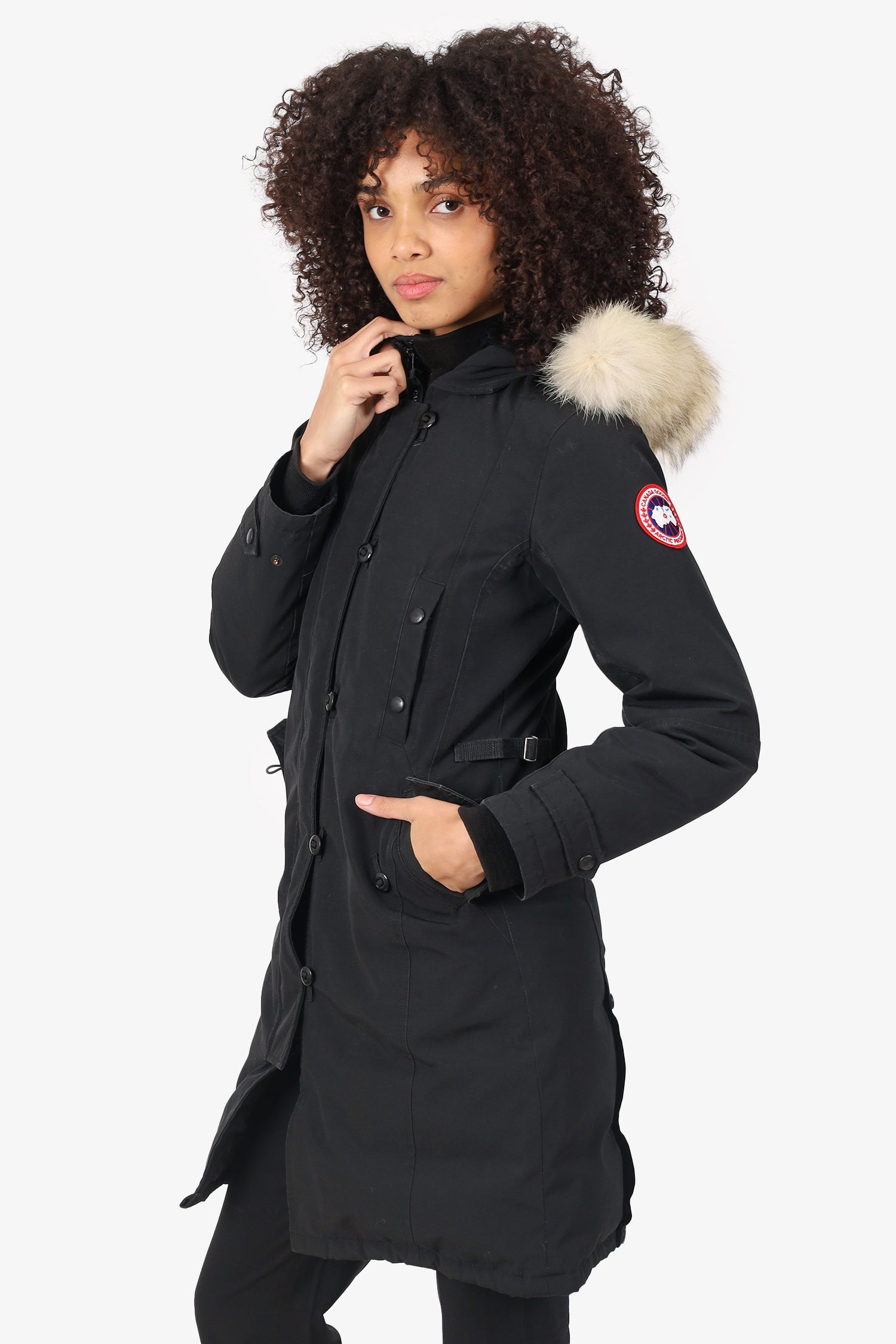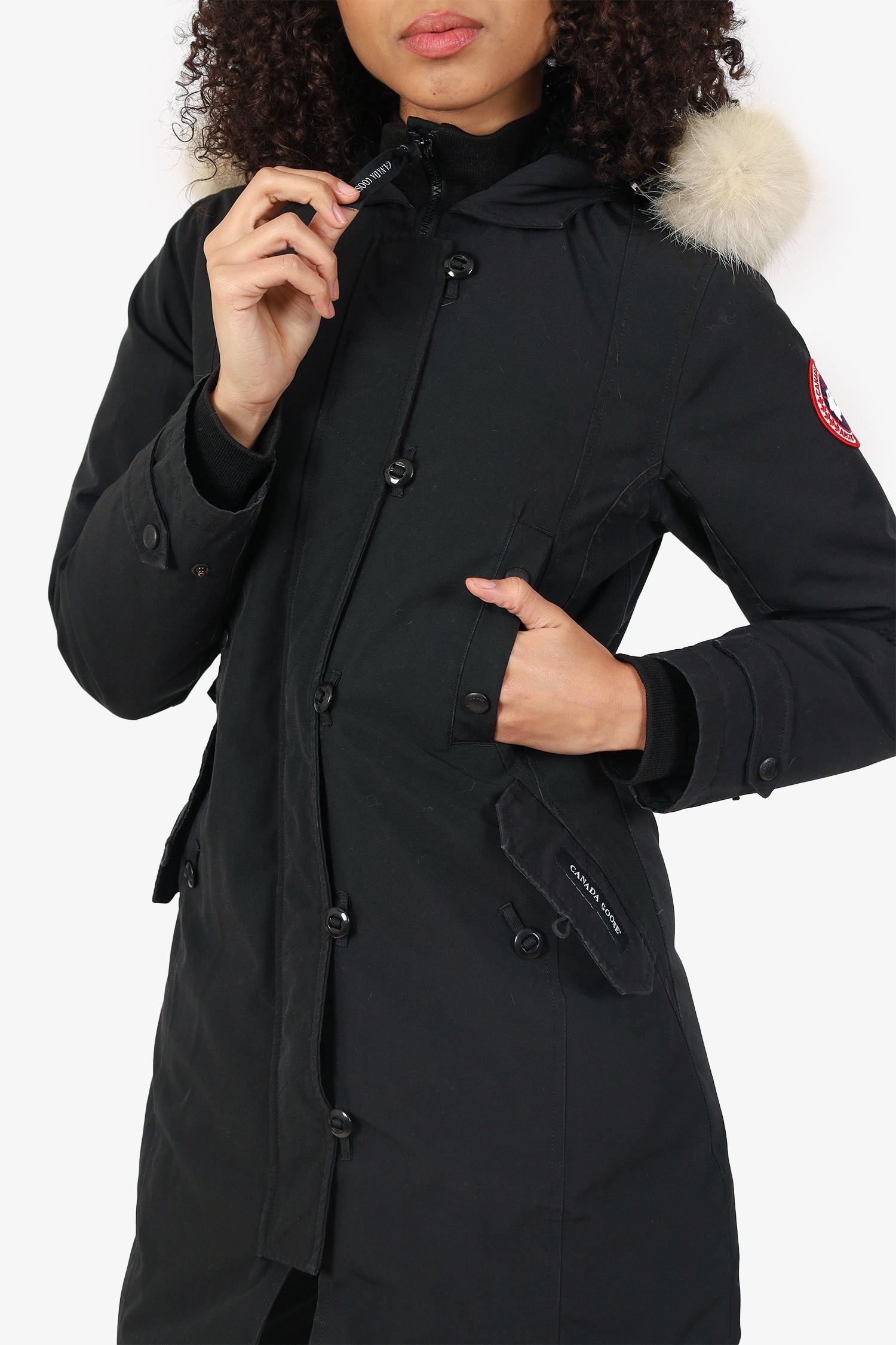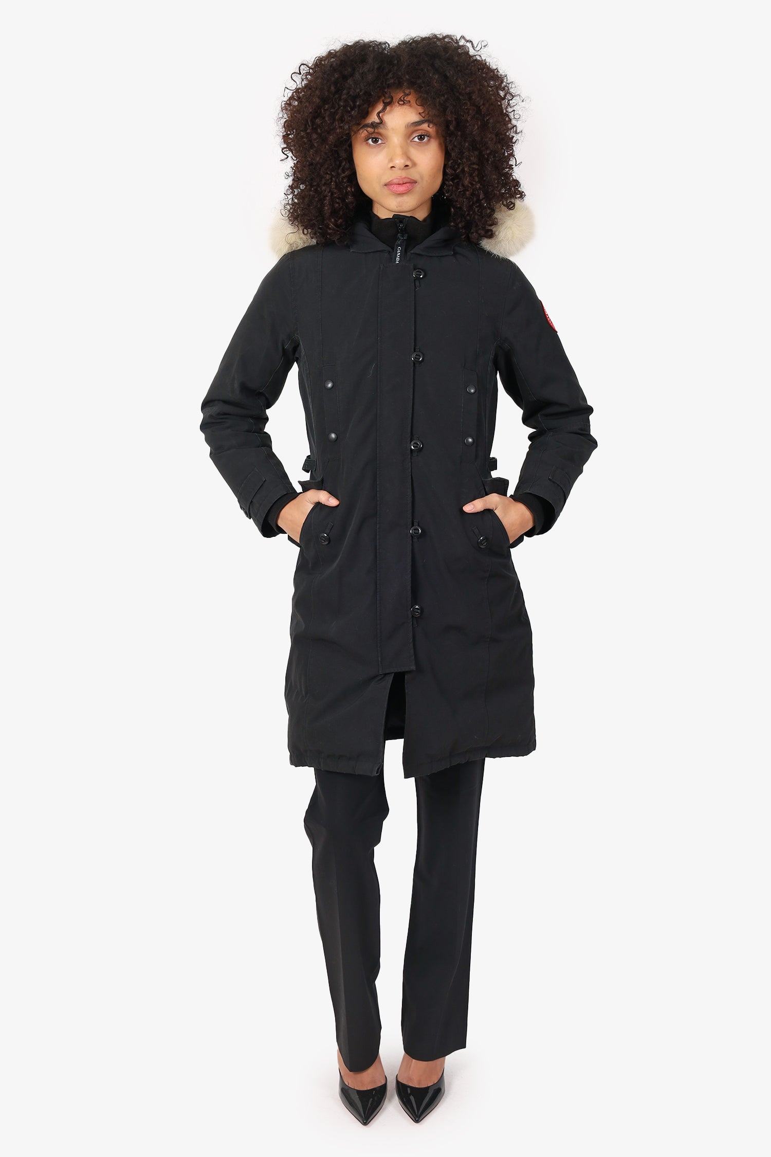 Refresh availabilityCanada Goose Black Fur Hood Kensington Parka. Pull-on. High neckline. Front zip and button-up closures. Hood with removable zip-off fur. Adjustable pull tabs to waist. 4 exterior button-up pockets; 2 chest, and 2 side. Snap buttons to sleeve cuffs and rear. Lined interior. Gunmetal-tone hardware. Tonal stitching.