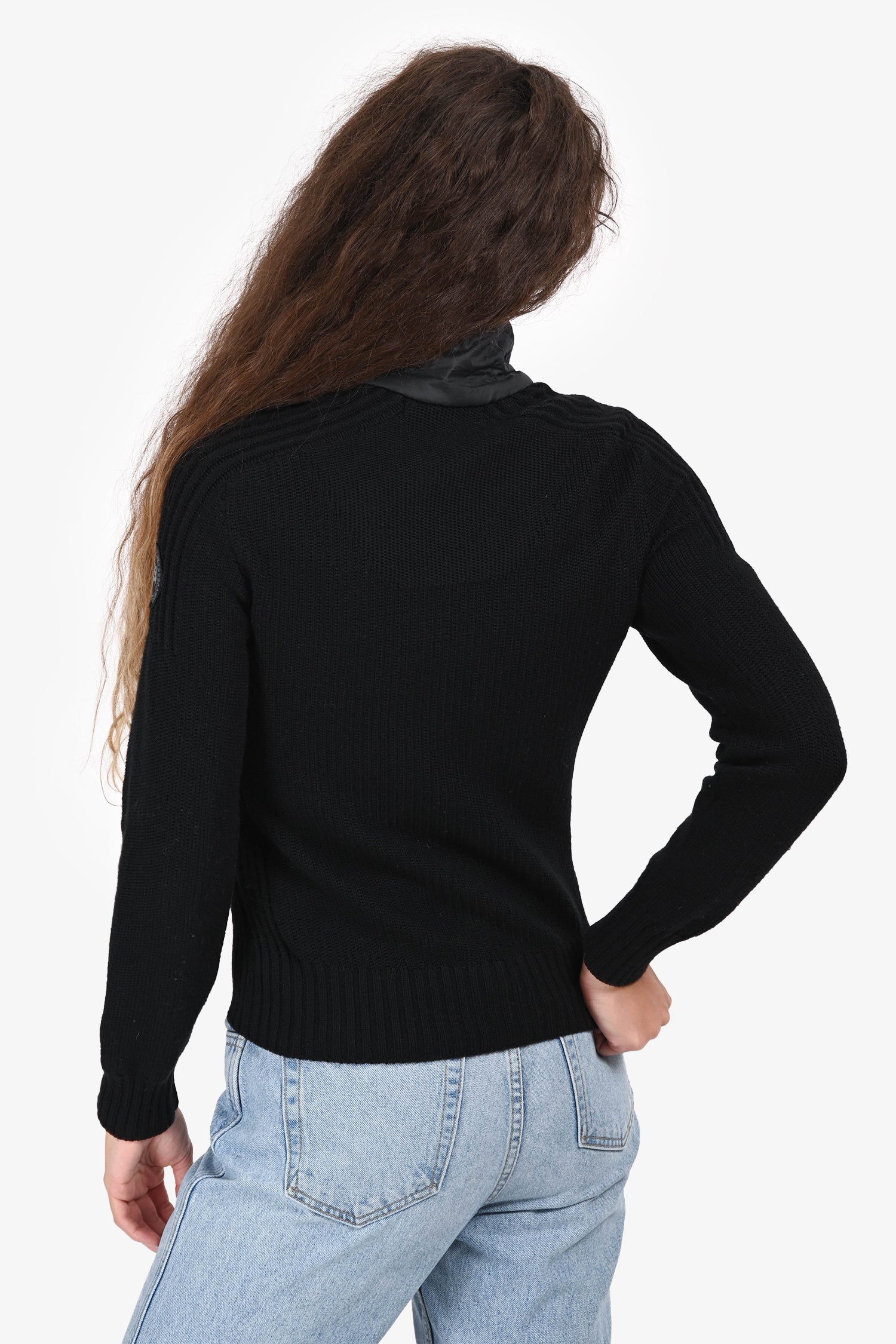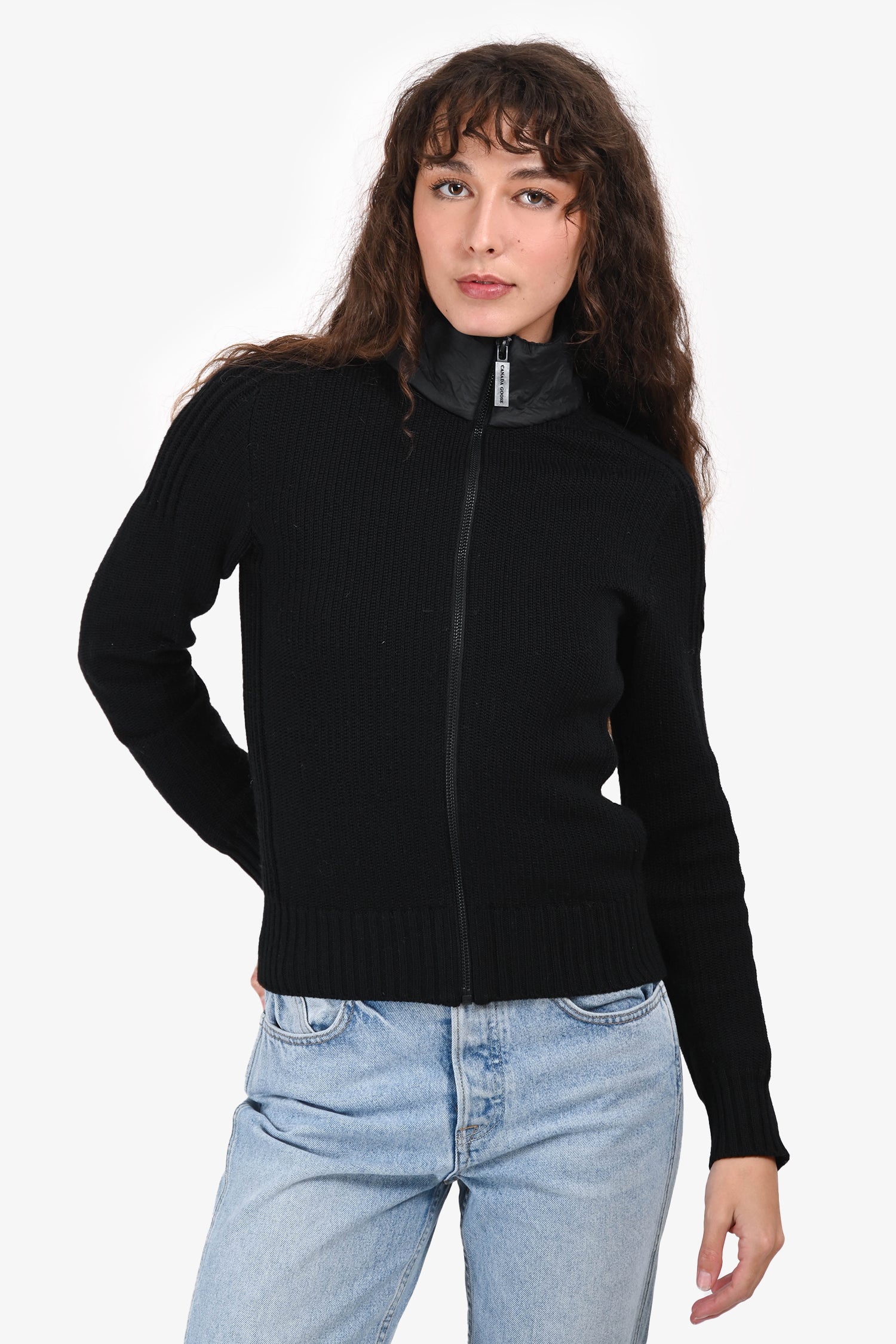 Refresh availabilityCanada Goose Black Wool Zip-Up Cardigan. Slip-on. Front zip closure. Raised collar. Brand logo patch on the left sleeve. Ribbed cuffs and hem. Tonal stitching.