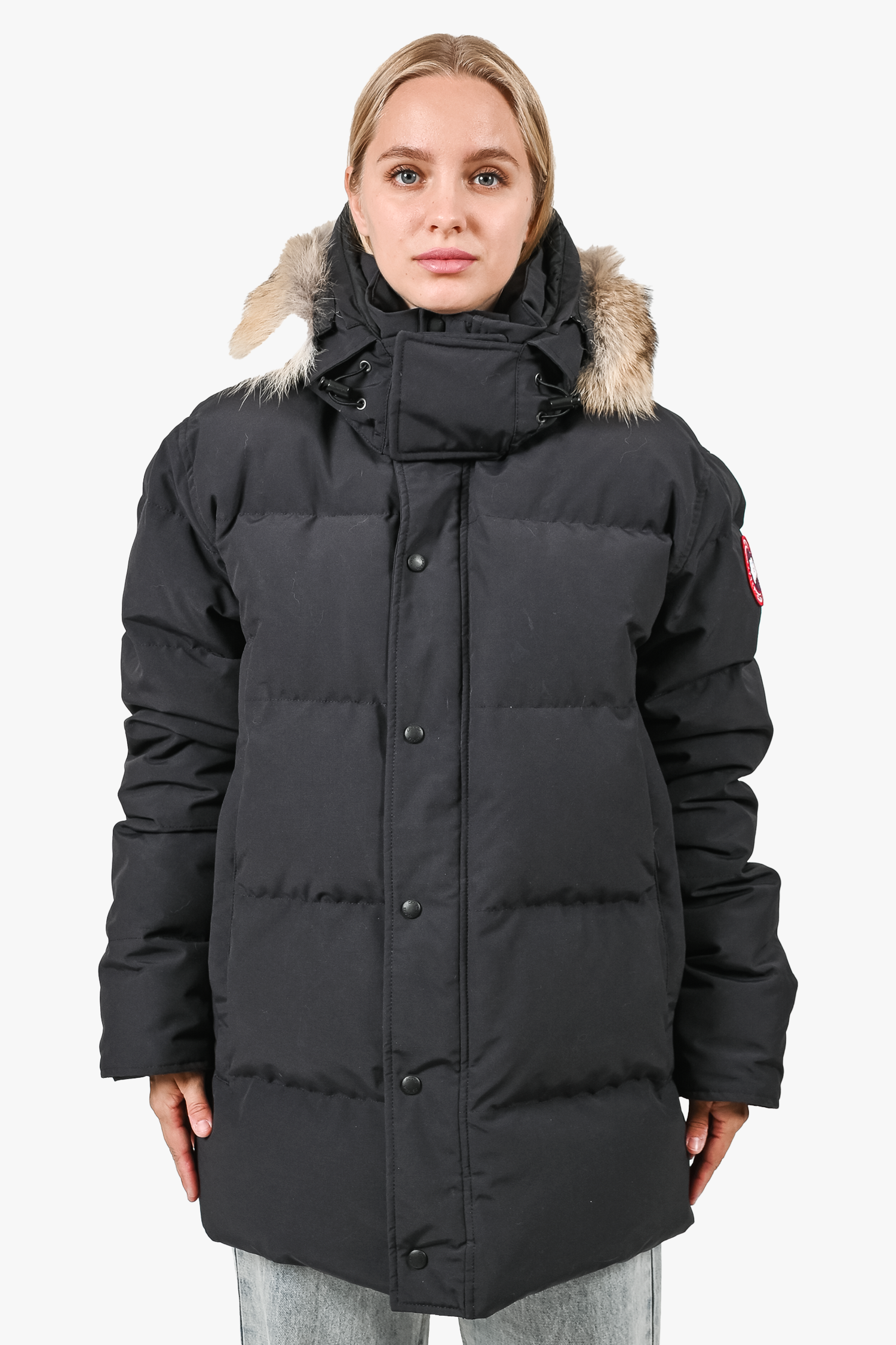 Refresh availabilityCanada Goose Black 'Wyndham' Parka. Front two-way zip and snap button-up closure. Front pockets. Removable fur trim on the hood. Tonal stitching.