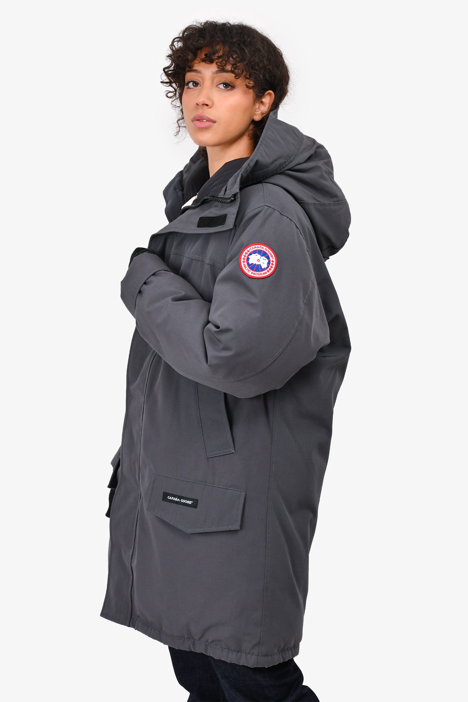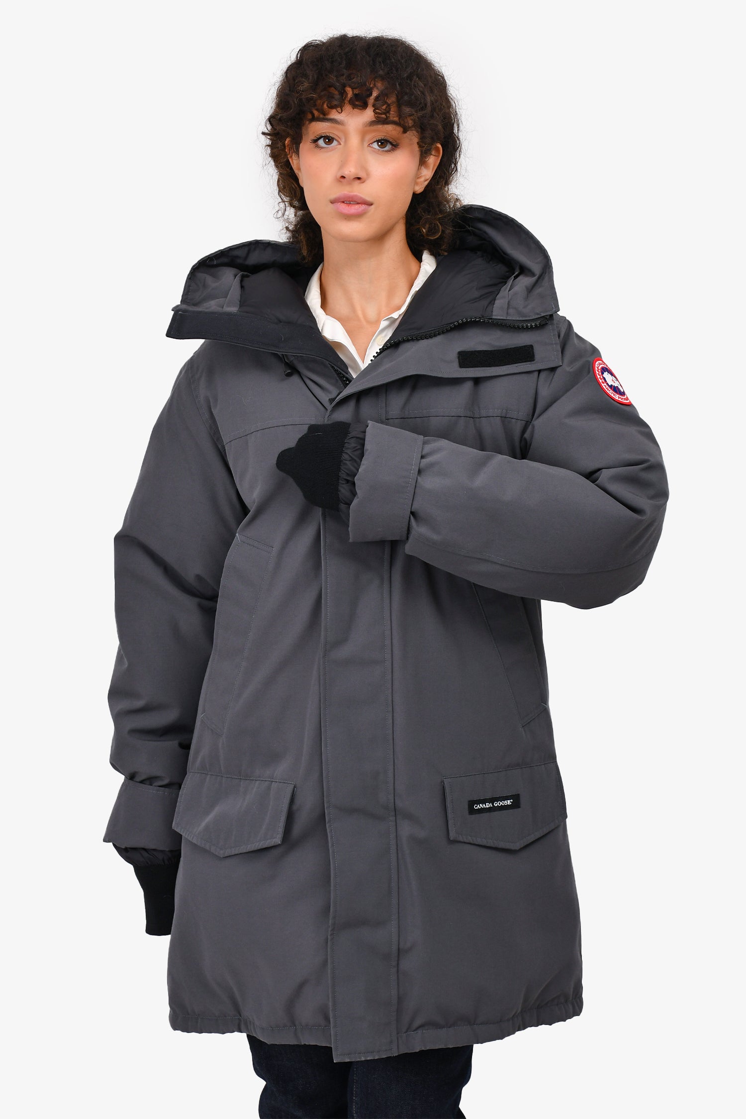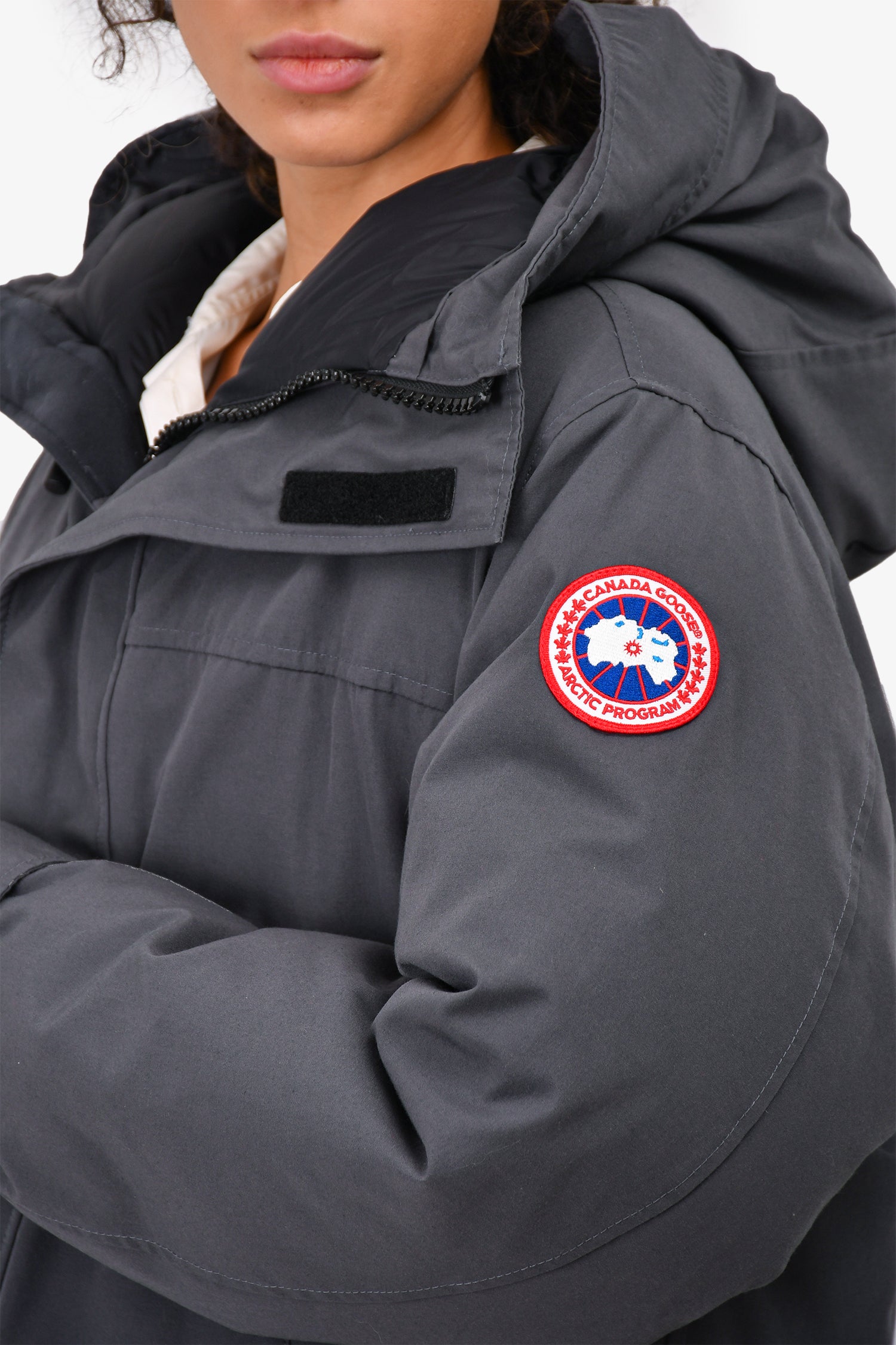 Refresh availabilityCanada Goose Graphite Grey Down Jacket. Lined and padded interior. Ribbed sleeve cuffs. Zipped front closure with velcro straps. Down filled. 4 front pockets. Tonal stitching.