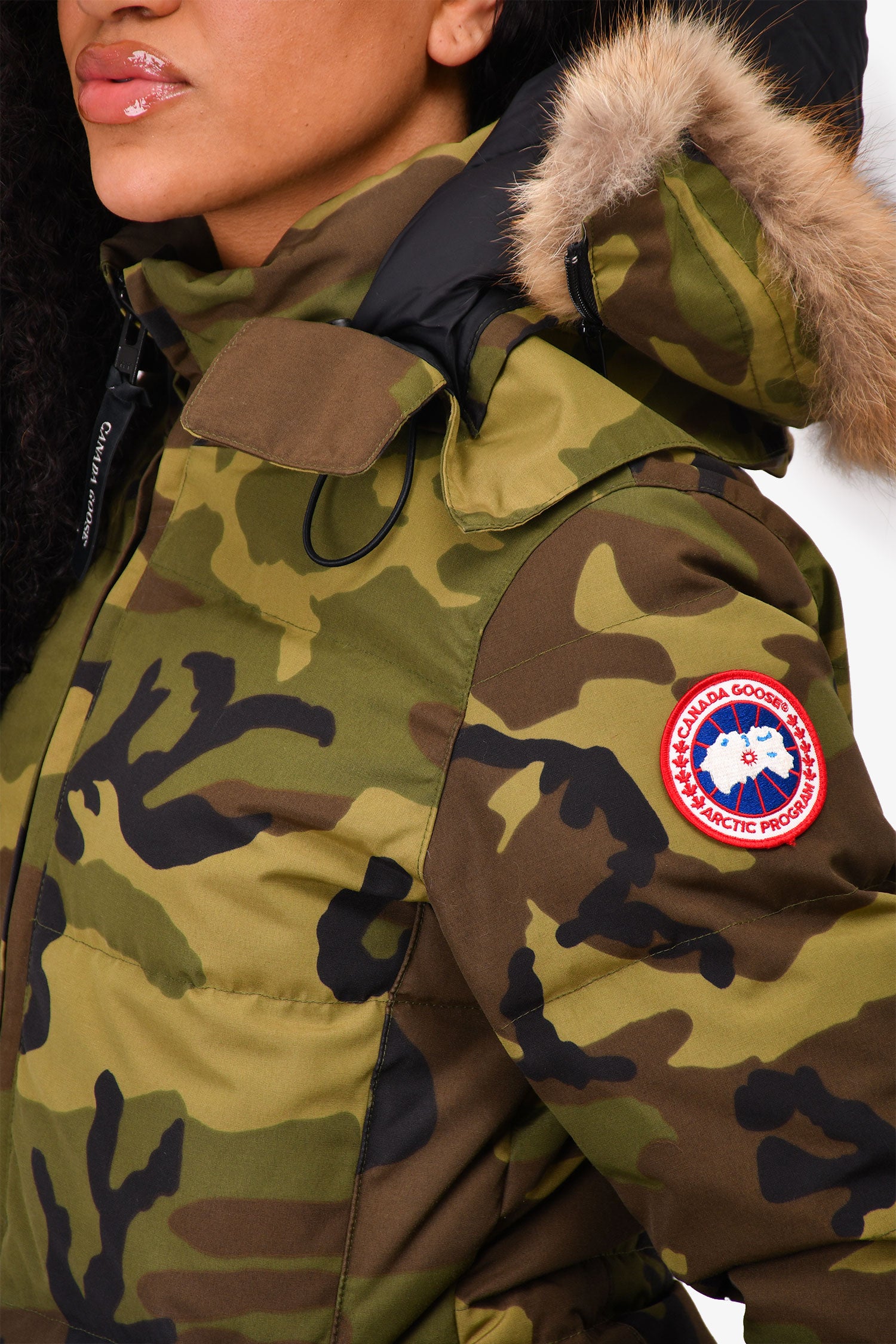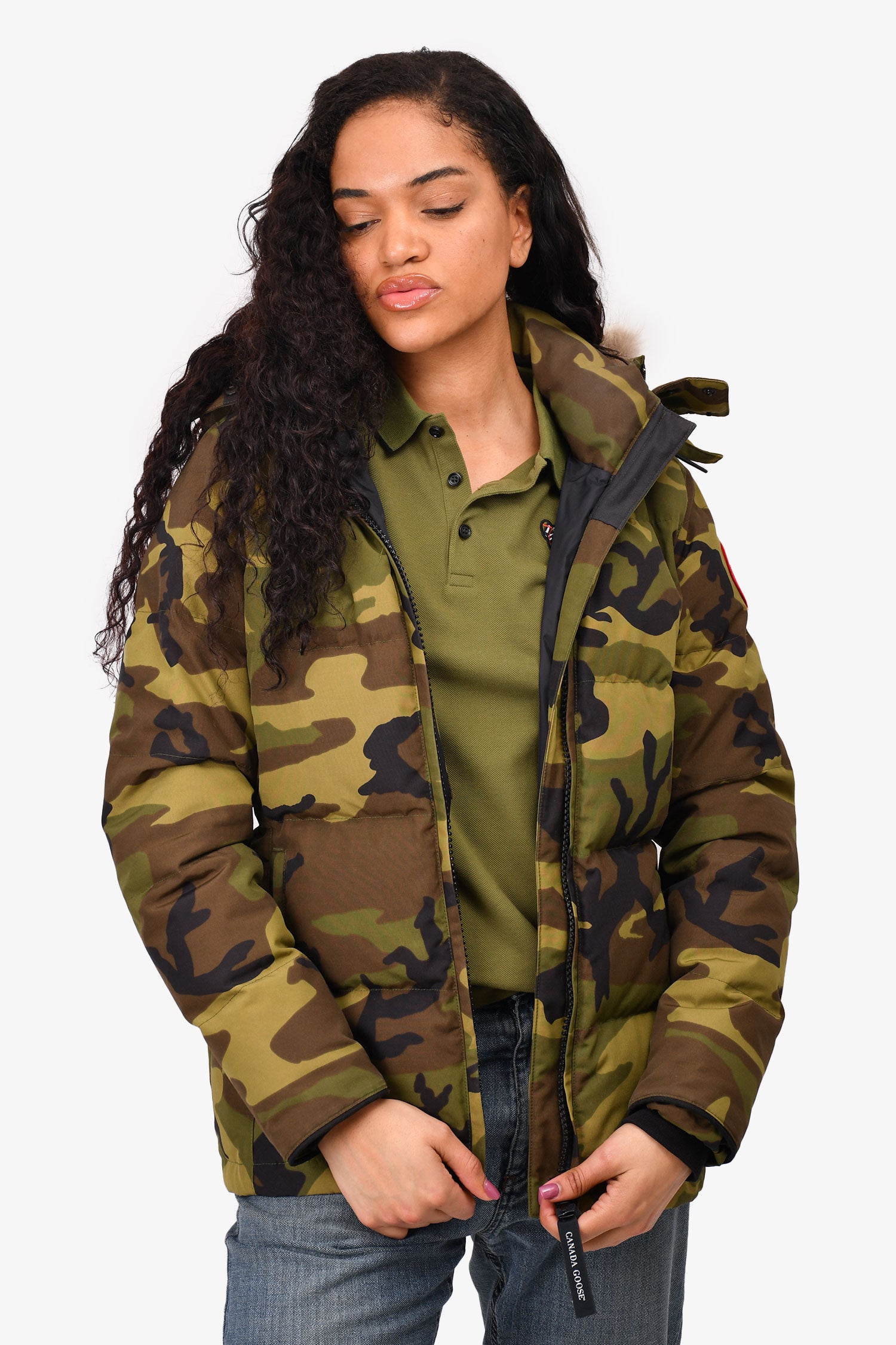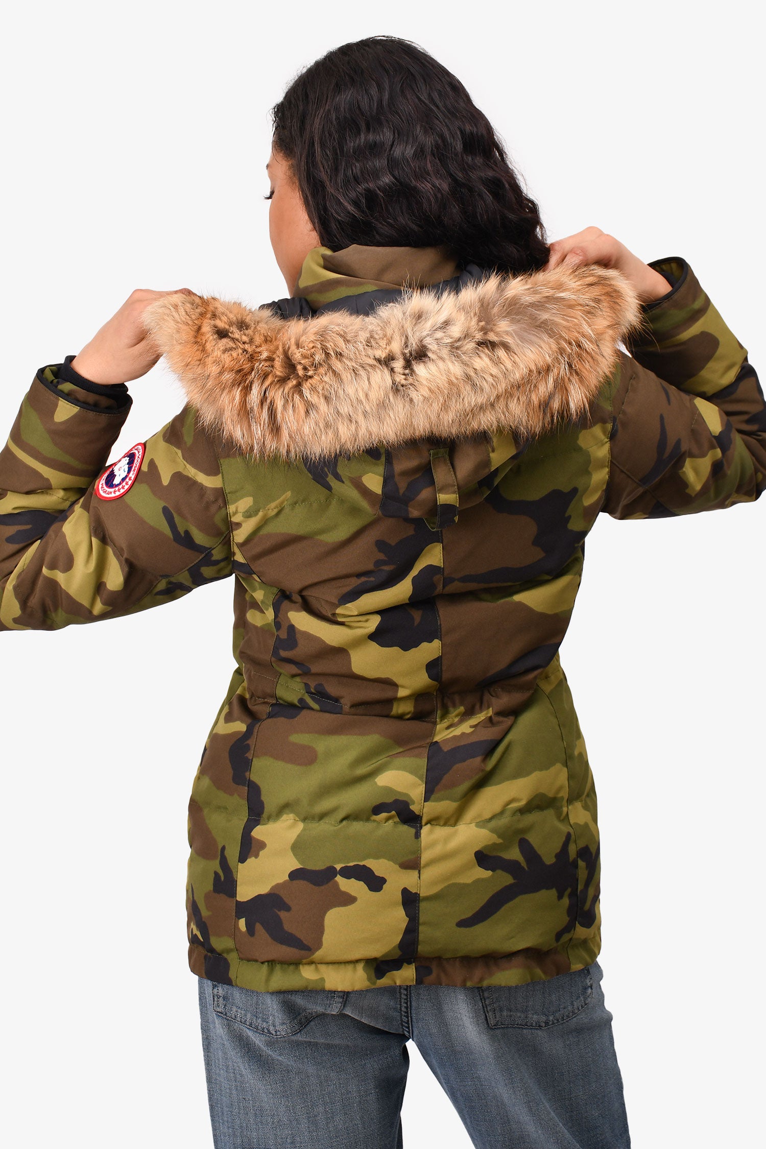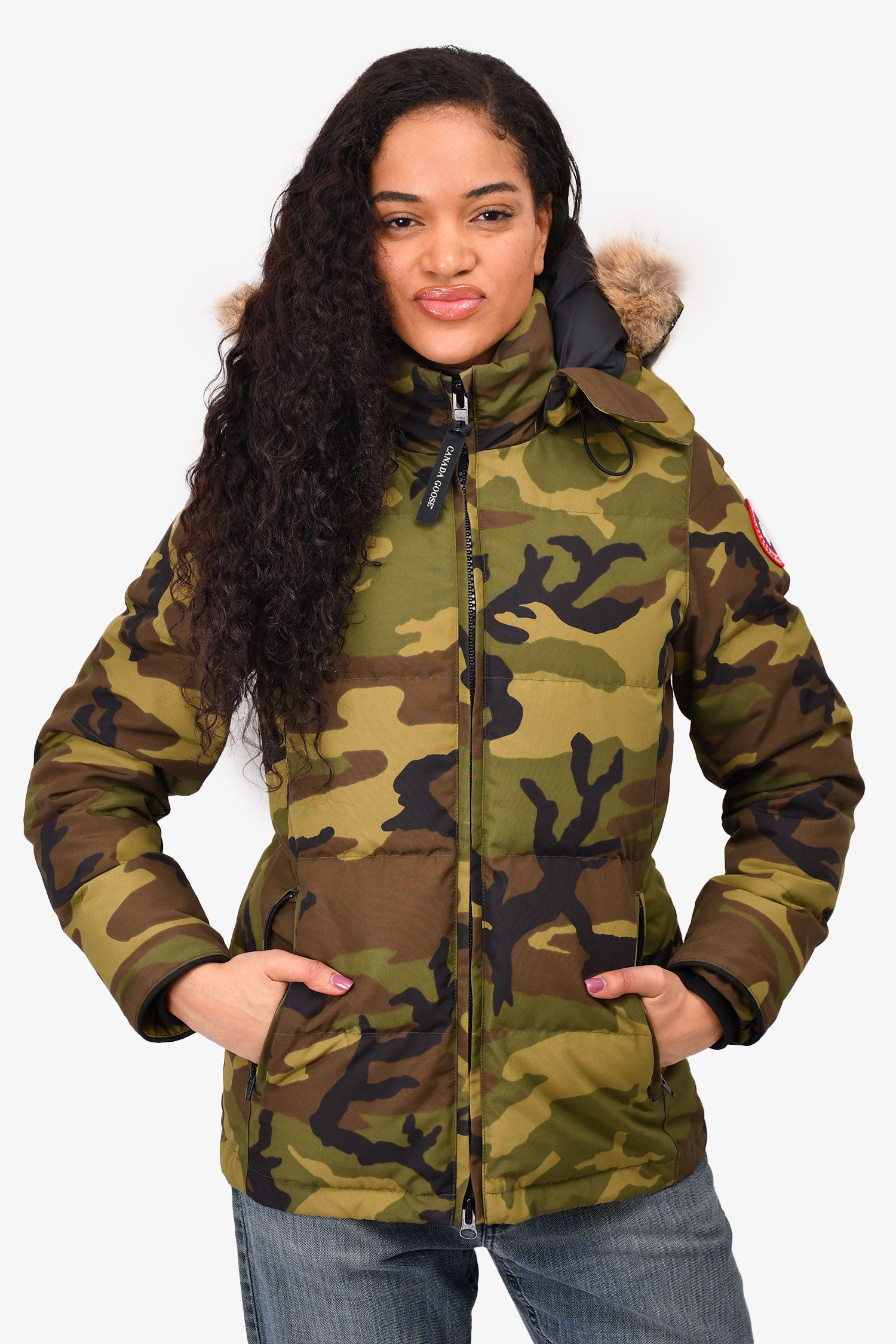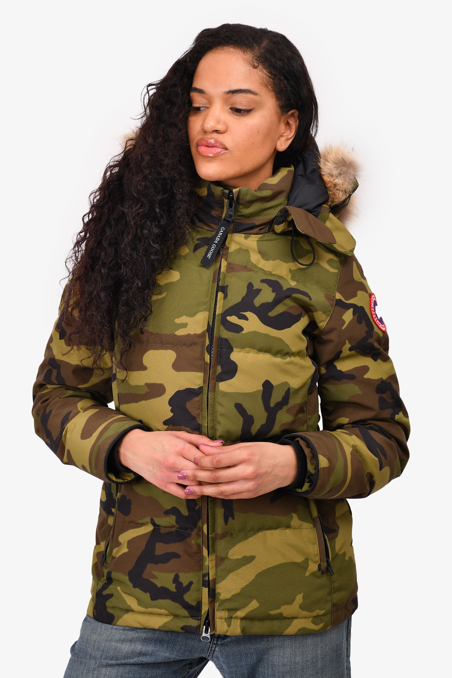 Refresh availabilityCanada Goose Green Camouflage Chelsea Down Parka Jacket. Front zipped closure with a pull tab. Nylon lining. Down filled. Zipped side pockets. Fur trimmed hood with elasticated pull tabs.