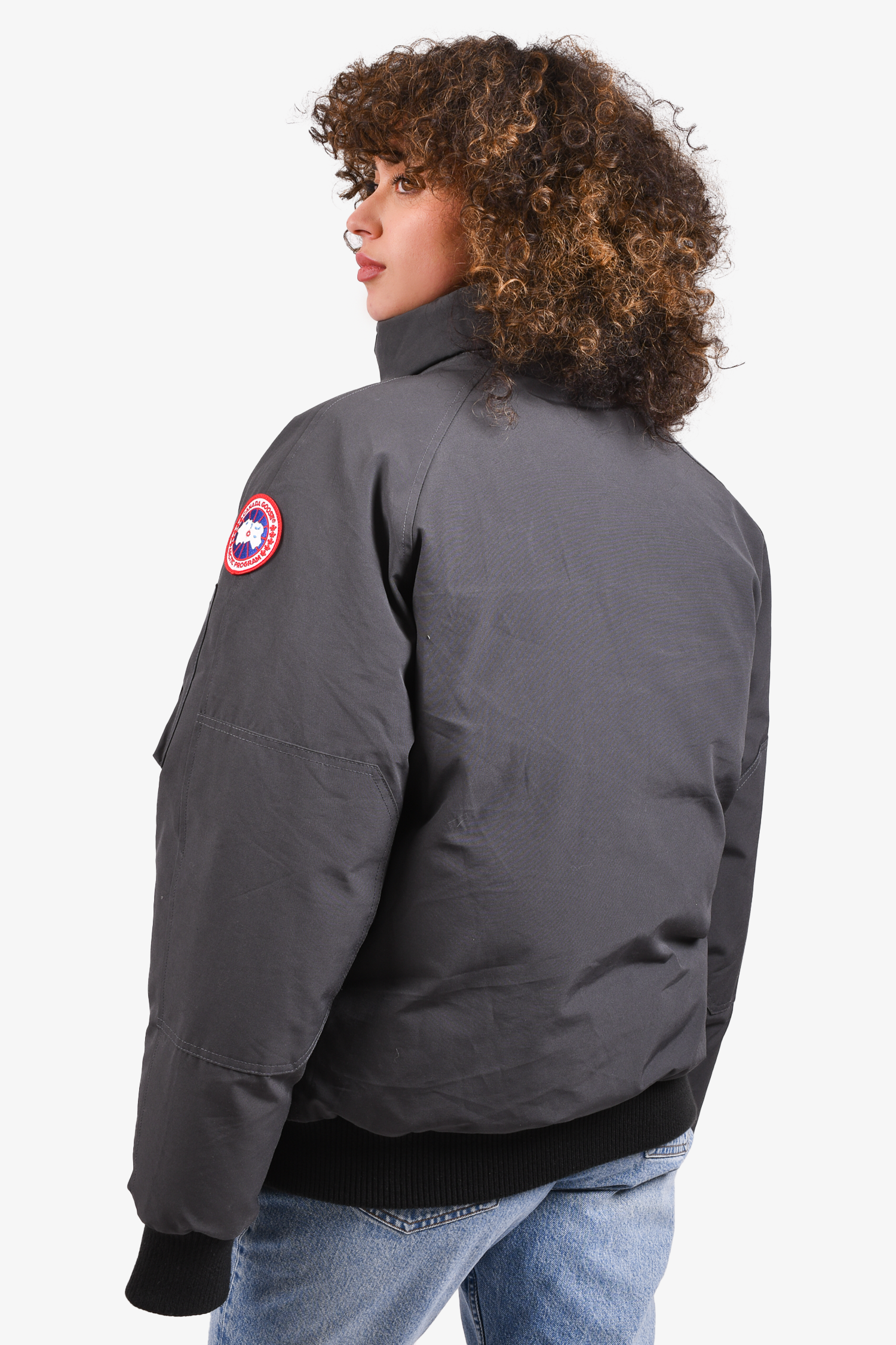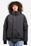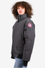 Canada Goose Grey Down Parka Jacket. Front two-way zip and snap button-up closure. Front pockets. Brand logo patch on the left sleeve. Ribbed cuffs and hem. Tonal stitching.