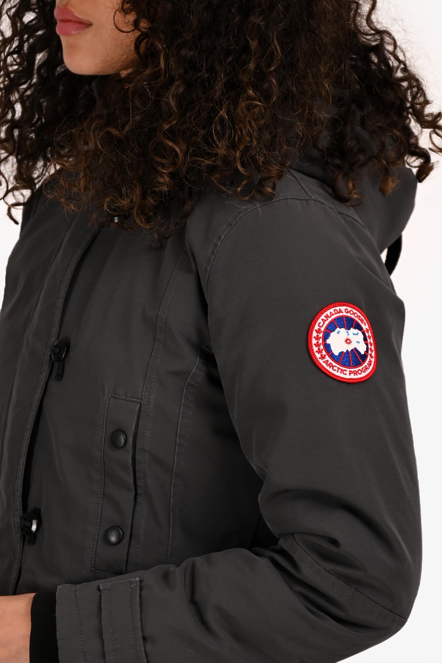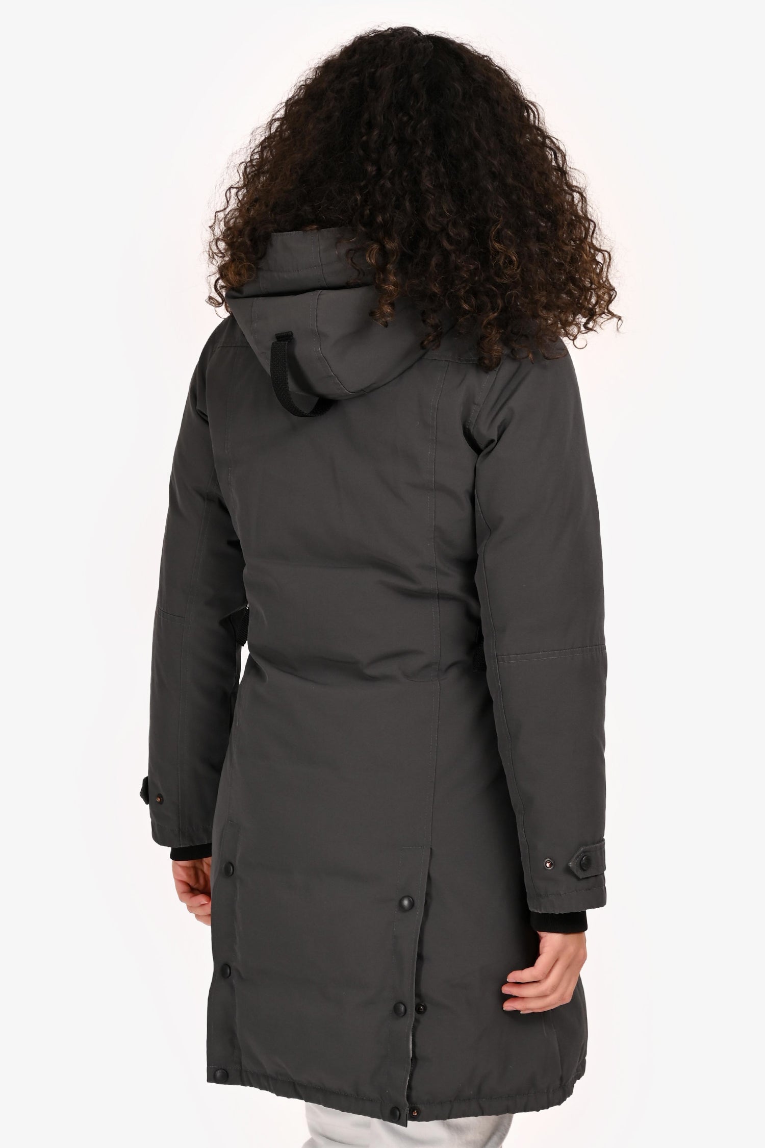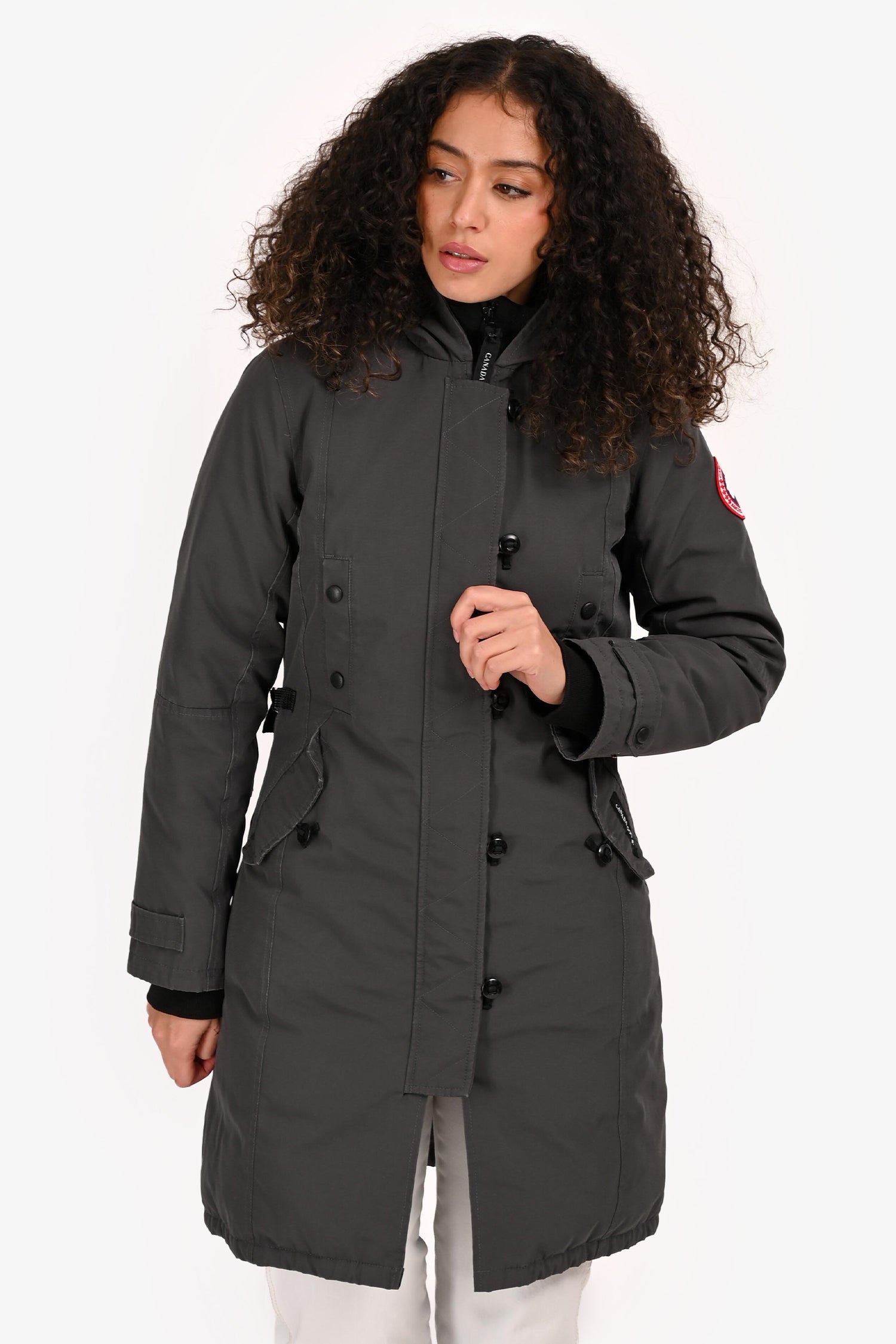 Refresh availabilityCanada Goose Grey Fur Hooded Down Parka Coat. Front zip and button closure. Attached hood with high-pile fleece lining. Adjustable waist tabs. 2 exterior flap pockets with button closures; 2 exterior pockets with snap closure; 1 interior pocket. Rib-knit collar and cuffs. Back vent with snap closure. Logo patch at sleeve. Tonal stitching.