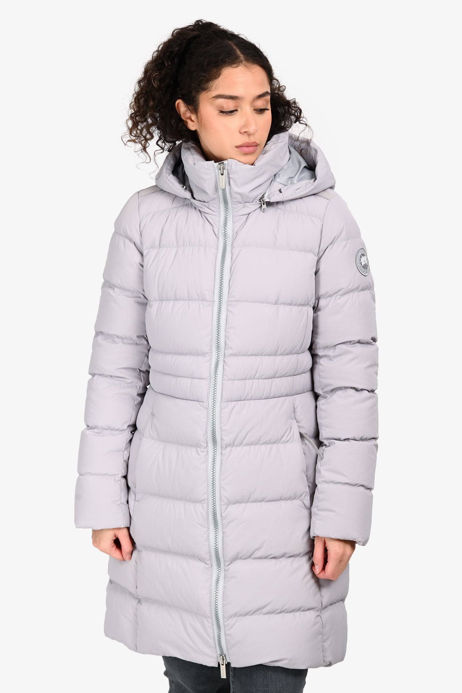 Refresh availabilityCanada Goose Grey Hooded Aurora Parka Down Coat. Slip-on. High neckline with removable hood. Front 2-way zip closure. Ribbed interior cuffs. 2 exterior zip pockets. Interior drawstring waistband. Silver-tone hardware. Tonal stitching.