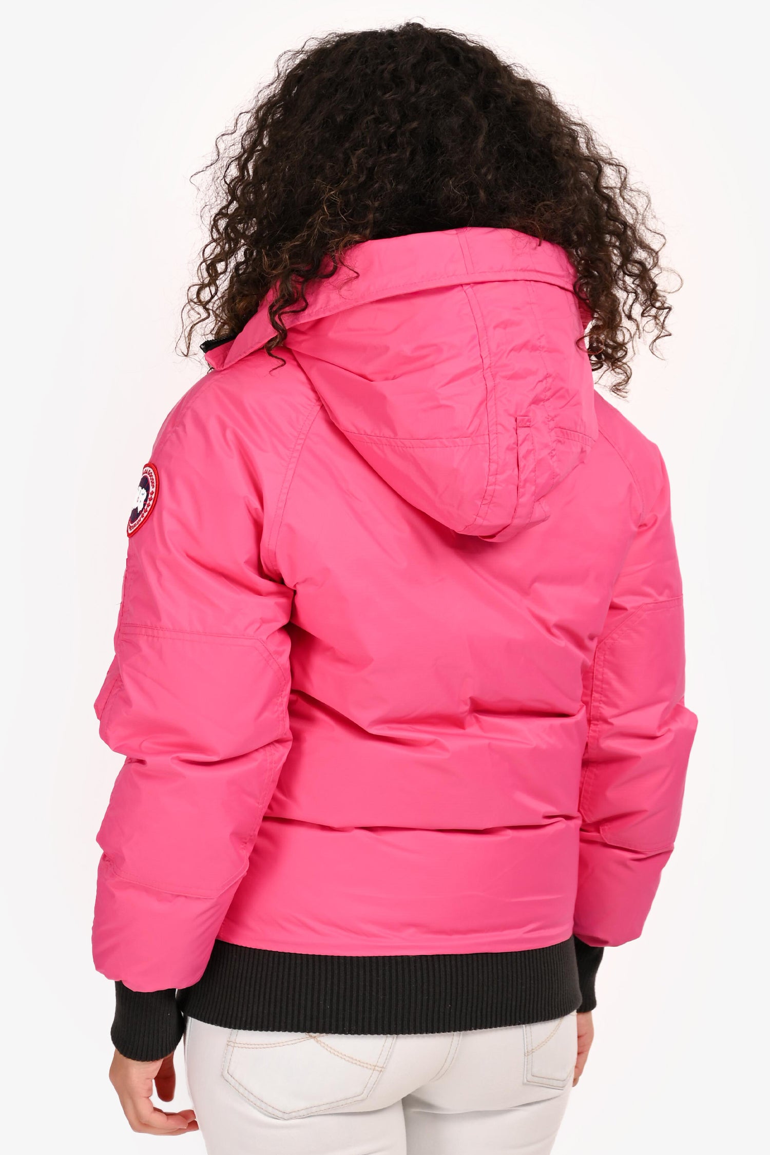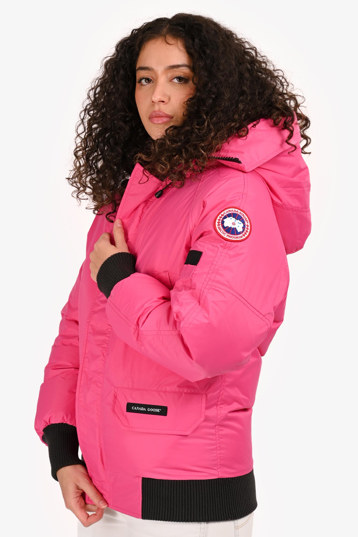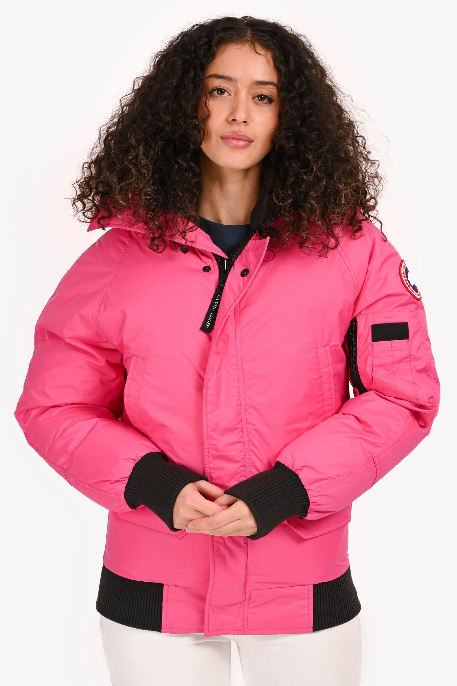 Refresh availabilityCanada Goose Hot Pink Nylon Chilliwack Bomber Jacket. Pull-on. 2-way front zip closure with snap button placket. Adjustable hood. 5 exterior pockets; 2 side-entry pockets, 2 flap with velcro closures, 1 arm pocket with zipper closure. Ribbed cuffs and hem. 1 interior pocket. Tonal stitching.