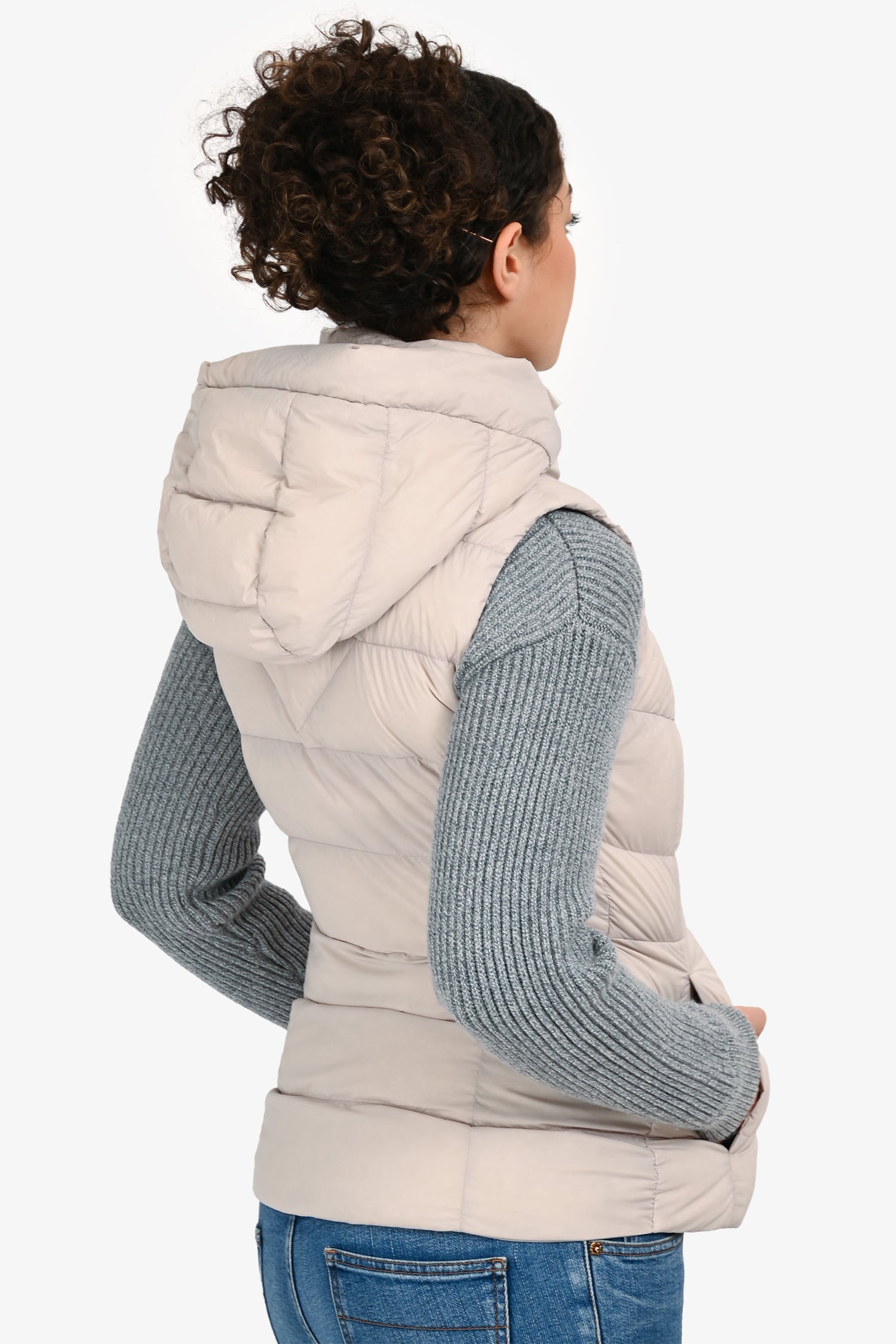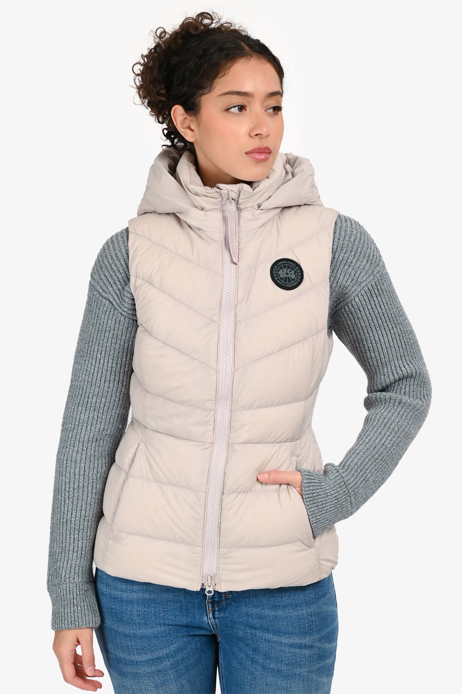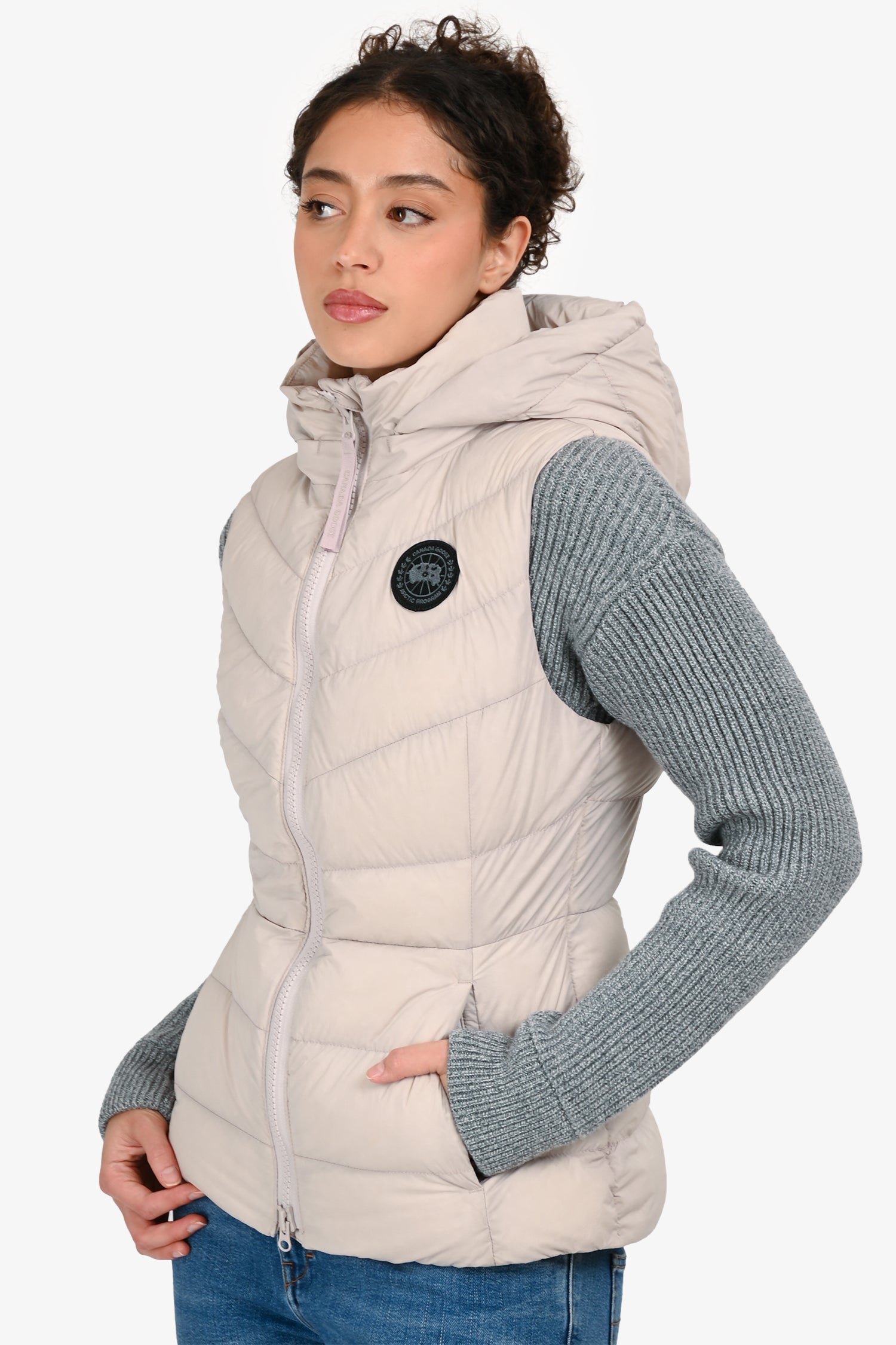 Refresh availabilityCanada Goose Pale Pink Down 'Clair' Vest. Pull-on. Detachable hood with zip closure. Front 2-way zip closure. 3 pockets; 2 front with zip closure, 1 interior with zip closure. Tonal hardware. Tonal stitching.