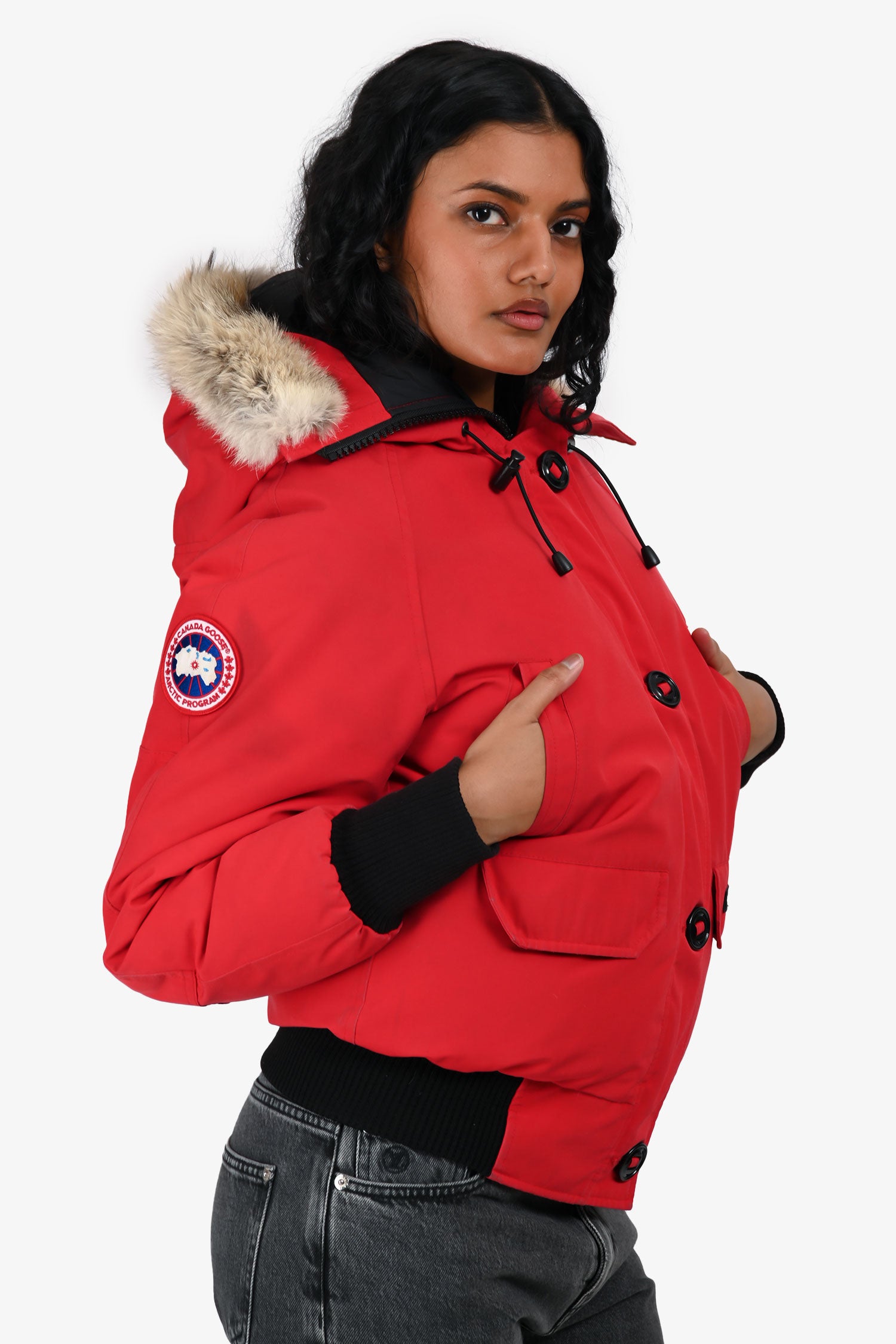 Refresh availabilityCanada Goose Red Down Fur Hood 'Chilliwack' Bomber Jacket. Pull-on. 2-way front zip with button closure in the front. Adjustable hood. Ribbed cuffs and hemline. 5 exterior pockets; 2 slip pockets, 2 flap pockets with velcro closures, 1 arm pocket with zipper closure. 1 interior pocket. Tonal stitching.
