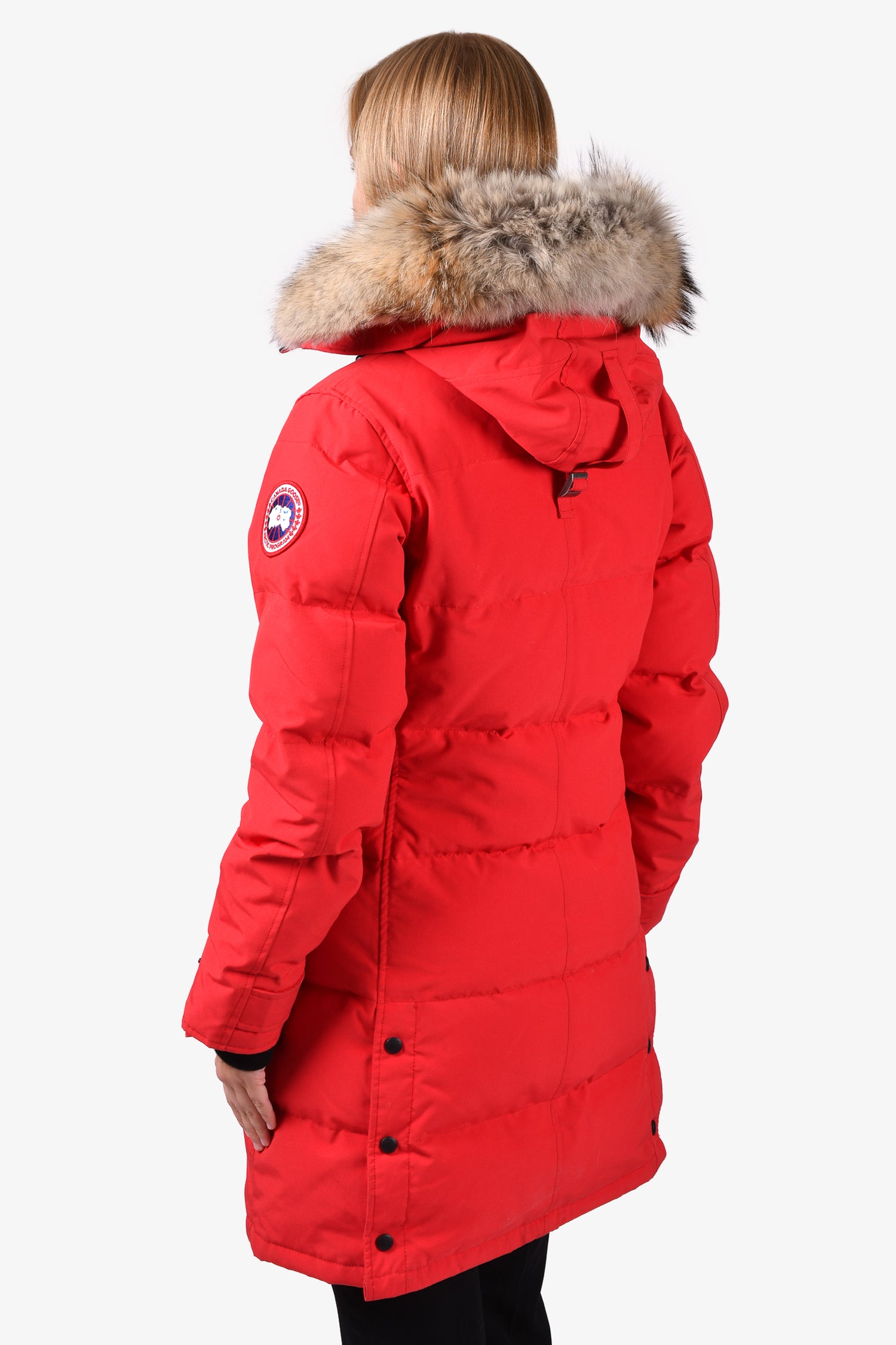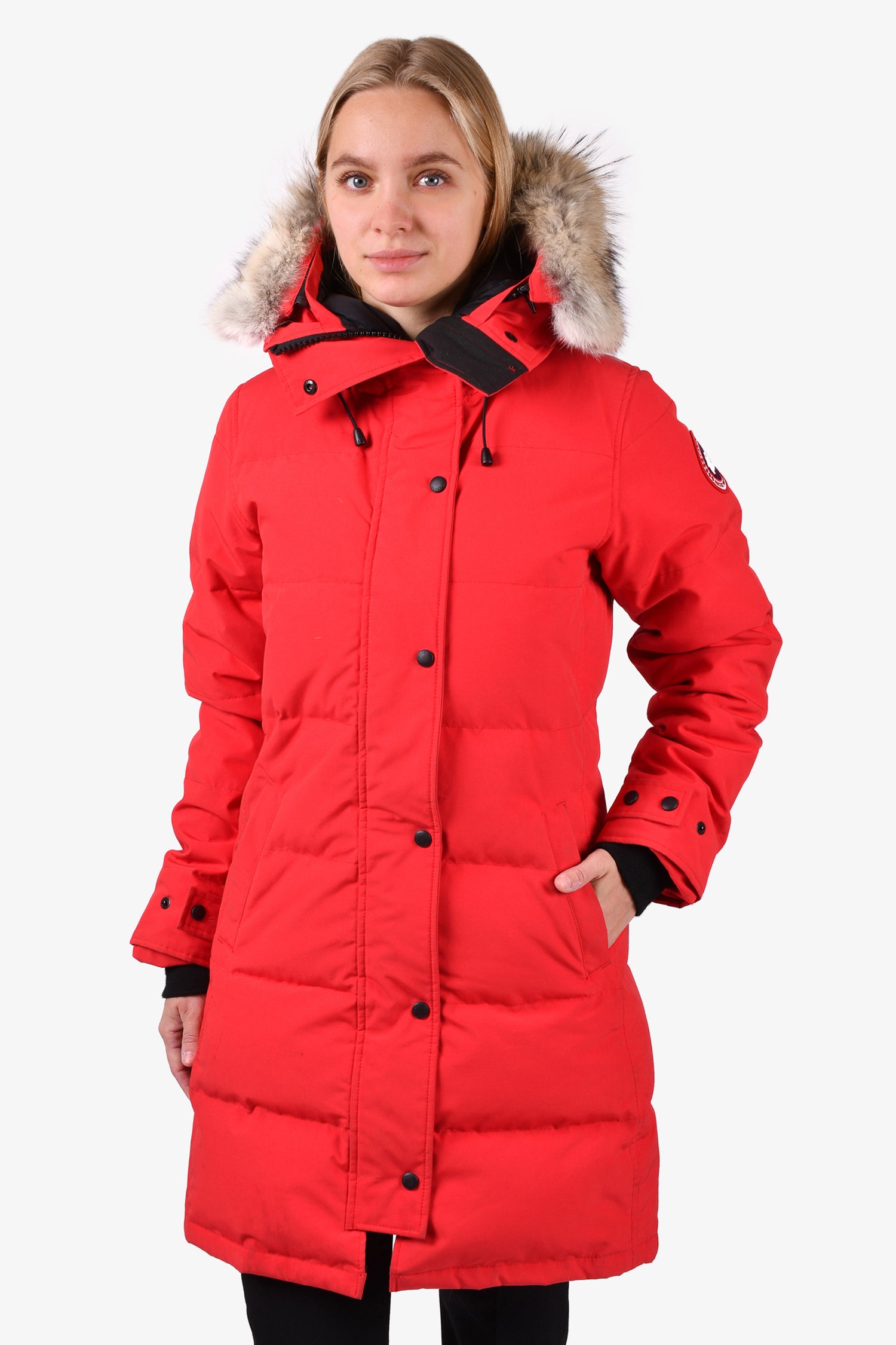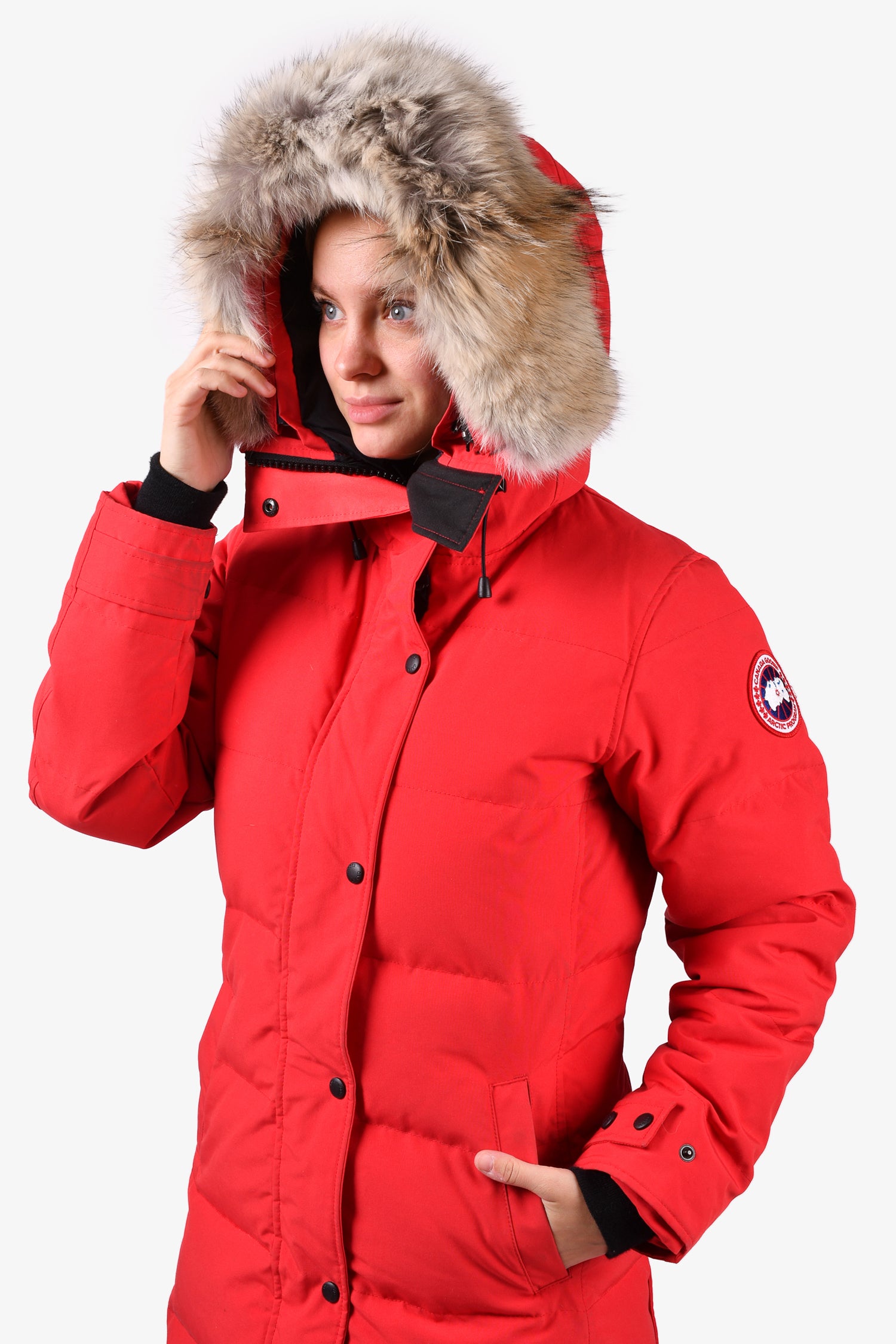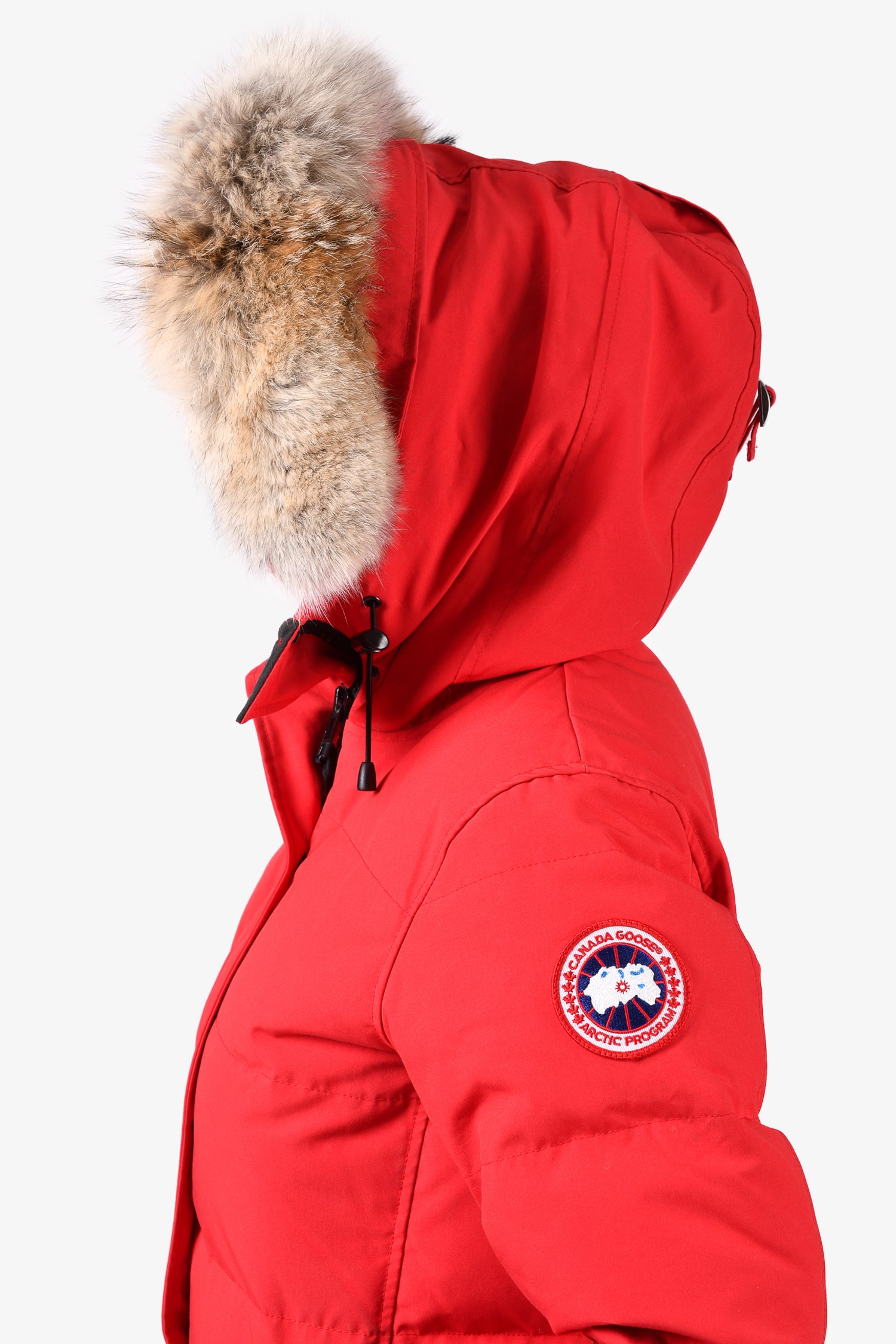 Refresh availabilityCanada Goose Red Down Long Puffer Jacket with Removable Fur Hood. Front two-way zip closure. Front zip pockets. Lined. Brand logo patch on the left sleeve. Tonal stitching.