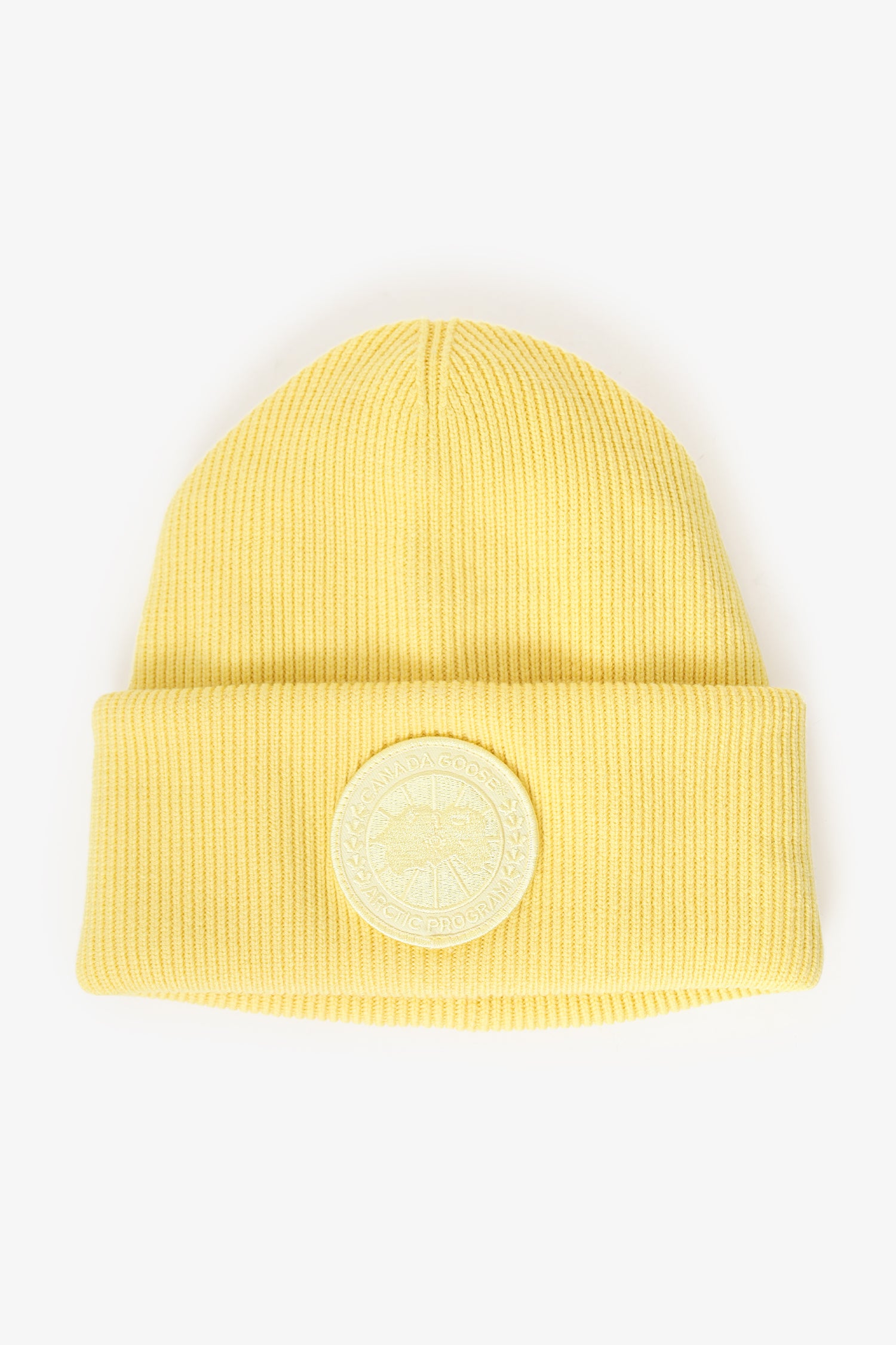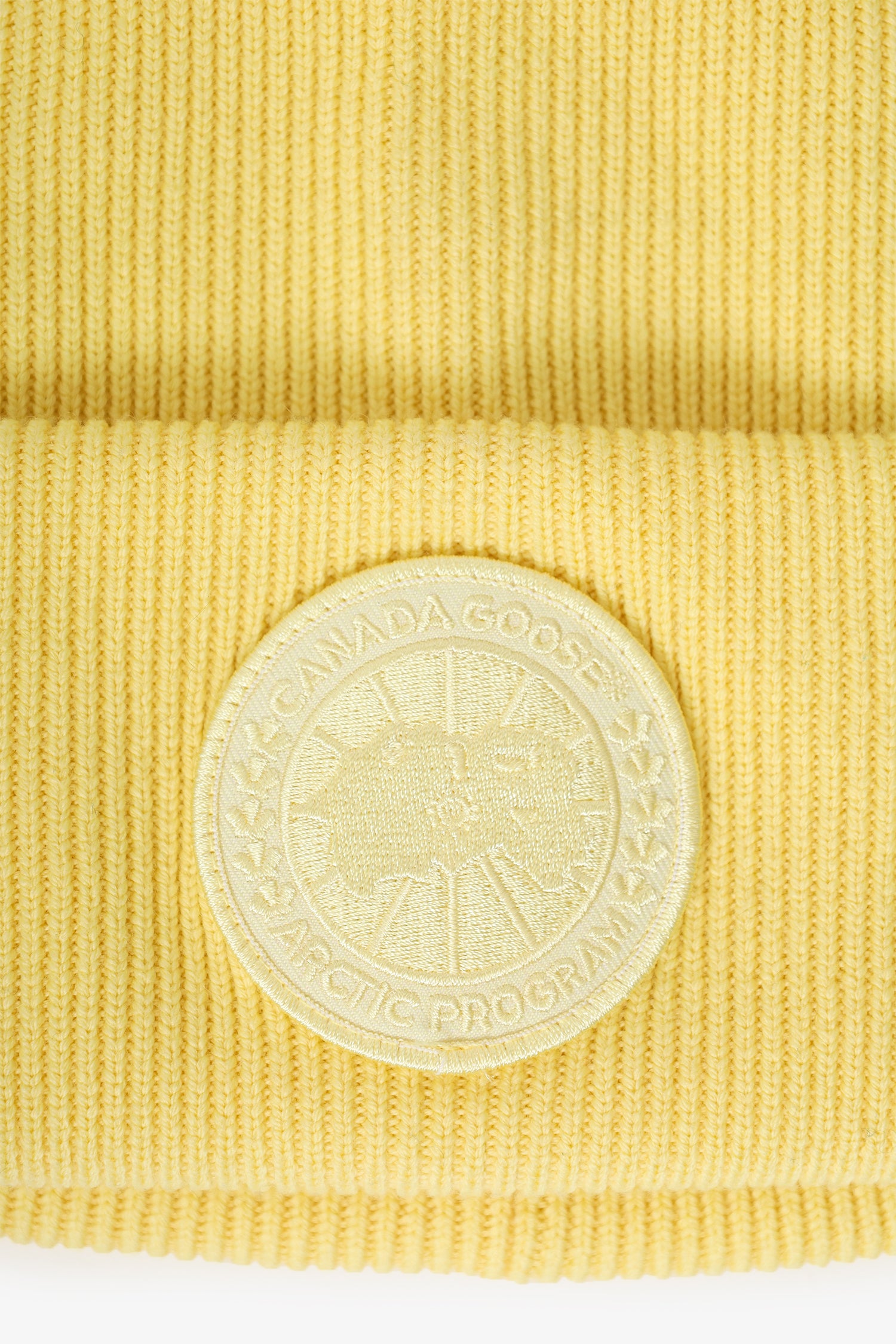Refresh availabilityCanada Goose Yellow Wool Ribbed Knit Beanie. Logo embellishment on front. Tonal stitching.
