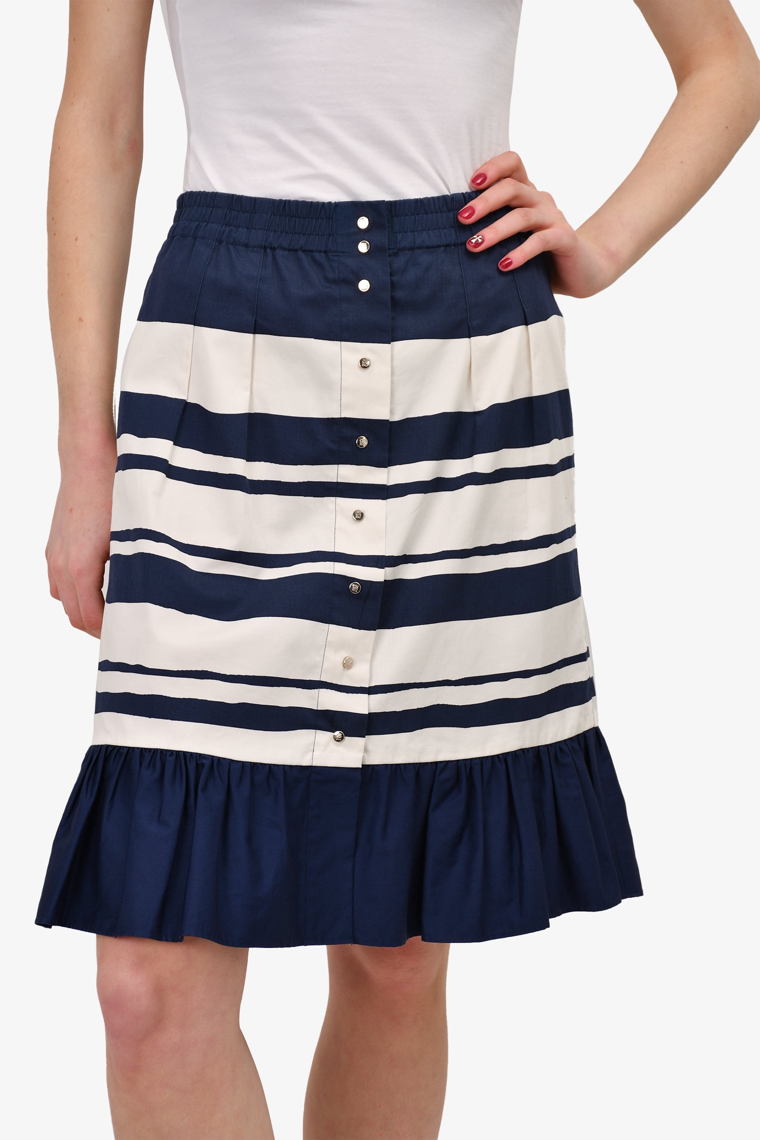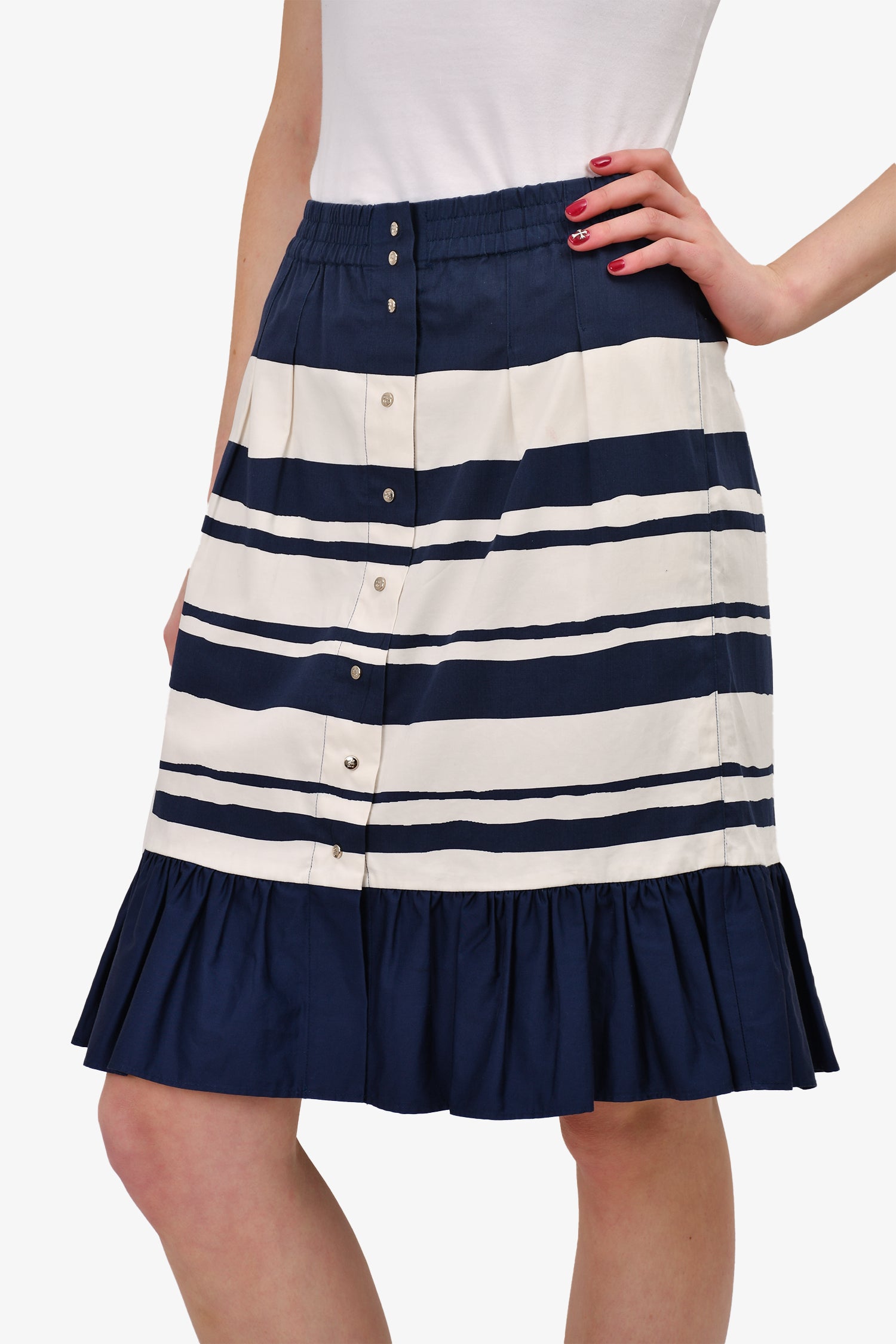 Refresh availabilityCarolina Herrera Blue/White Striped Ruffle Midi Skirt. Front snap button-up closure. Elasticized waist.