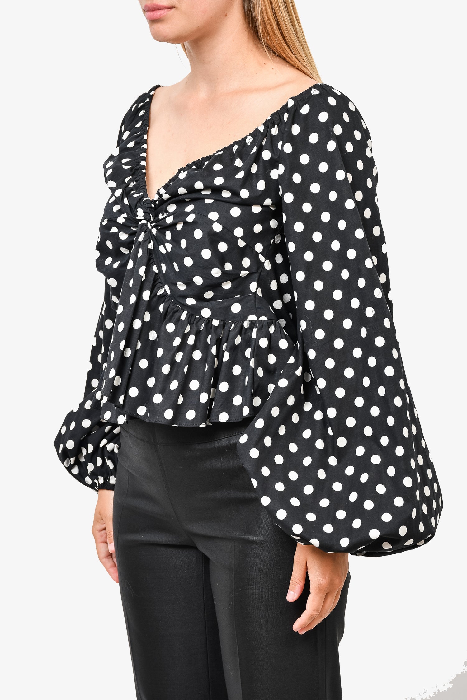 Refresh availabilityCaroline Constas Black/White Polka-Dot Top. V-neckline. Tonal stitching.