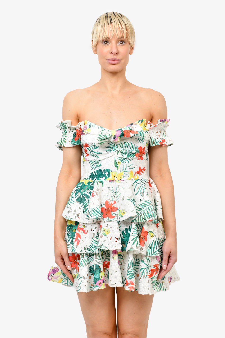 Refresh availabilityCaroline Constas White/Green Floral Print Tiered Lace Dress. Sleeveless. Rear zip and hook closure. Lined. Tonal stitching.