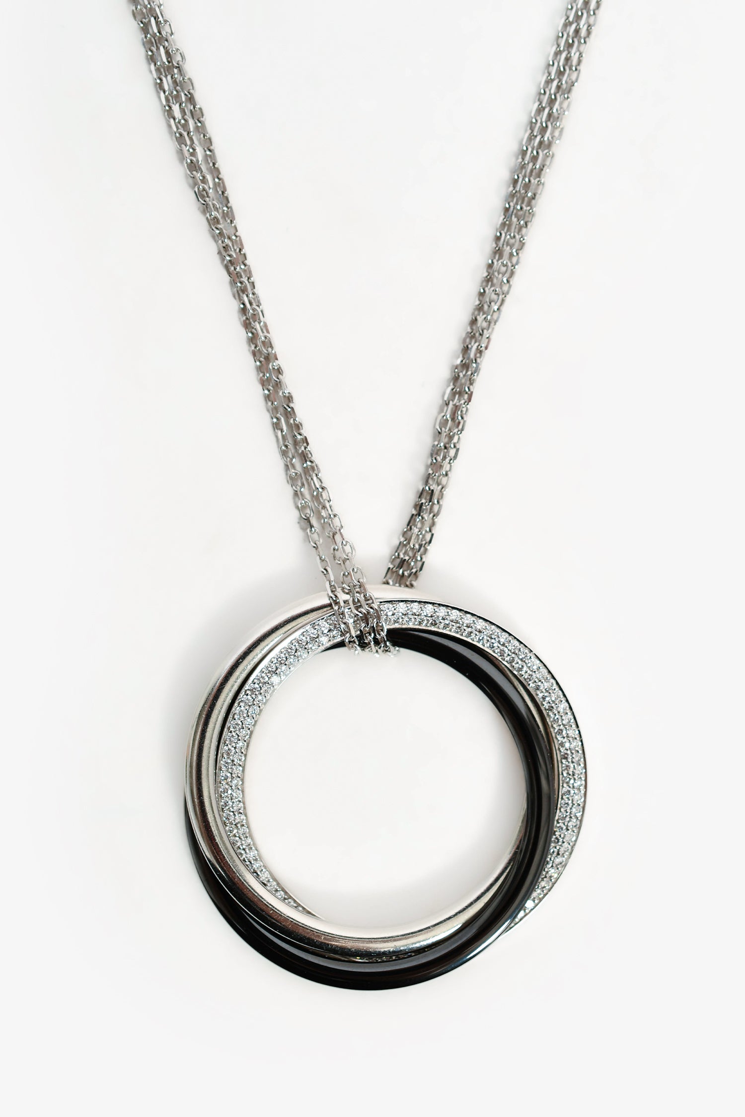 Refresh availabilityCartier 18K White Gold/Platinum/Black Ceramic Diamond Trinity Necklace. Triple 18K white gold chain-links with a push-clasp. 3 circular pendants in black ceramic, platinum, and diamond encrusted.