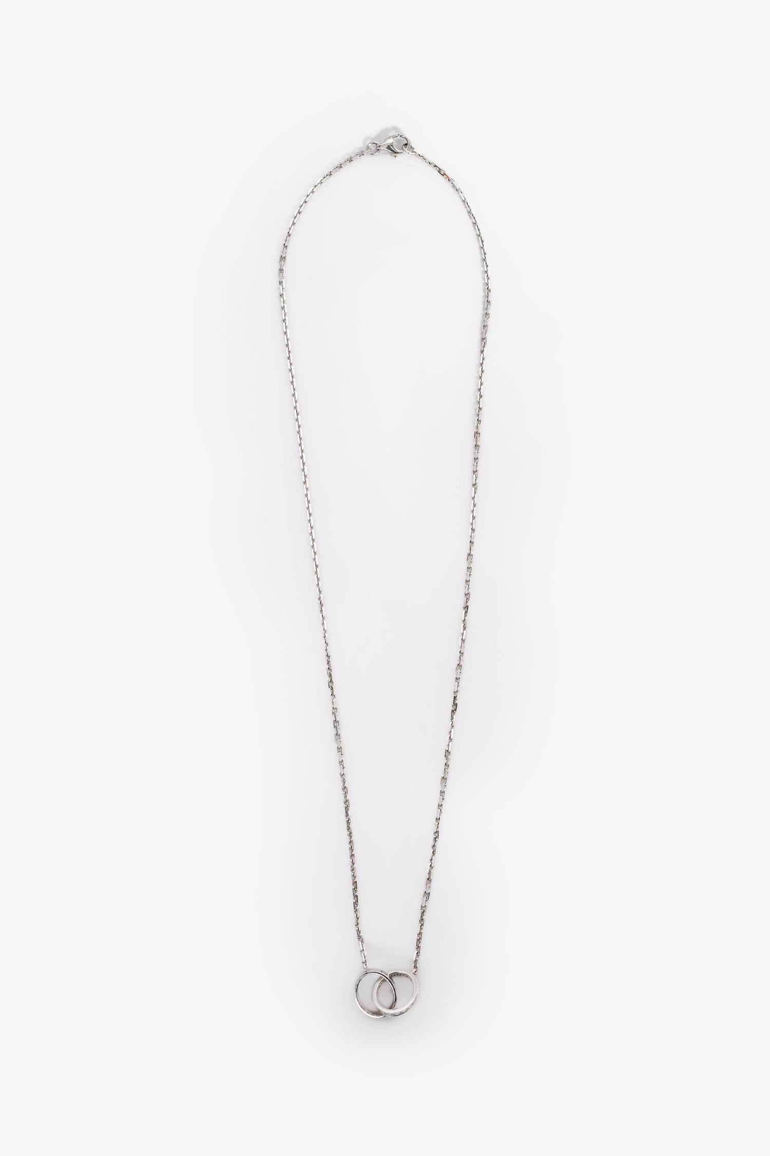 Refresh availabilityCartier 18K White Gold Diamond Interlocking Love Necklace. Pave diamond encrusted band. Engraved signature Love band. Micro chain-link strand. Lobster clasp closure.
