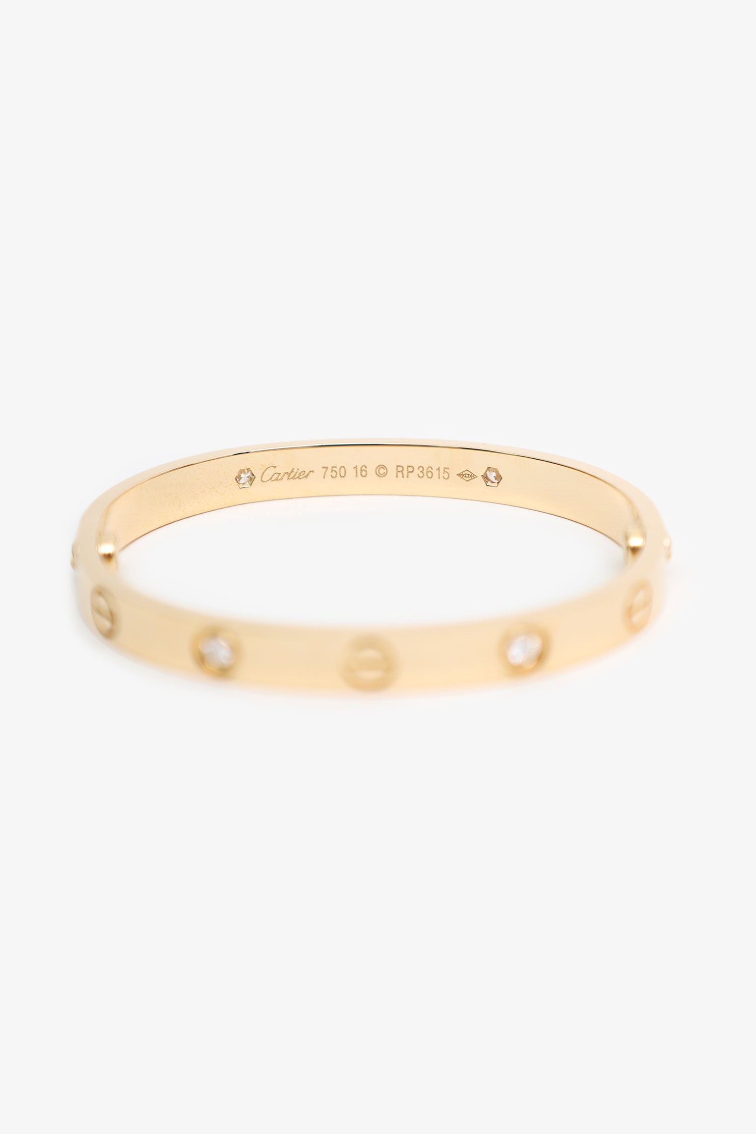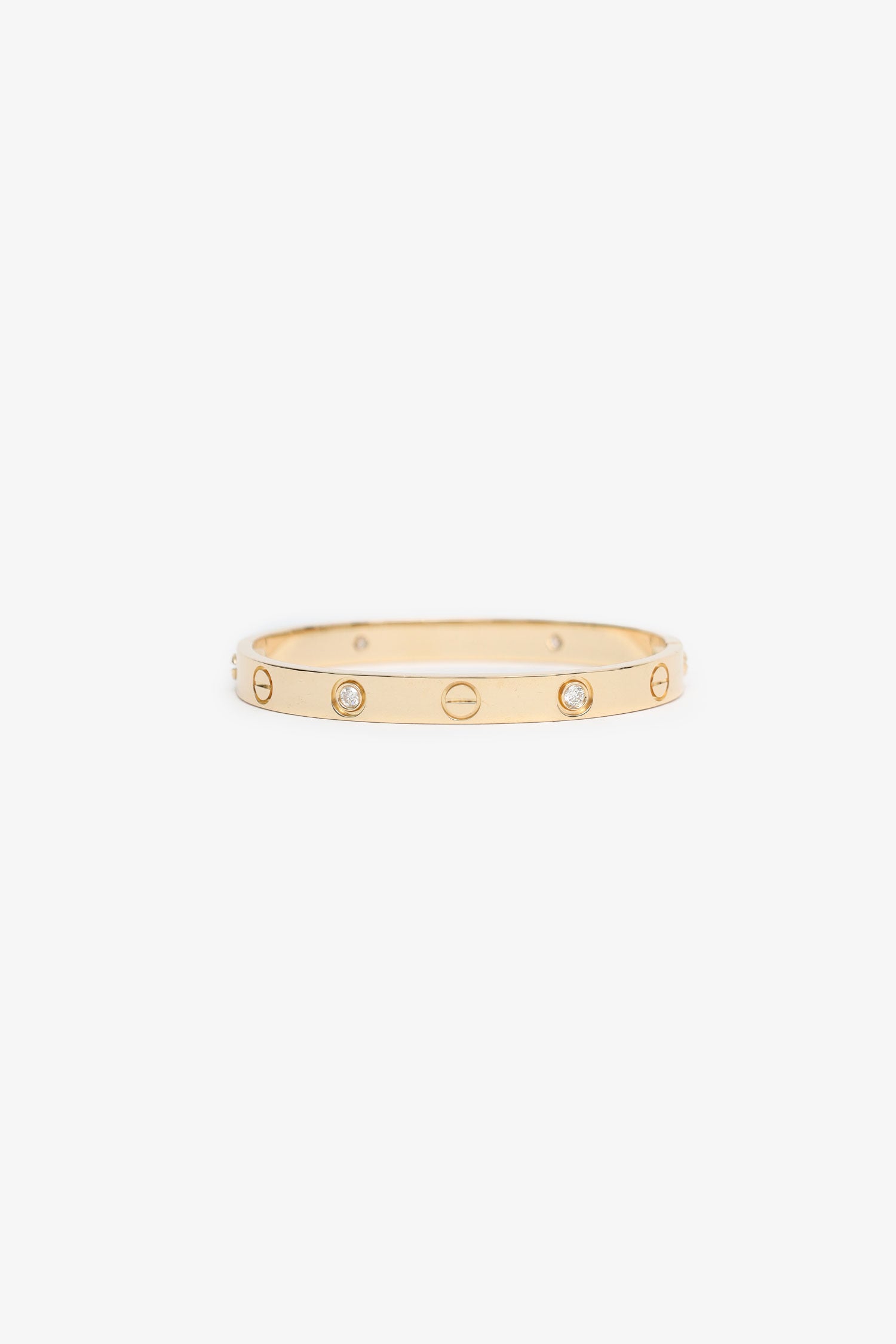 Refresh availabilityCartier 18K Yellow Gold 4 Diamonds Medium Model Love Bracelet. Screw closure. Modern-style bangle bracelet. Gold-tone hardware.