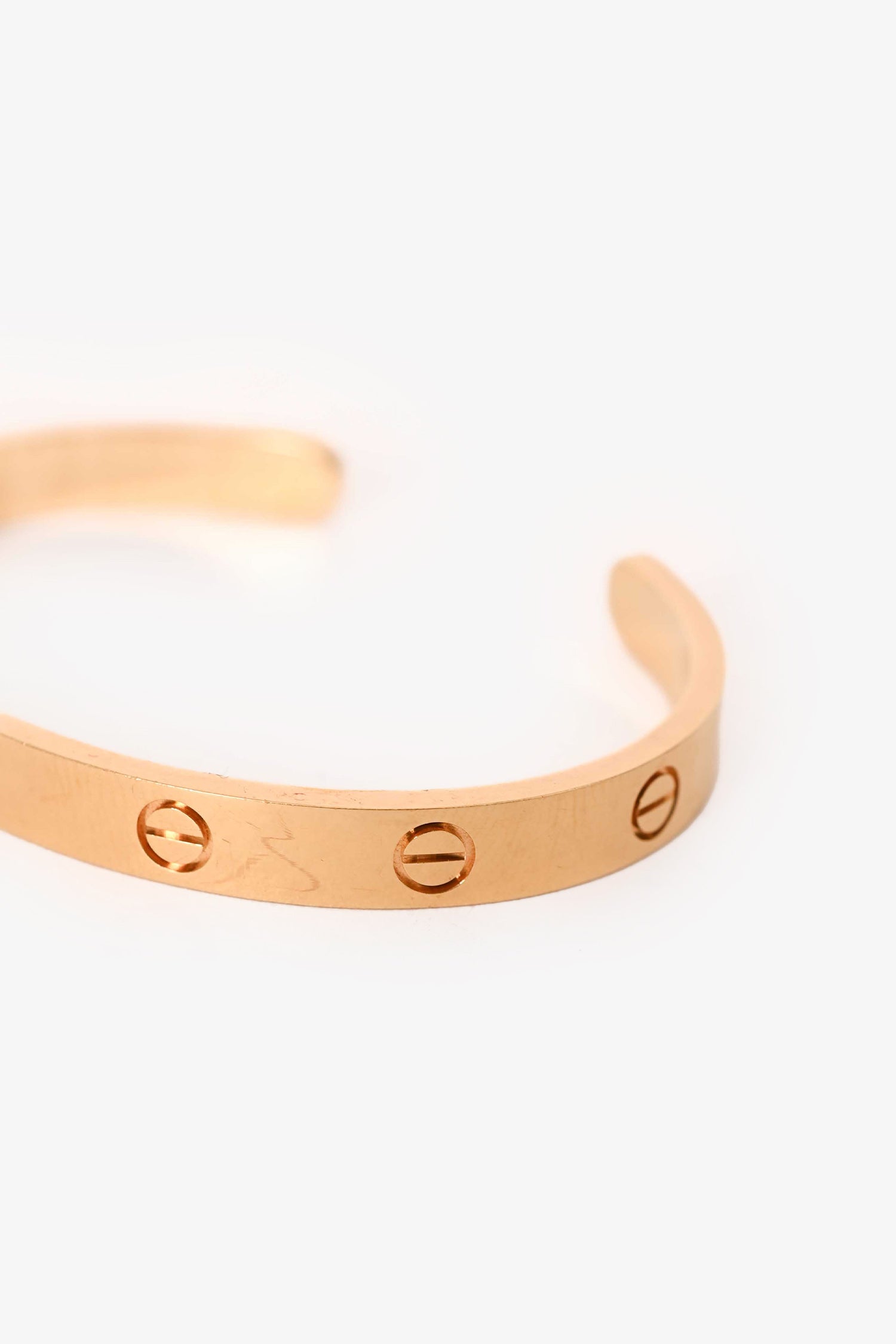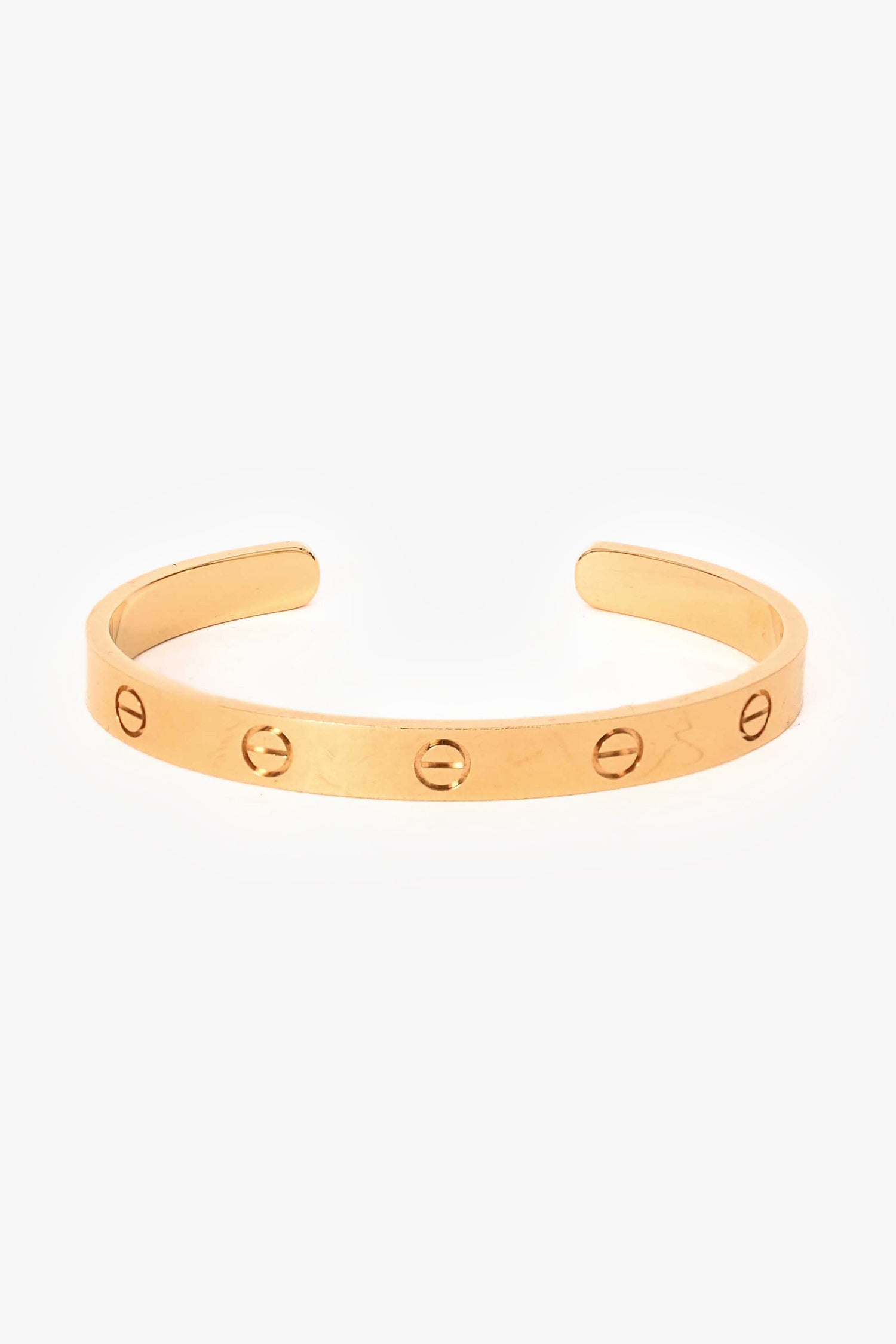 Refresh availabilityCartier 18K Yellow Gold Love Bangle Cuff. Slip-on. Signature screw motif throughout. Polished finish with interior engraving.