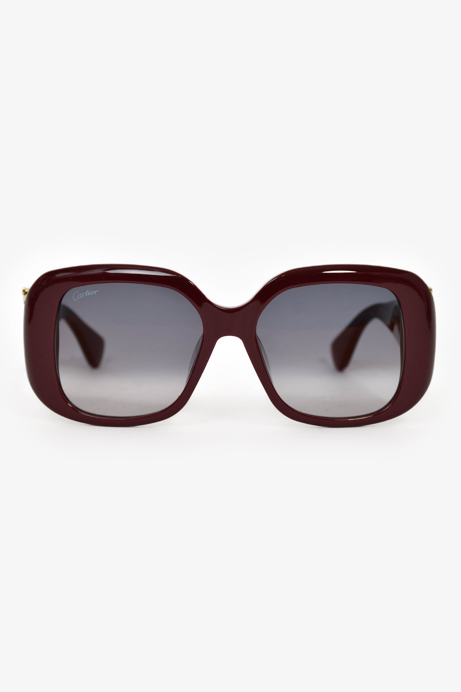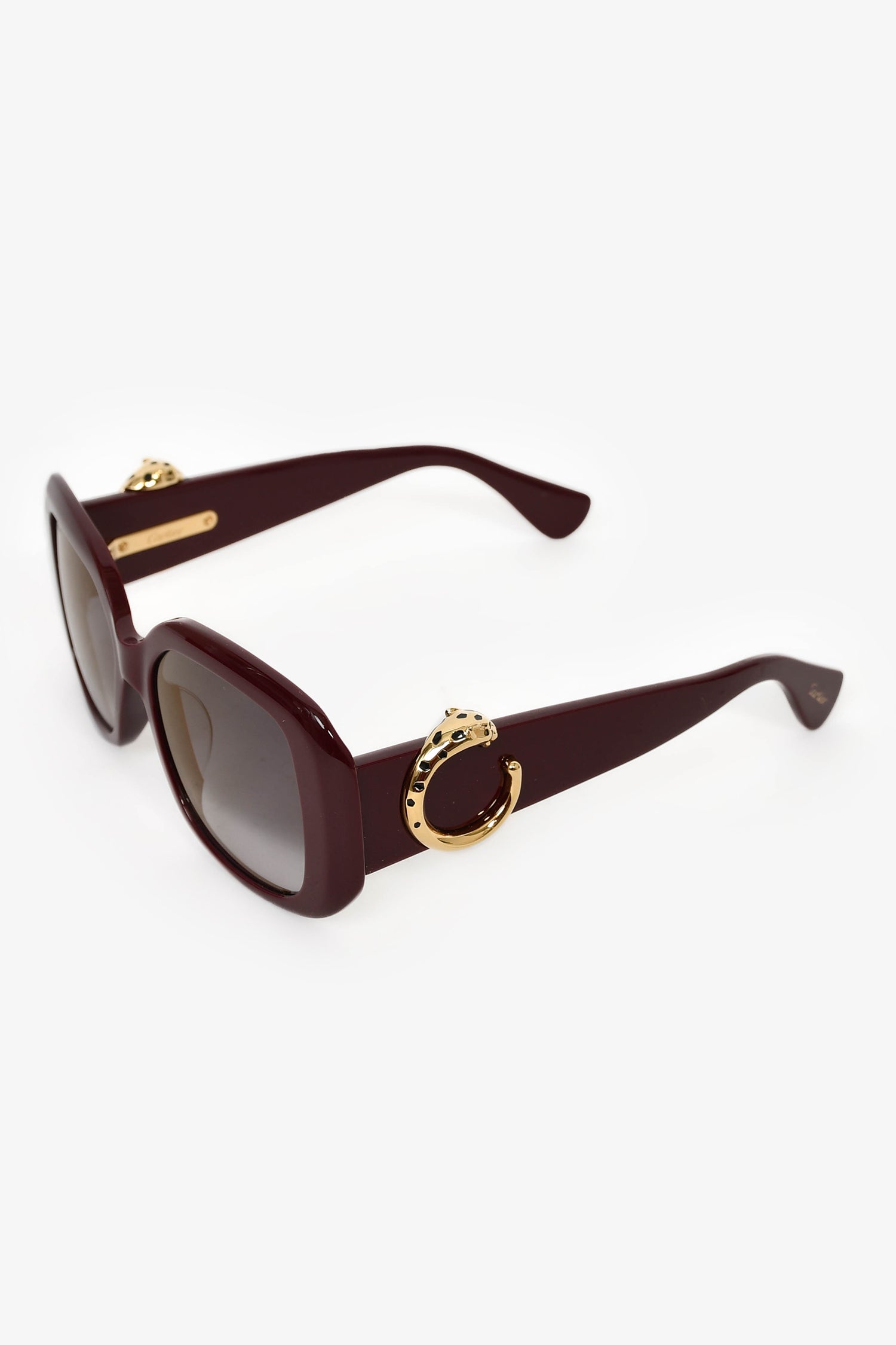 Refresh availabilityCartier Burgundy Panthere Square Frame Sunglasses. Built-in nose pads. Gradient lens. Gold-tone hardware.