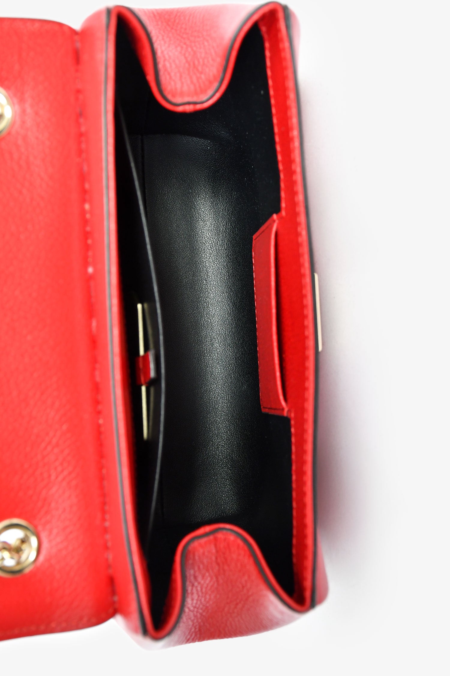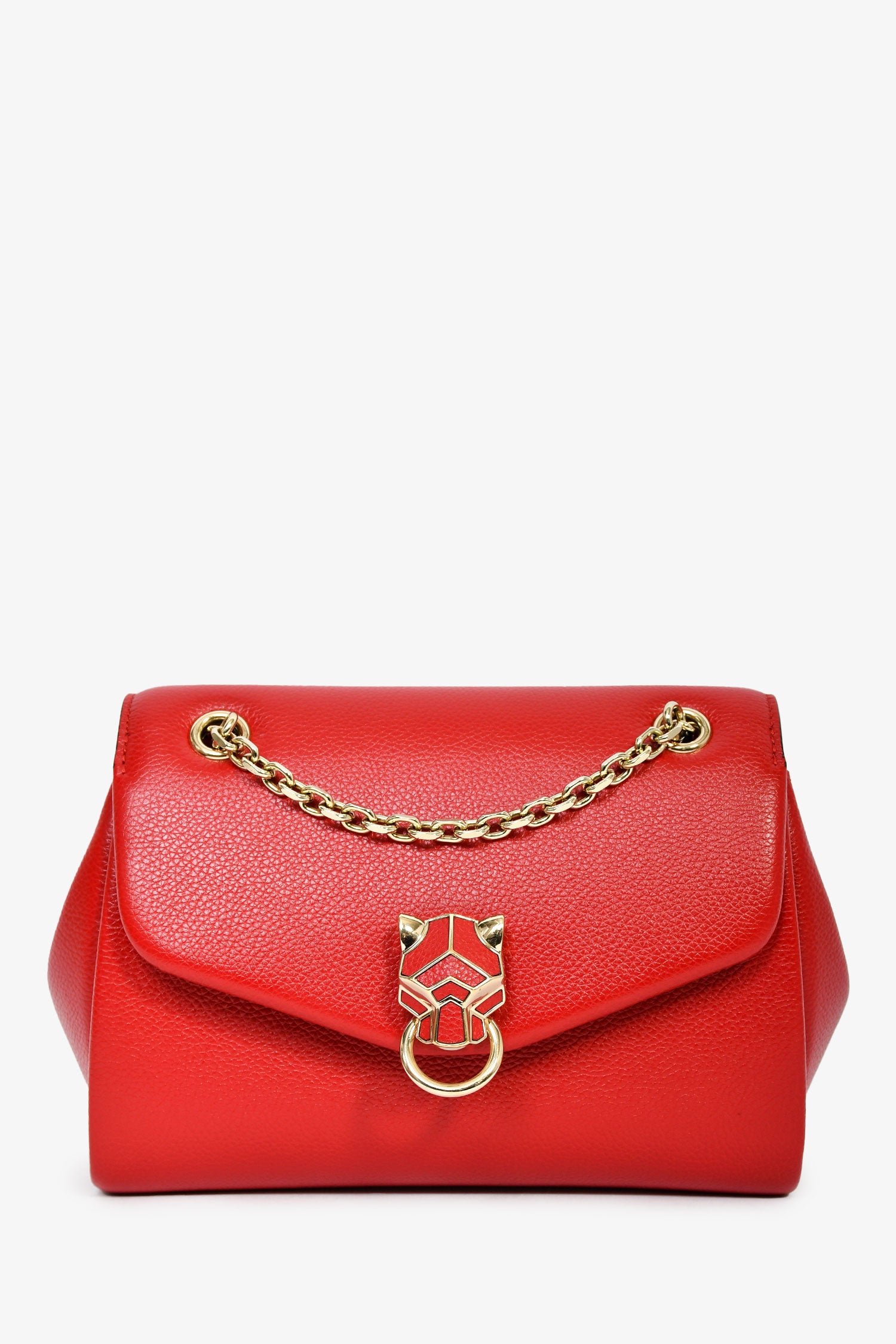 Cartier Red Mini Panthère Graphique Shoulder Bag. Front fold-over flap closure. Slide-around chain strap. 2 interior wall slip pockets. Gold-tone hardware. Tonal stitching.