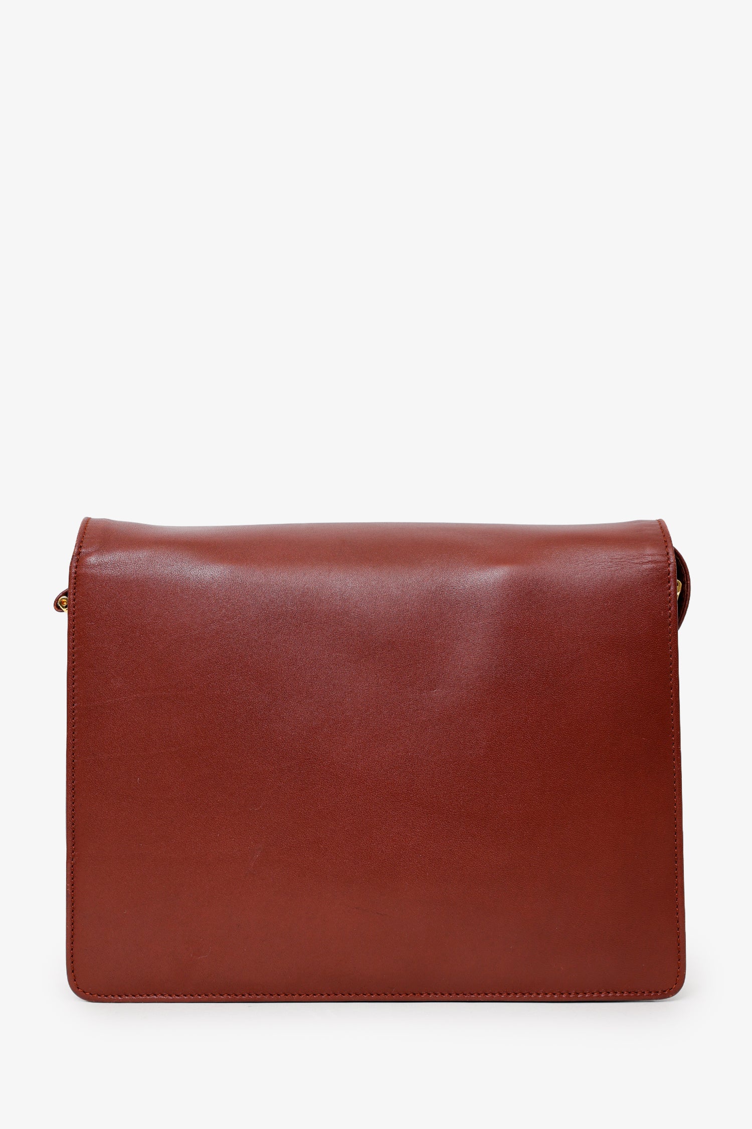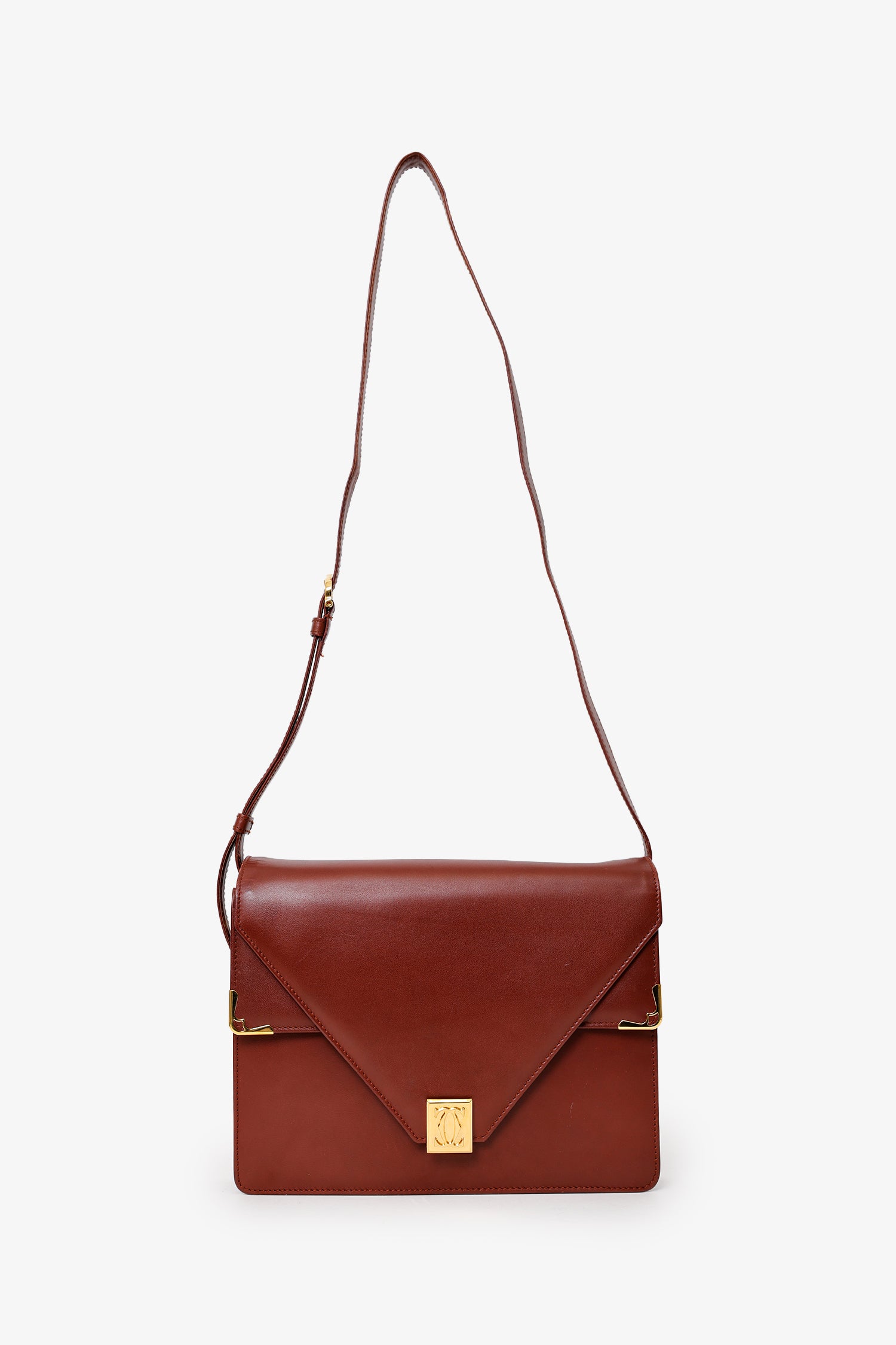 Refresh availabilityCartier Vintage Burgundy Leather Envolope Must de Cartier Shoulder Bag. Front fold-over flap with flip-lock closure. Shoulder strap with adjustable buckle closure. Additional flap compartment under main flap. 2 interior pockets; 1 slip and 1 zip. Gold-tone hardware. Tonal stitching.
