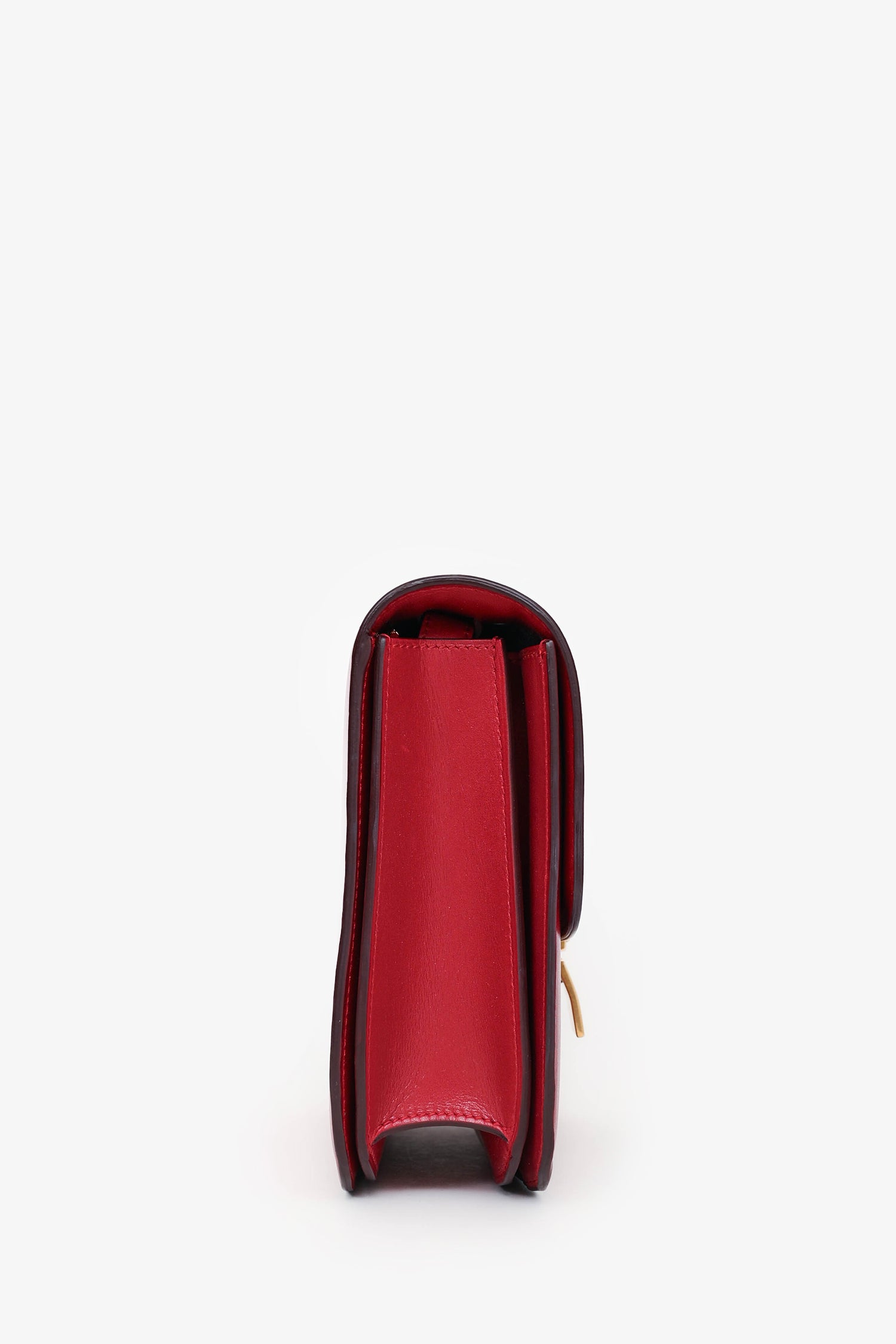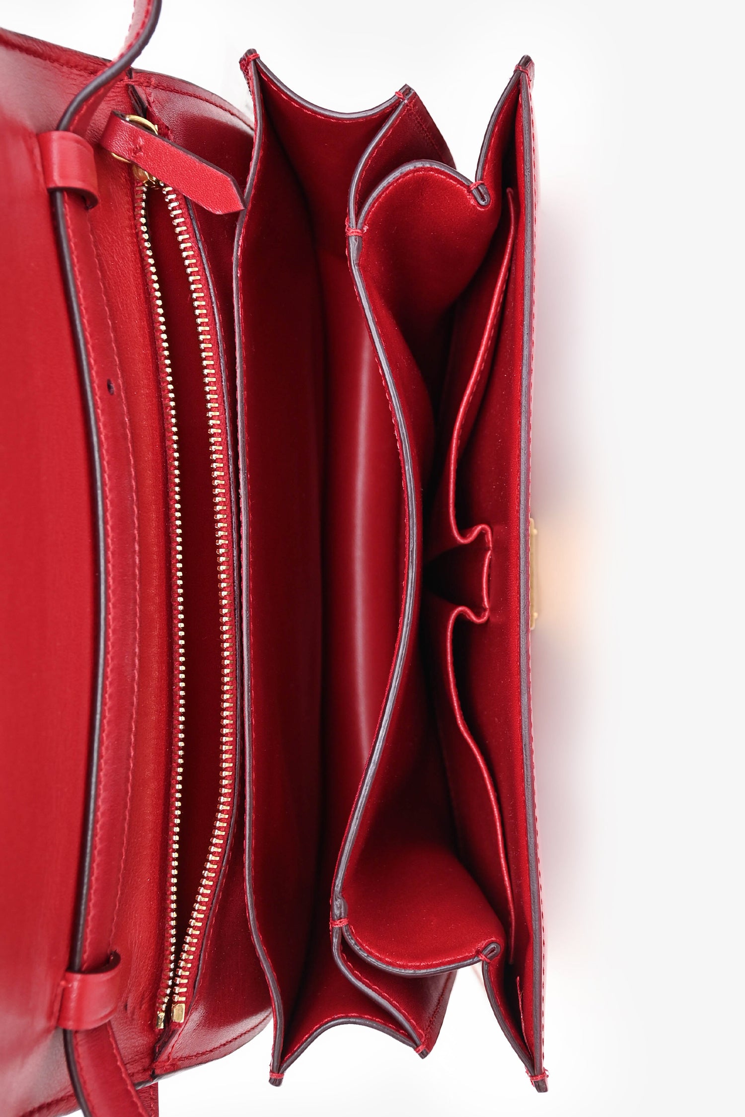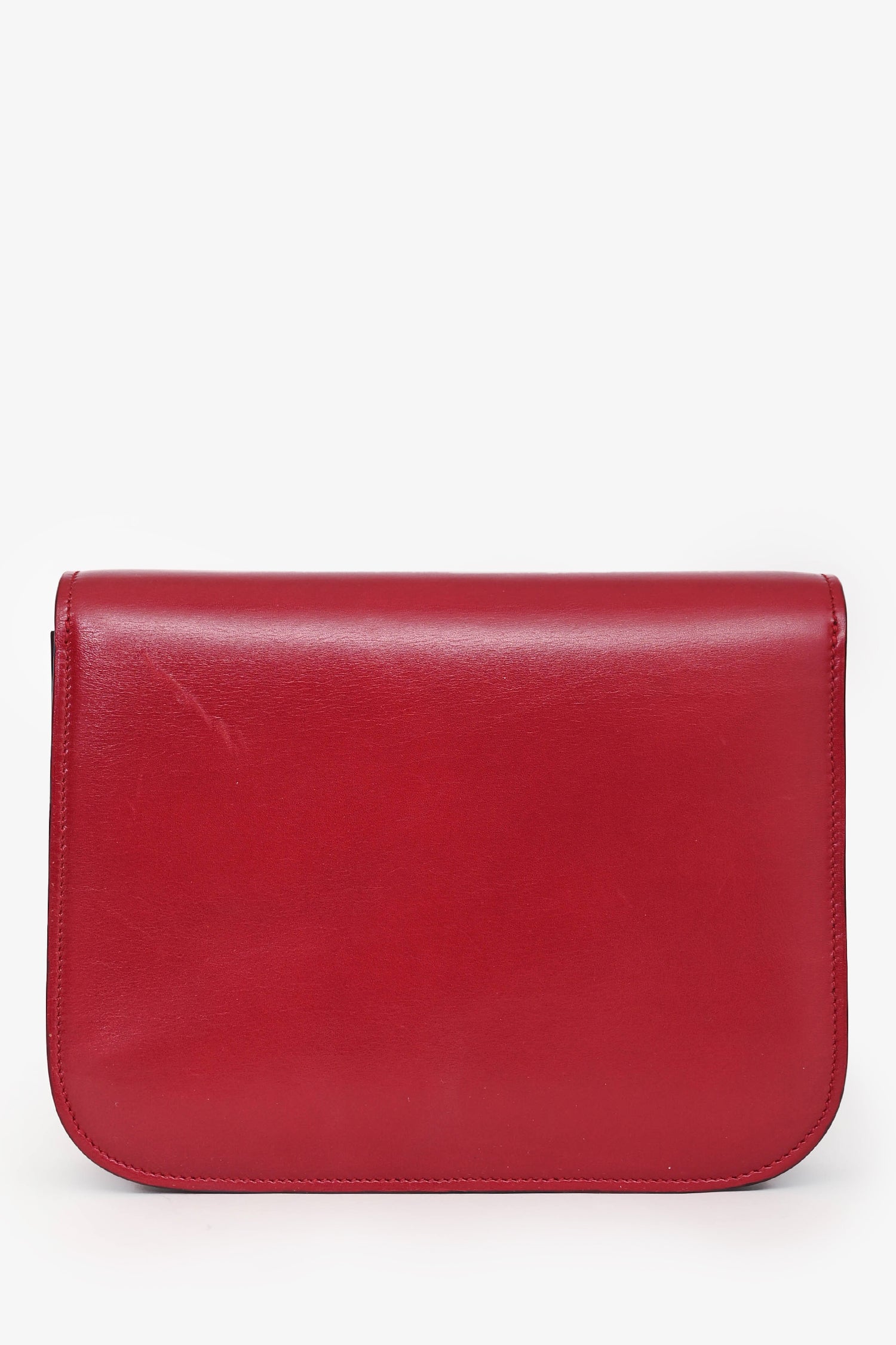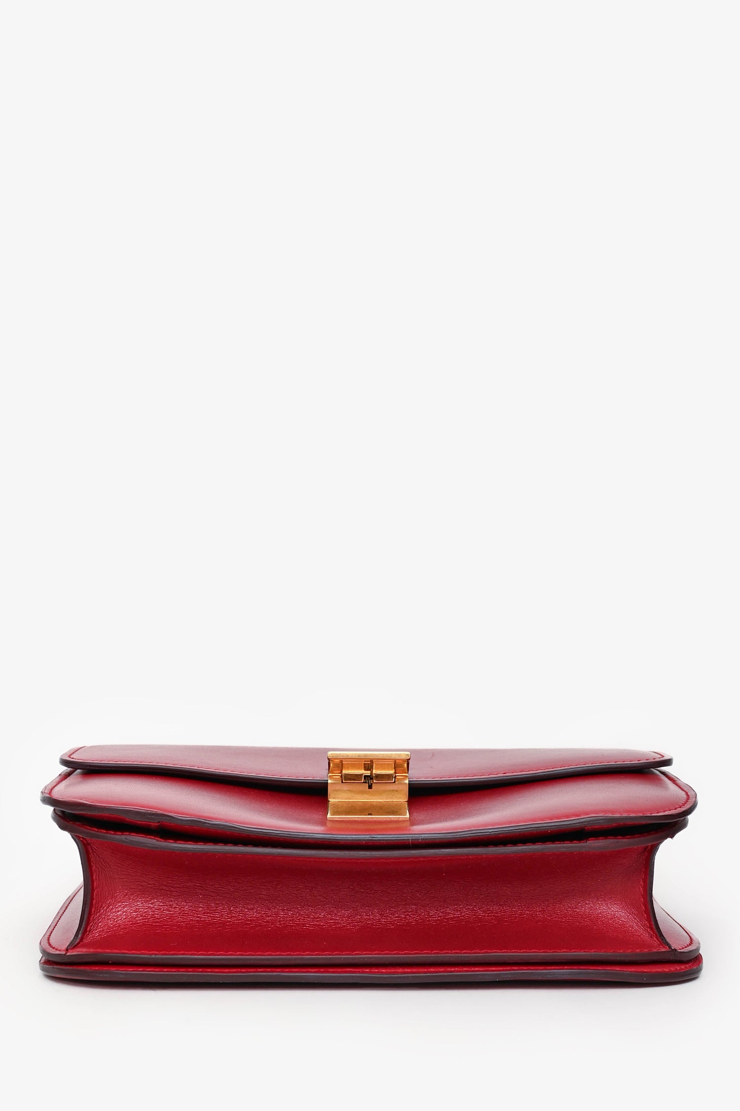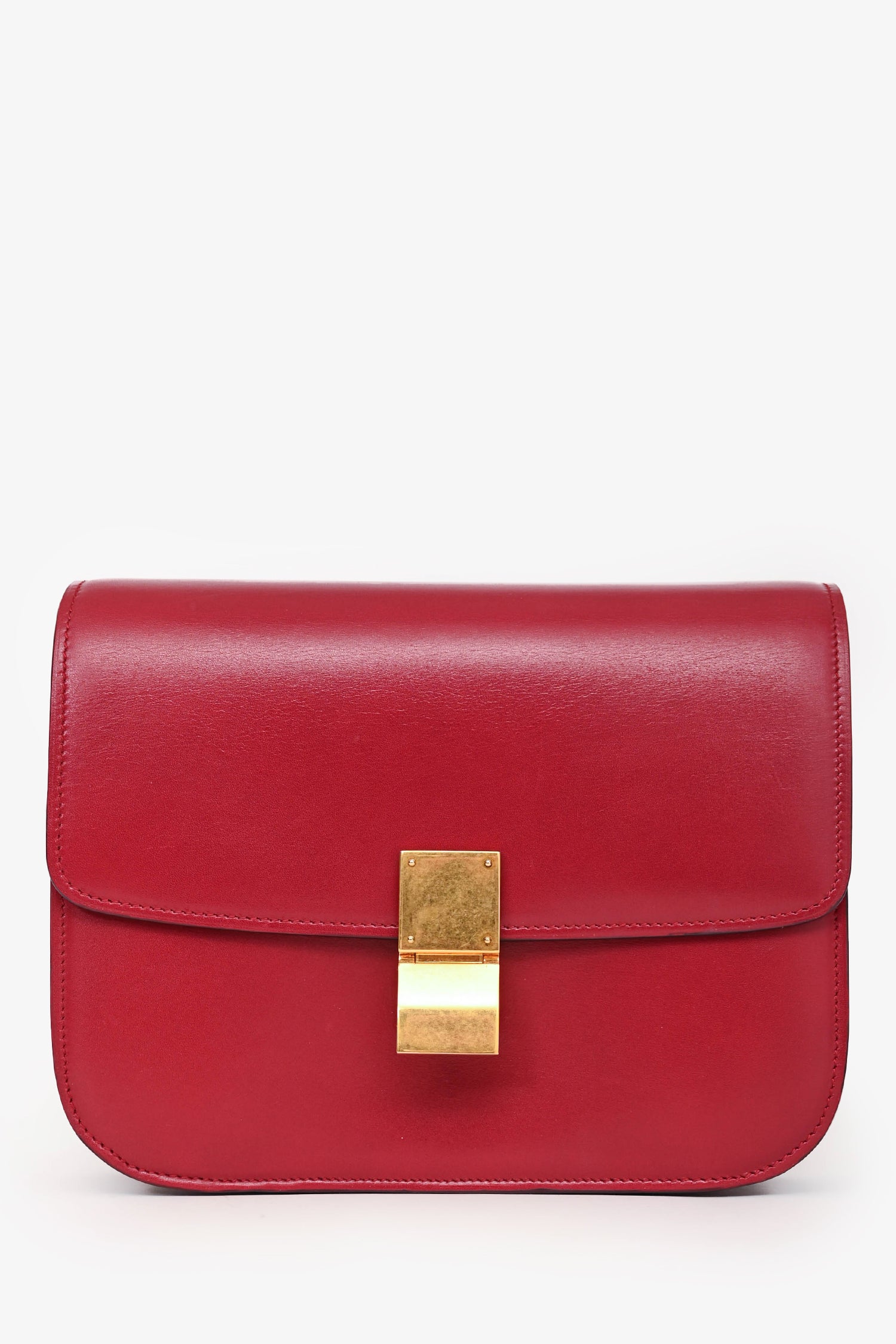Refresh availabilityCeline 2012 Red Leather Medium Box Crossbody. Gold-tone hardware. Fold-over flap with a flip-lock closure. 2 interior compartments. 1 zipped compartment. 2 pockets. Single crossbody strap. Coated trimming. Tonal stitching.
