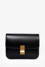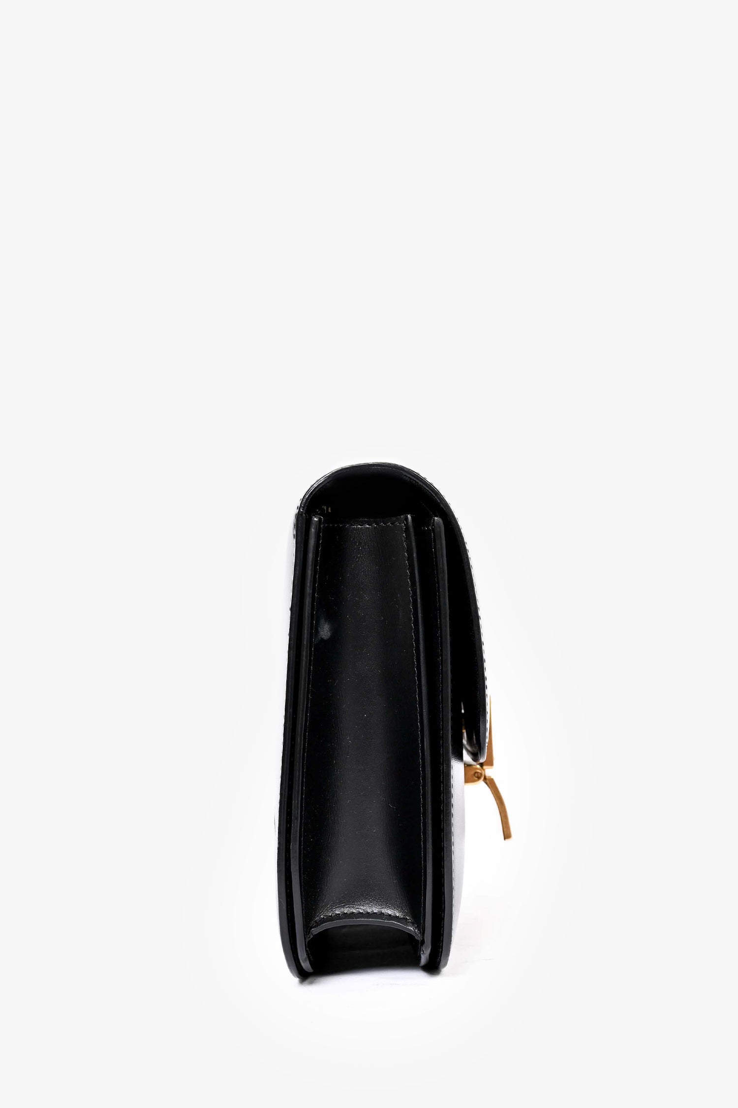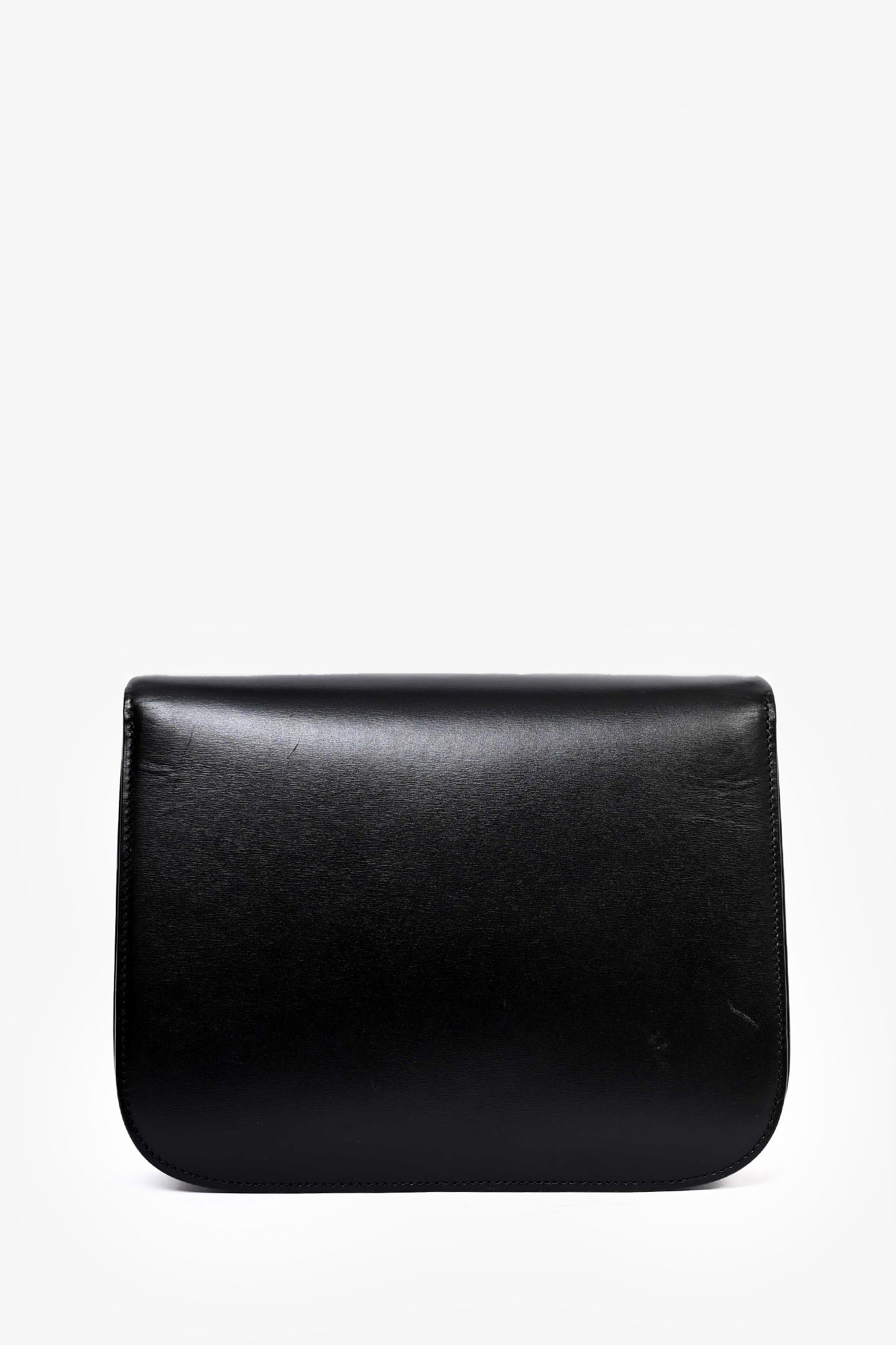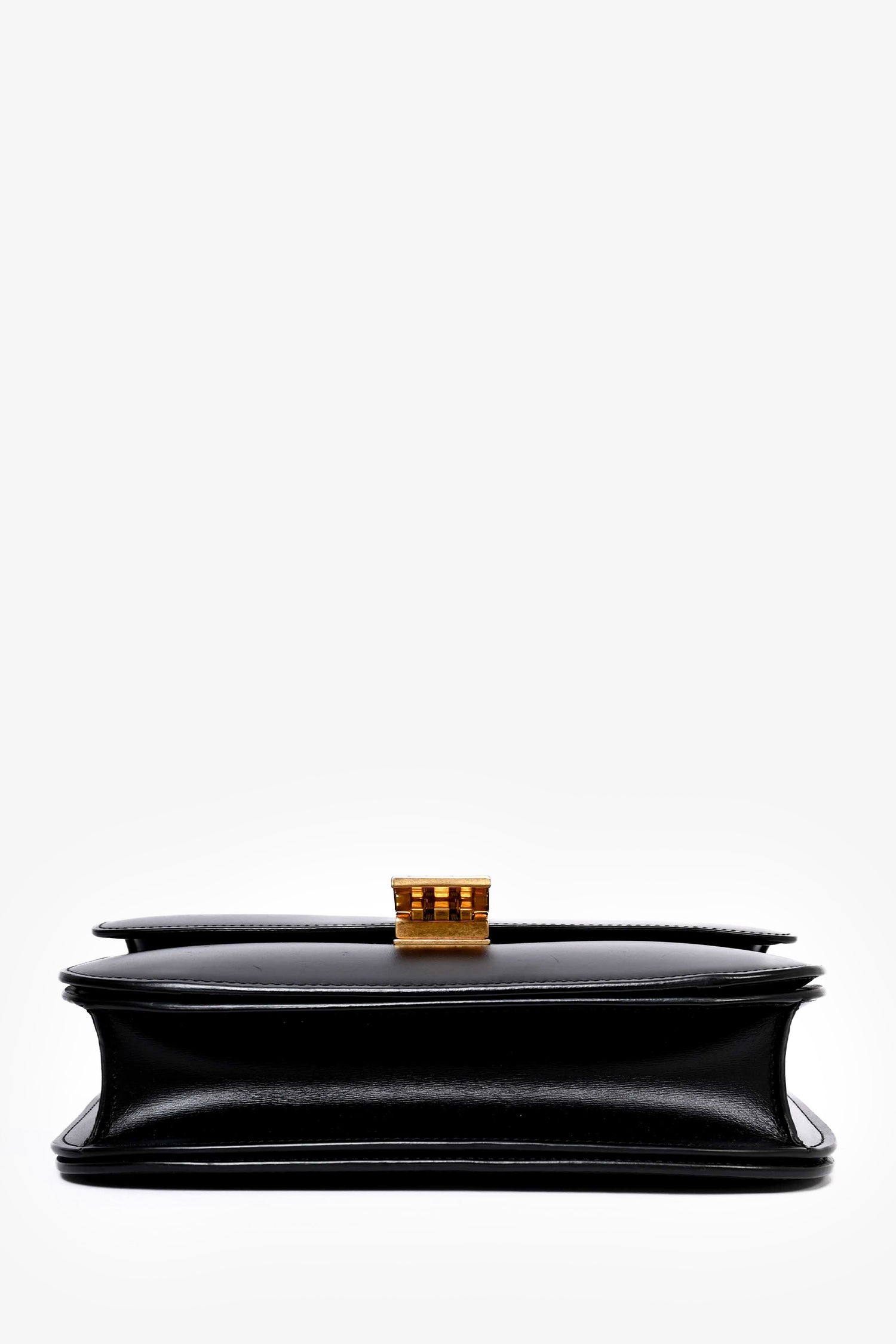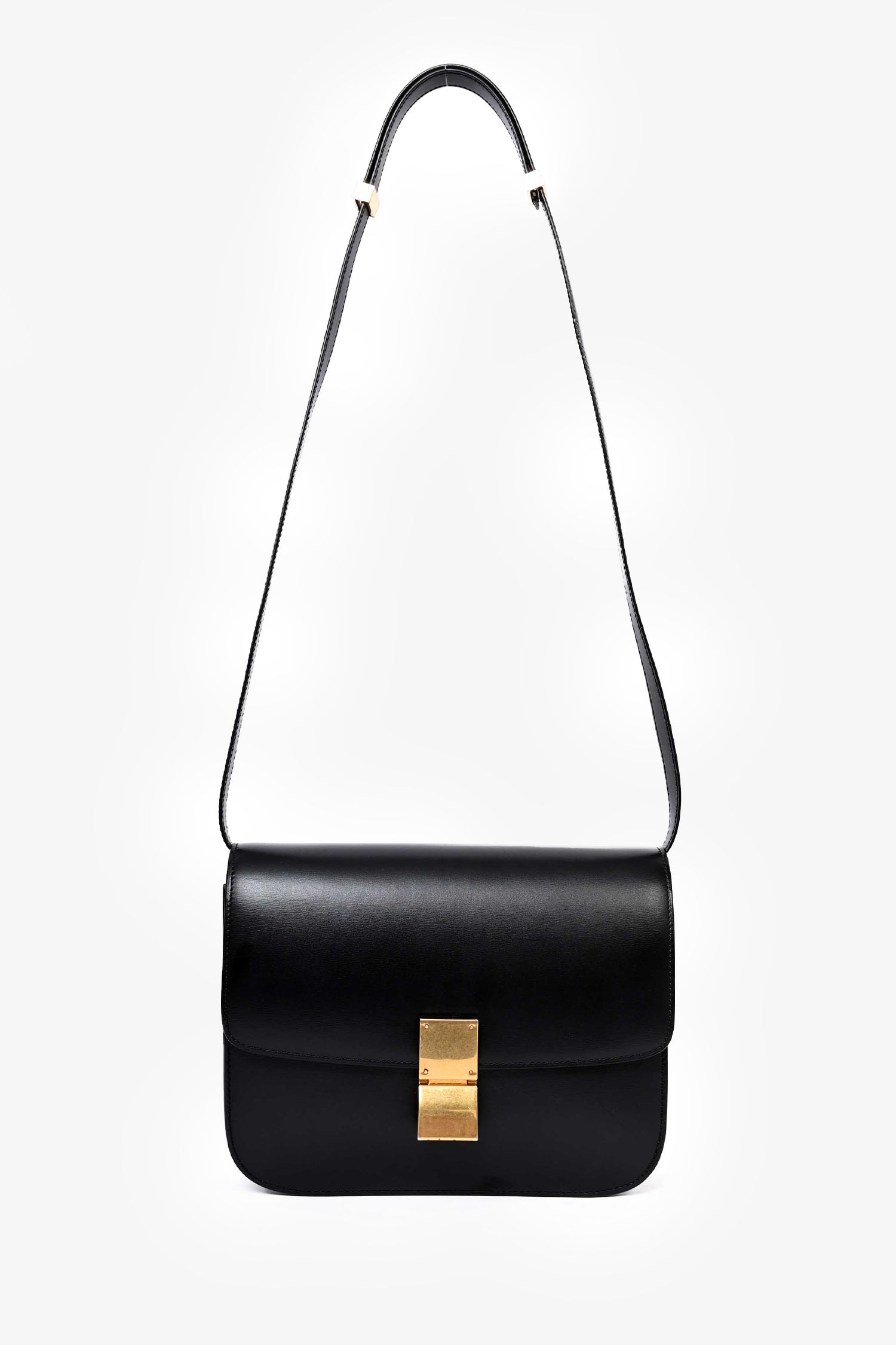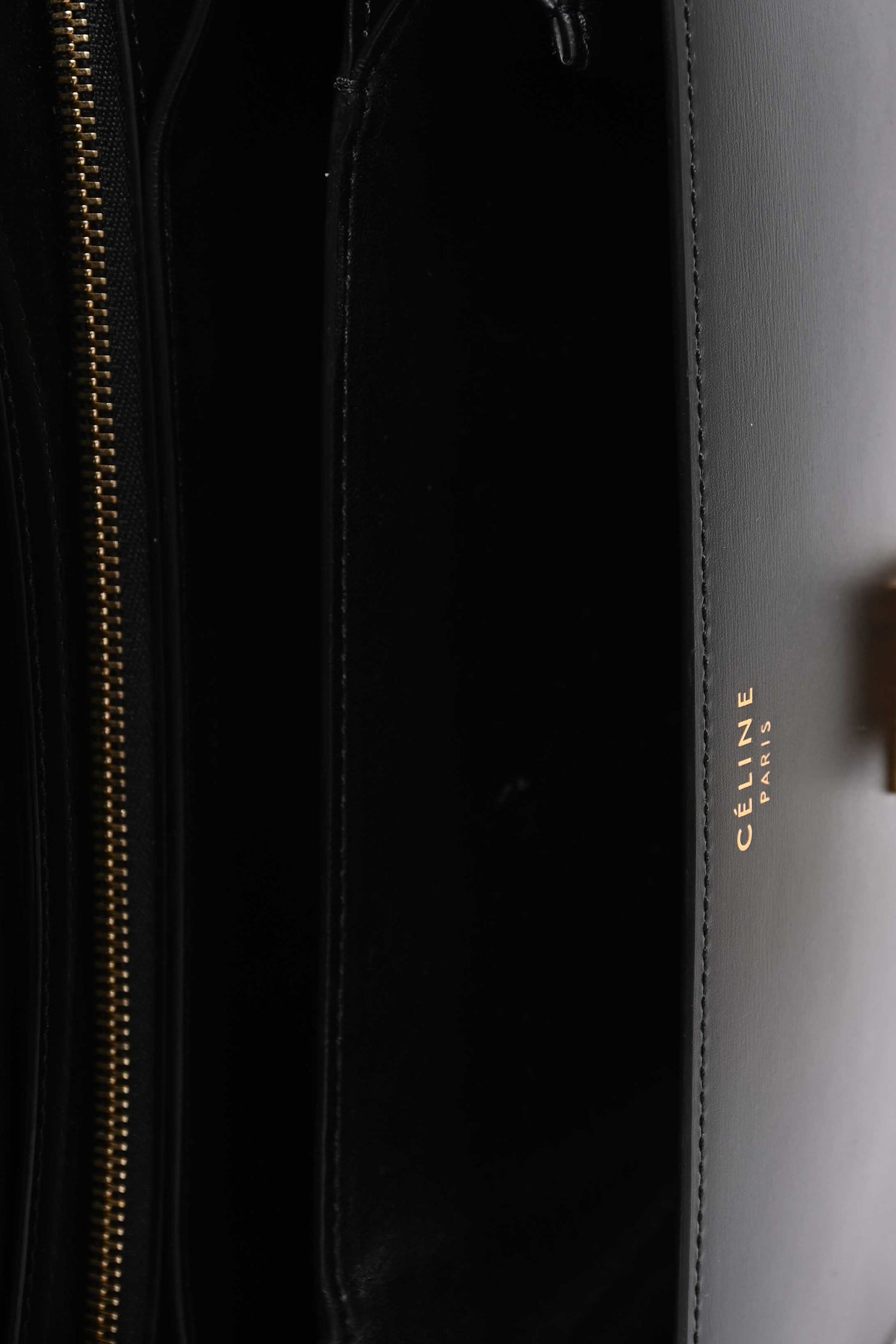 Refresh availabilityCeline 2017 Black Leather Medium Box Bag. Tonal stitching. Fold-over flap. Gold-tone hardware. Fold-over flap. Crossbody strap. Zipped interior compartment. Flip lock closure.