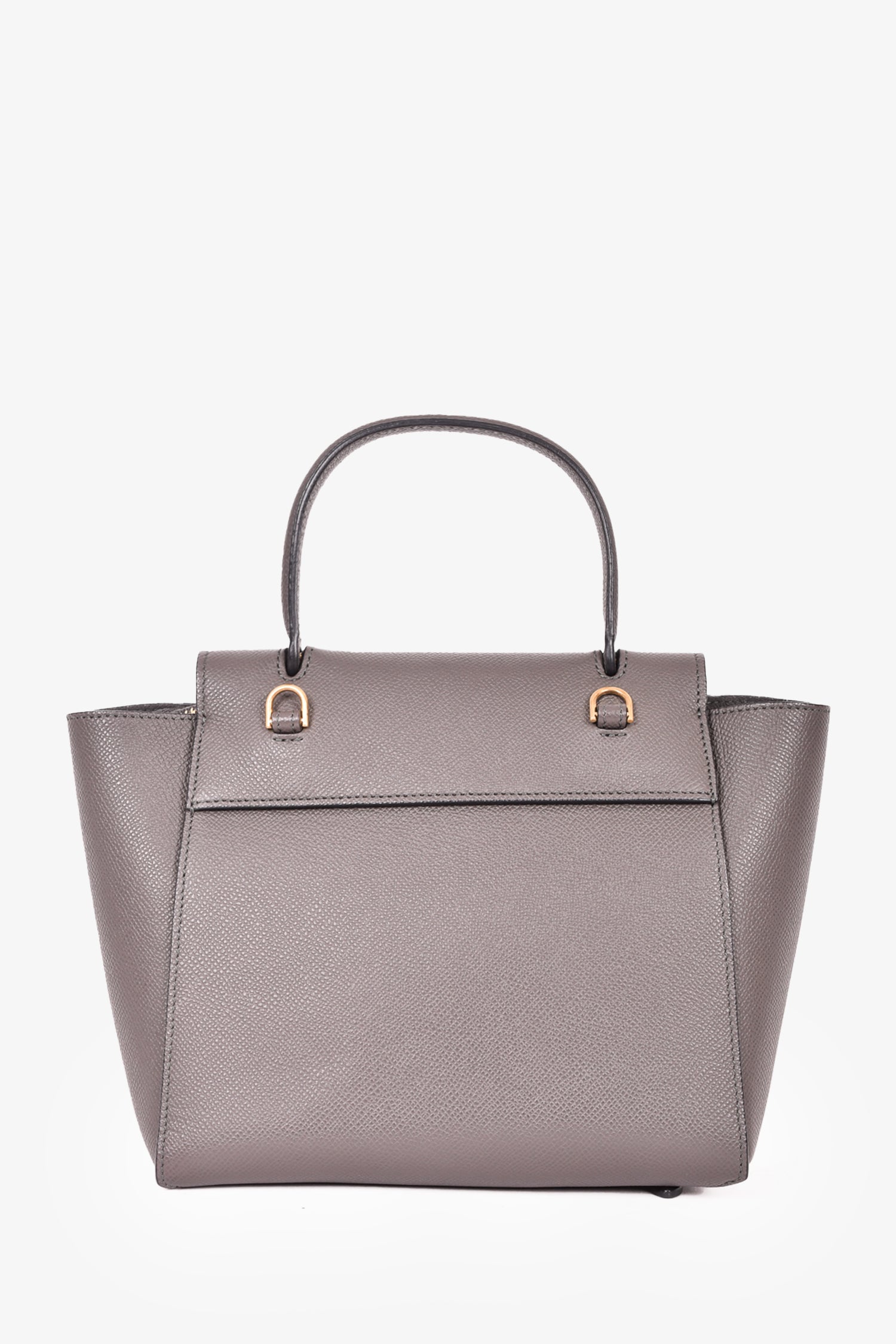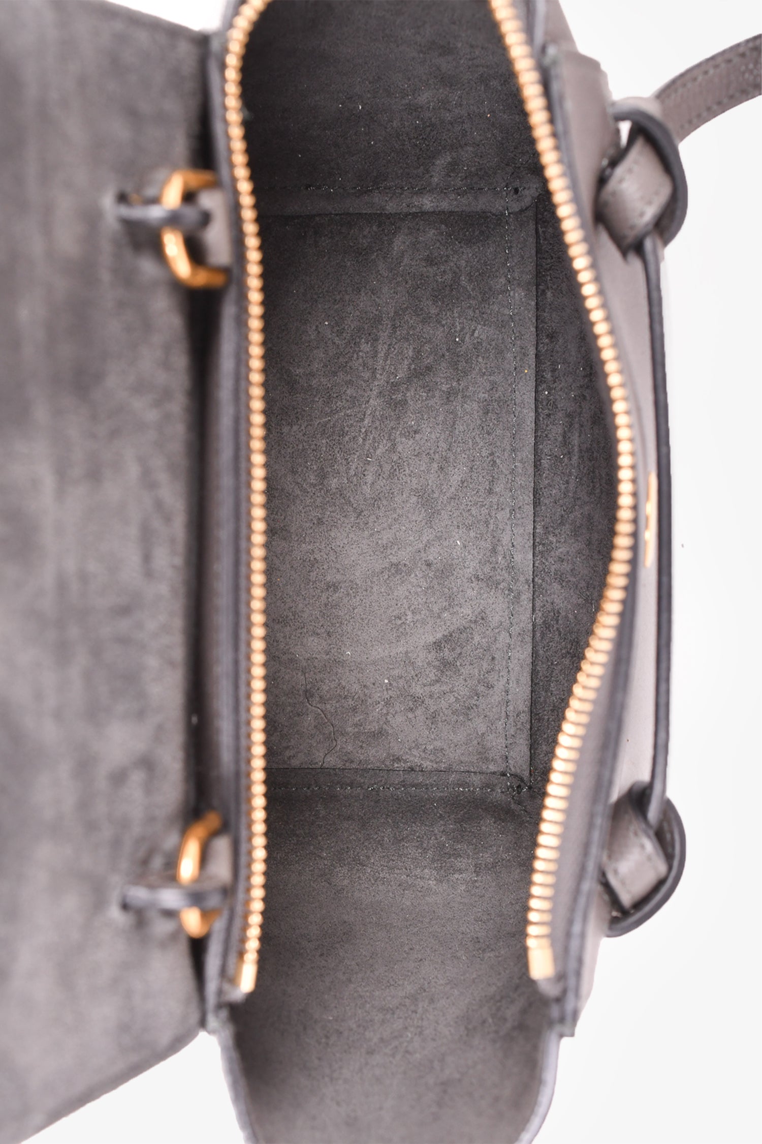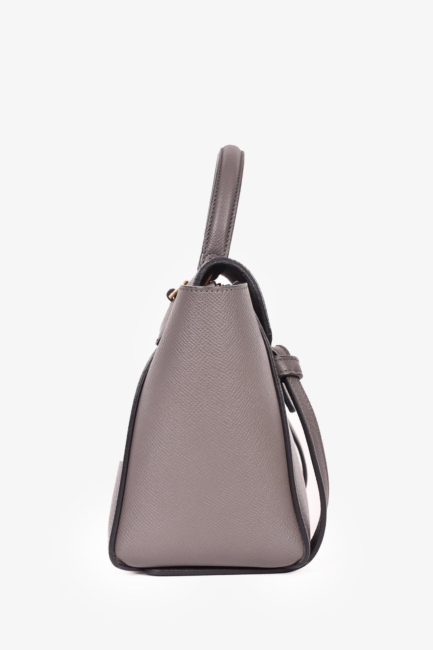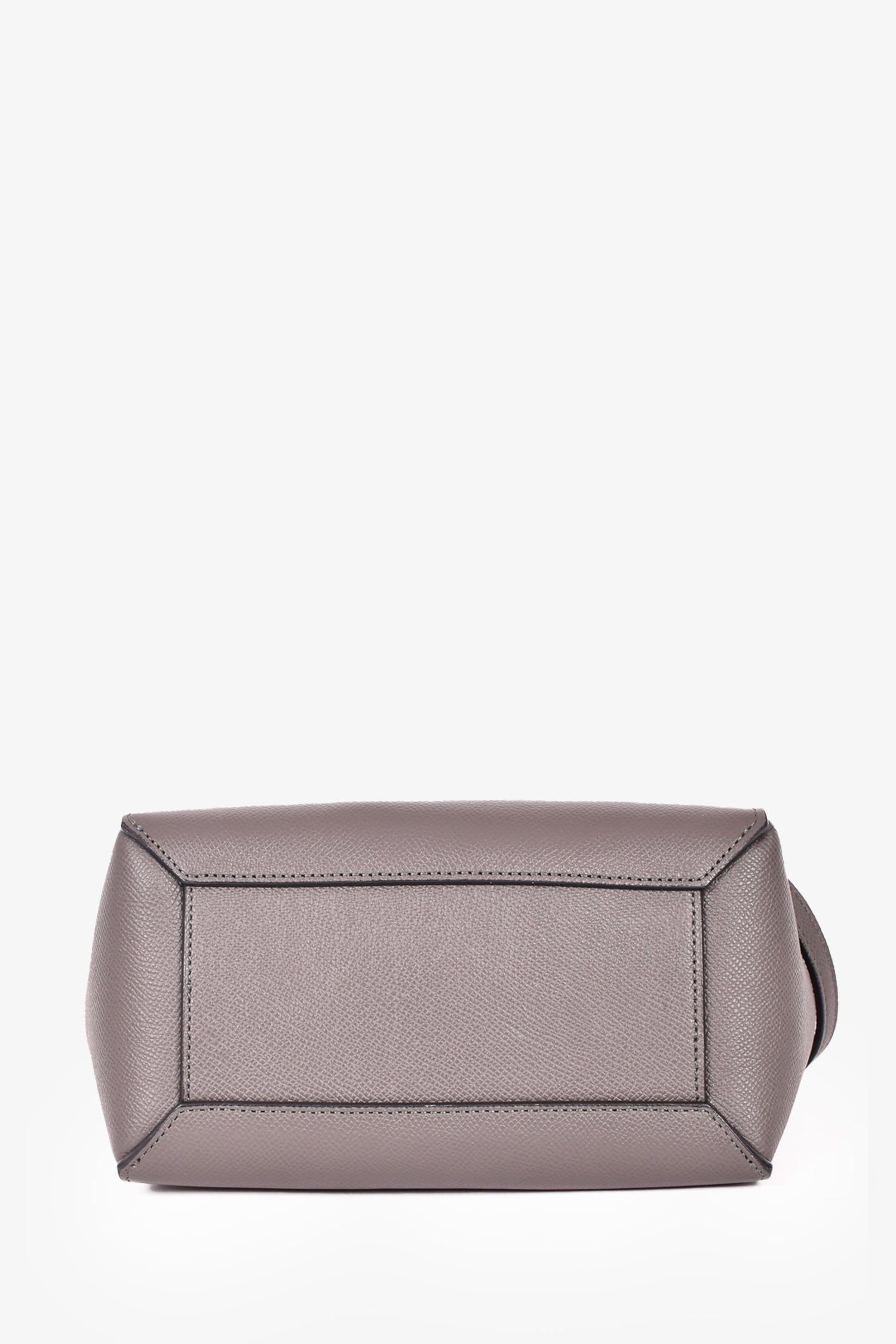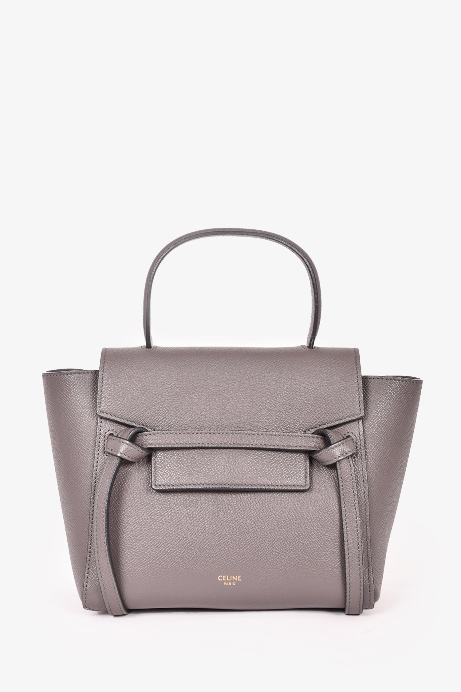 Refresh availabilityCeline 2021 Grey Grained Leather Nano Belt Bag with Strap. Front fold-over flap closure. Top interior zip closure. Tonal open interior. Removable and adjustable strap. Gold-tone hardware. Tonal stitching.