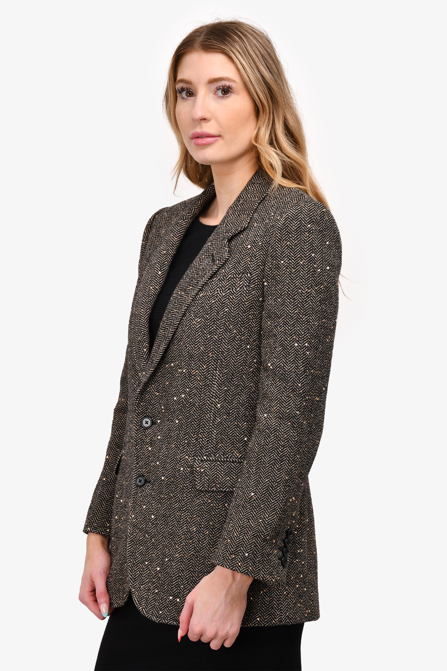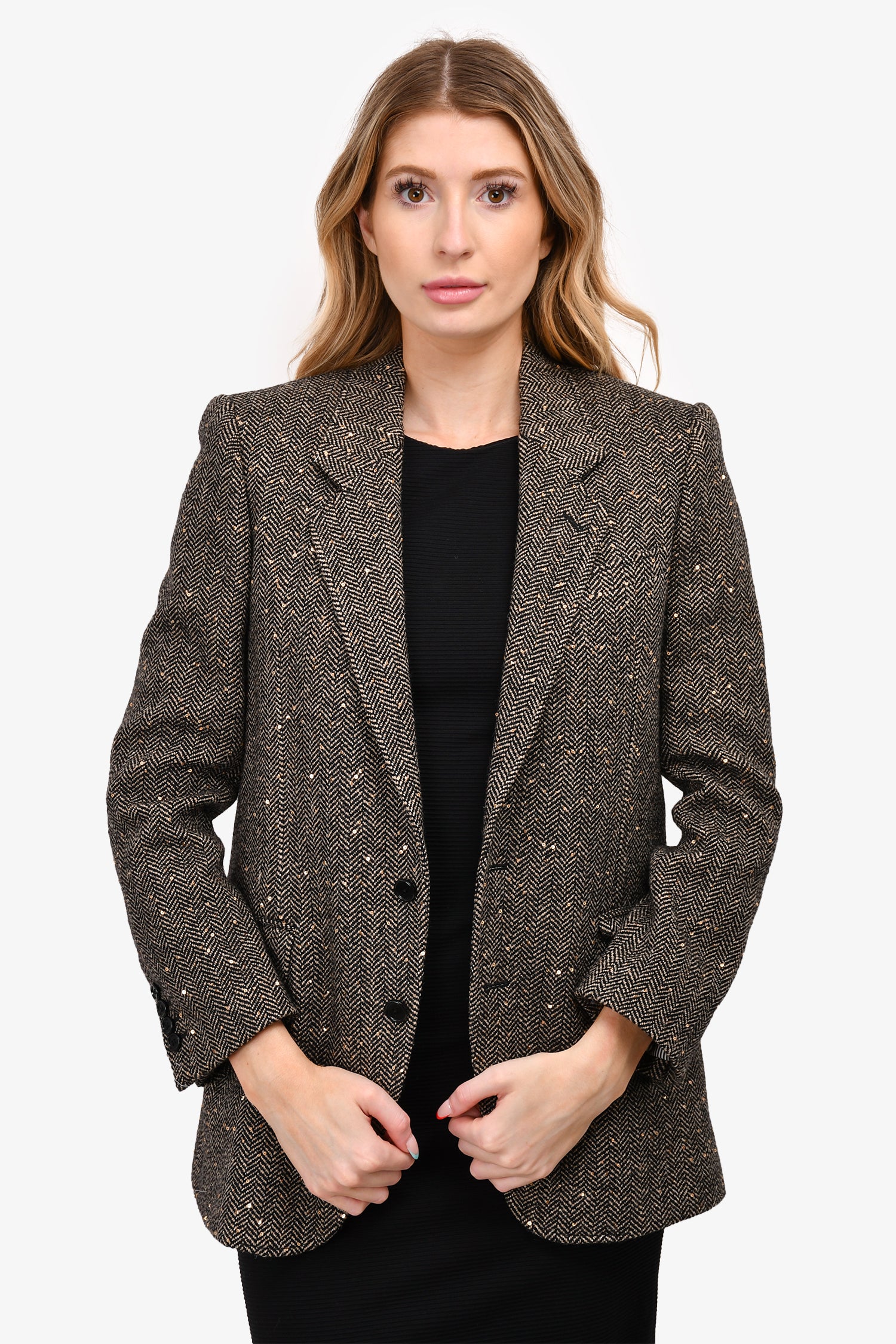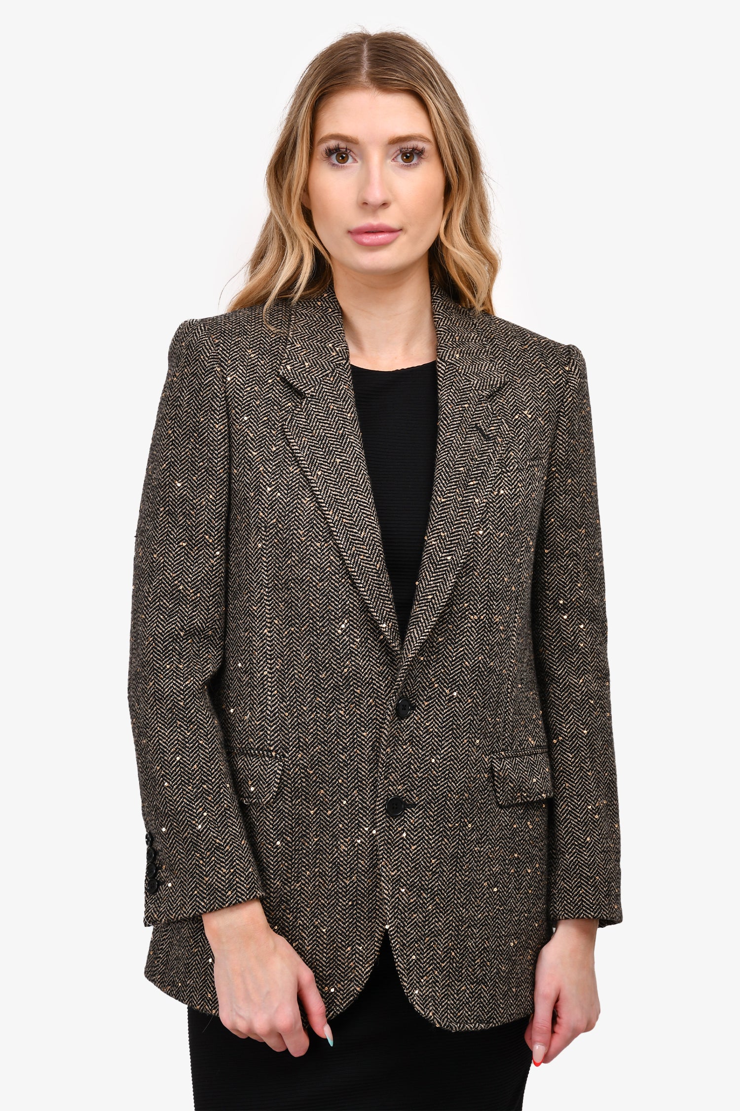 Refresh availabilityCeline Beige/Black Herringbone Wool Blazer With Gold Sequins. Front button up closure. Lined. Tonal stitching.