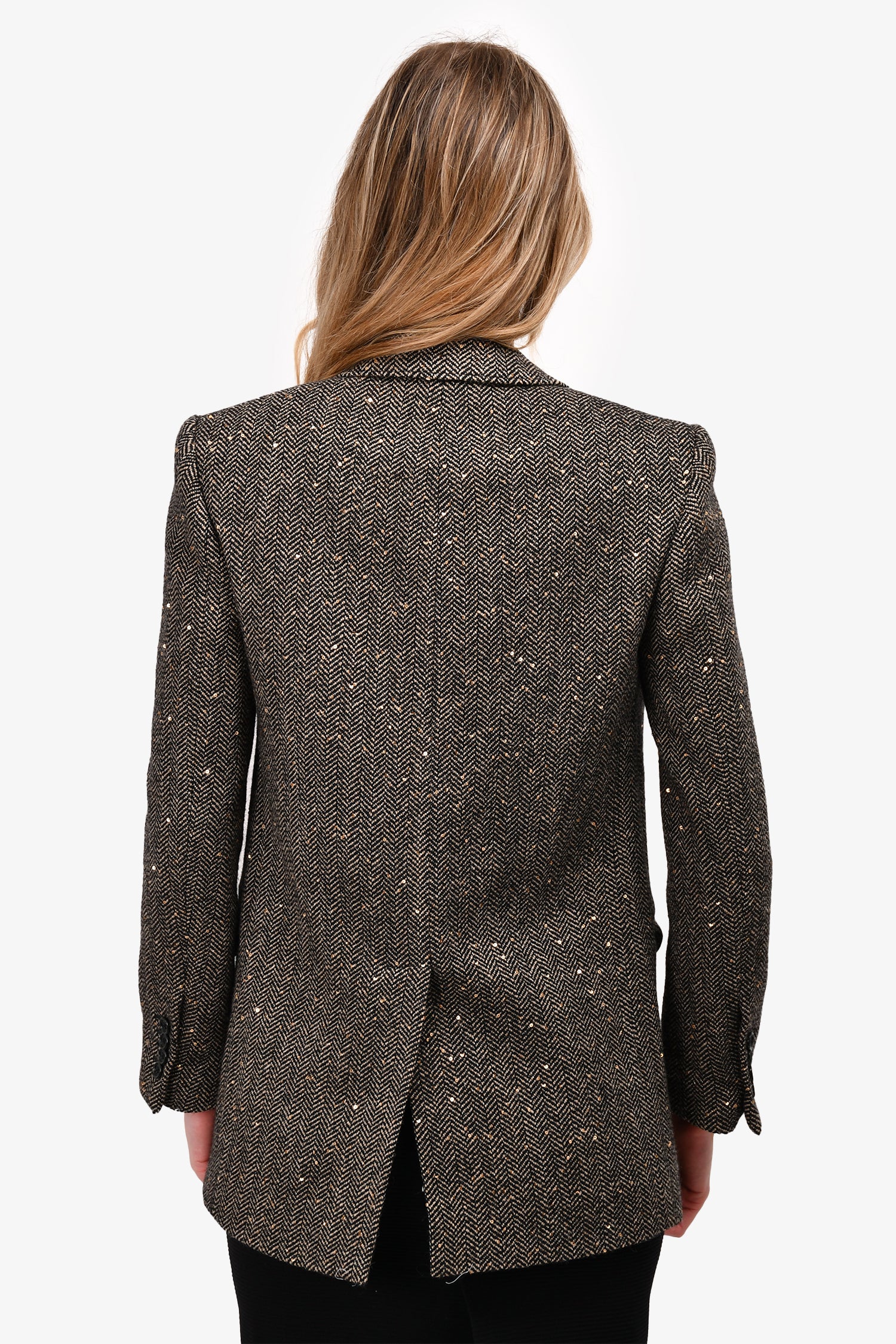 Celine Beige/Black Herringbone Wool Blazer With Gold Sequins Size 34