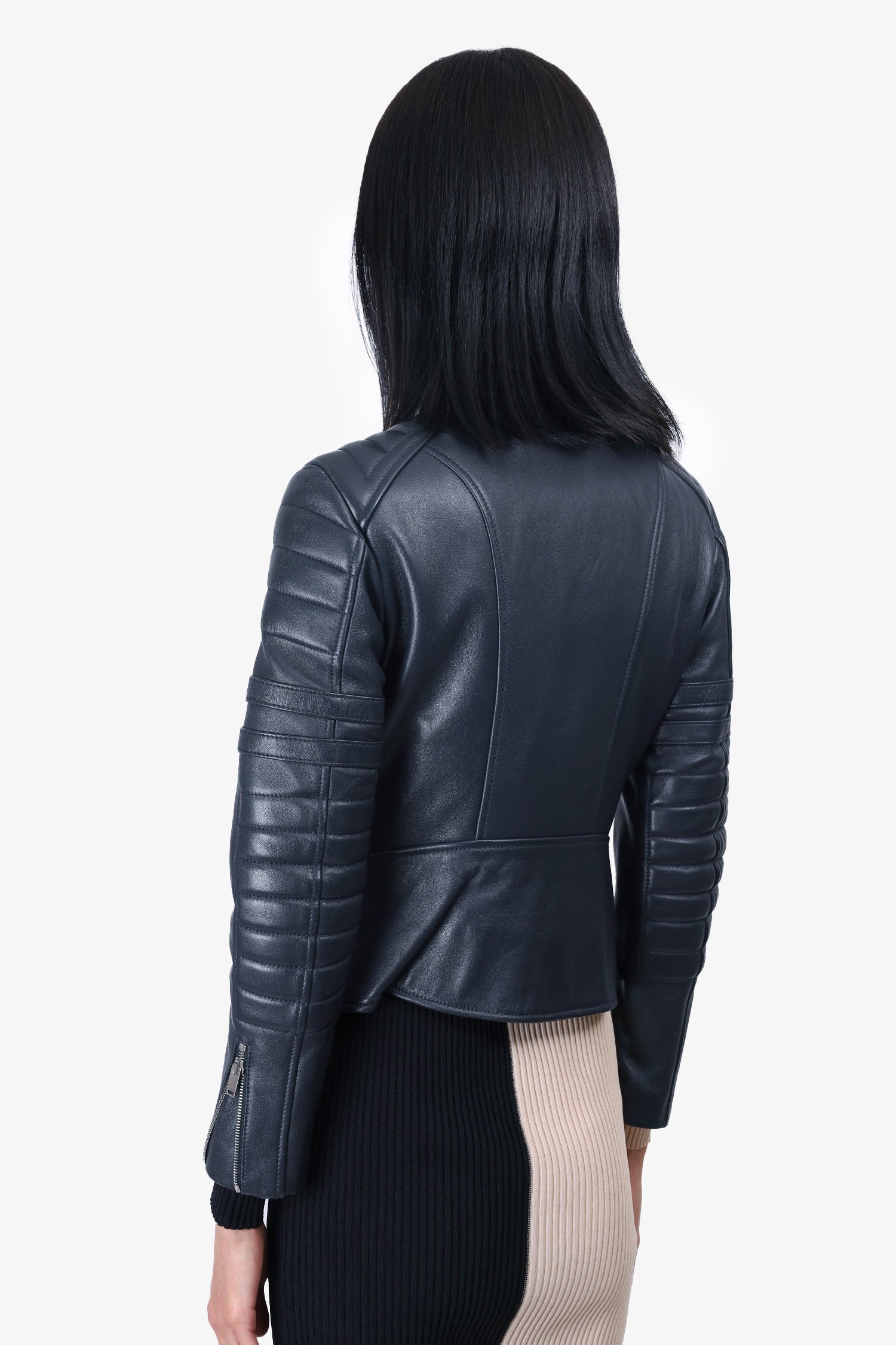 Refresh availabilityCeline Black Leather Biker Jacket. Mock neckline. Front zip closure with single snap button around neckline. 4 front zip pockets. Zip opening detail on sleeve cuffs. Quilted detailing on sleeves. 4 front adjustable buckle straps around waistline. Corduroy detail around interior neckline. Silver-tone hardware. Lined. Tonal stitching.