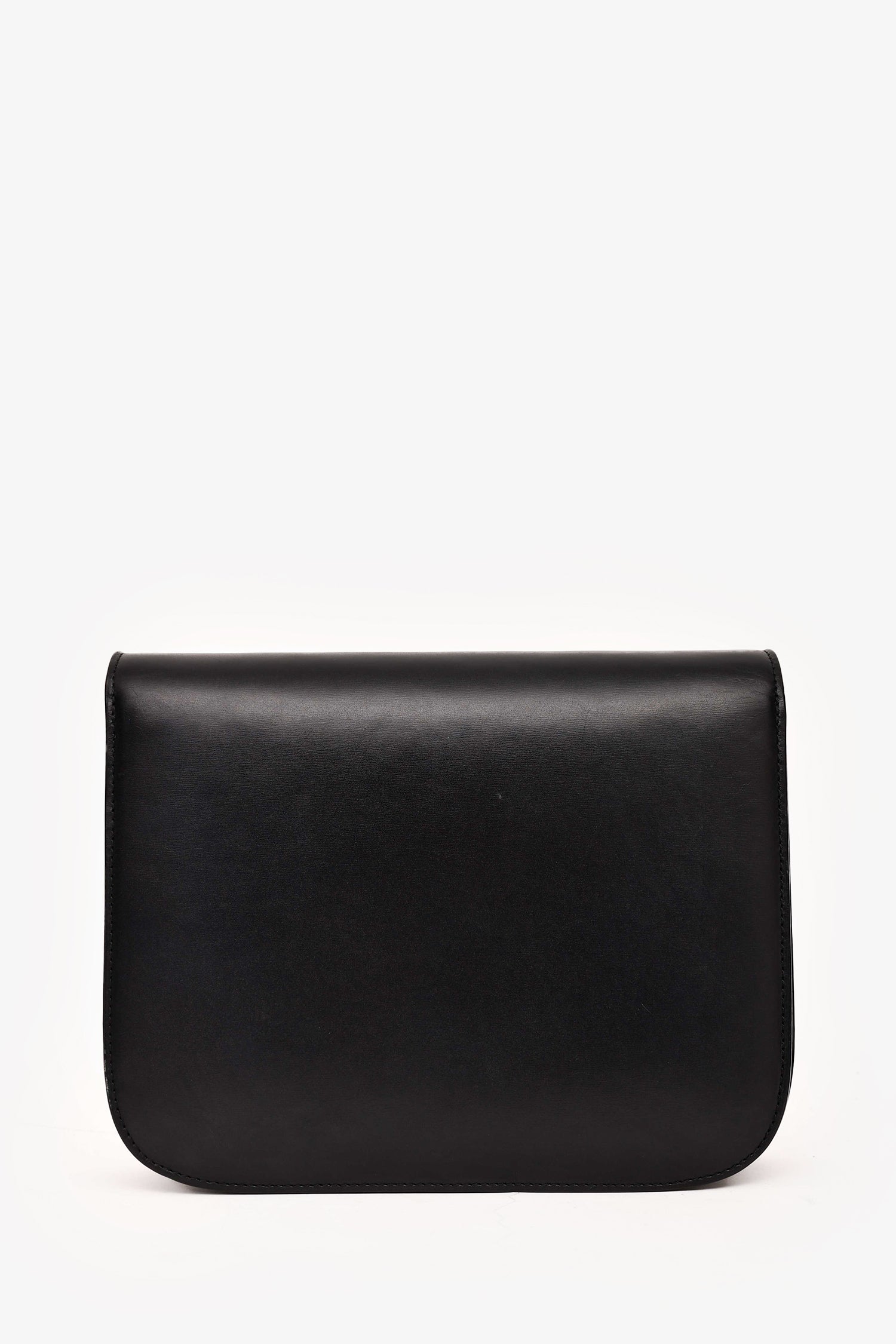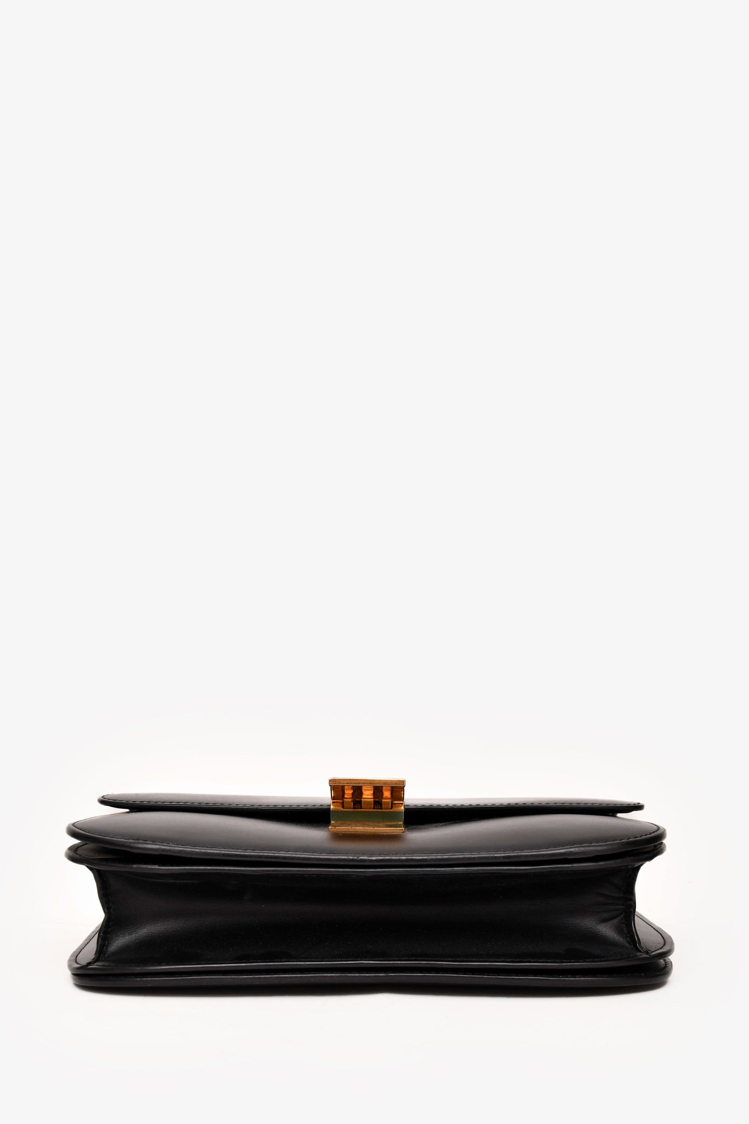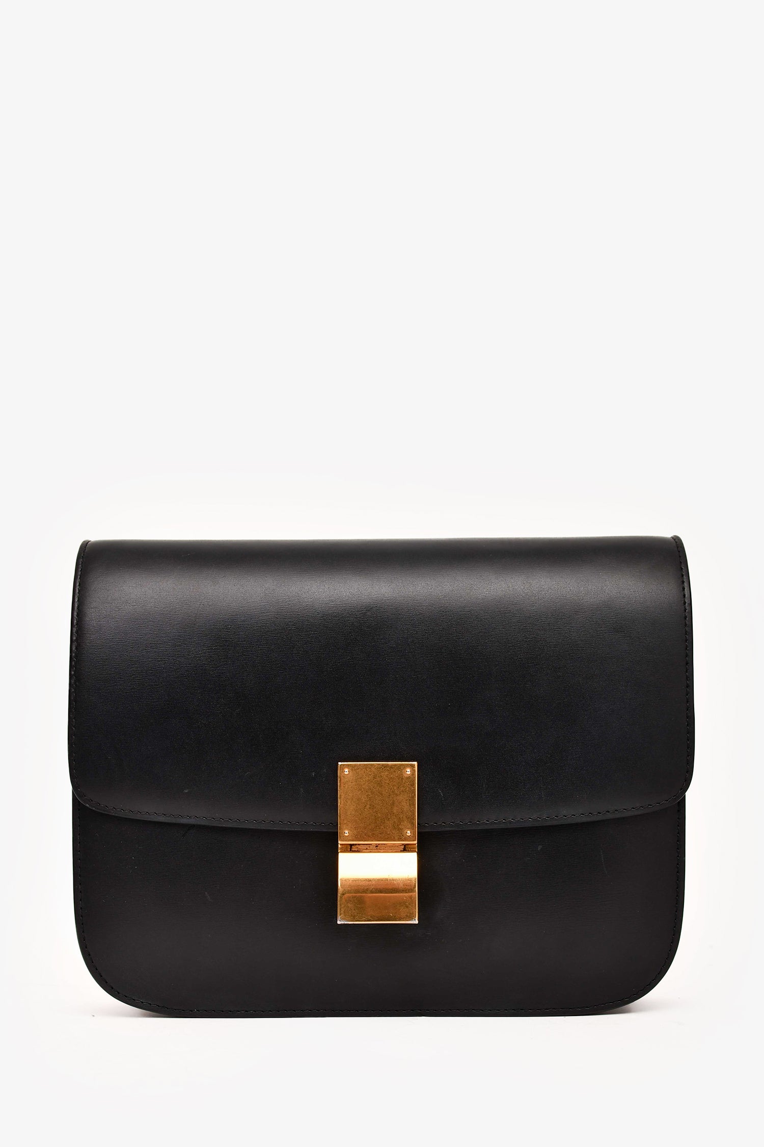 Refresh availabilityCeline Black Leather Medium Box Crossbody. Front fold-over flap with push-lock closure. Adjustable crossbody strap. 3 interior compartments. Single wall compartment with zip closure. 2 interior slip pockets. Gold-toned hardware. Tonal stitching.