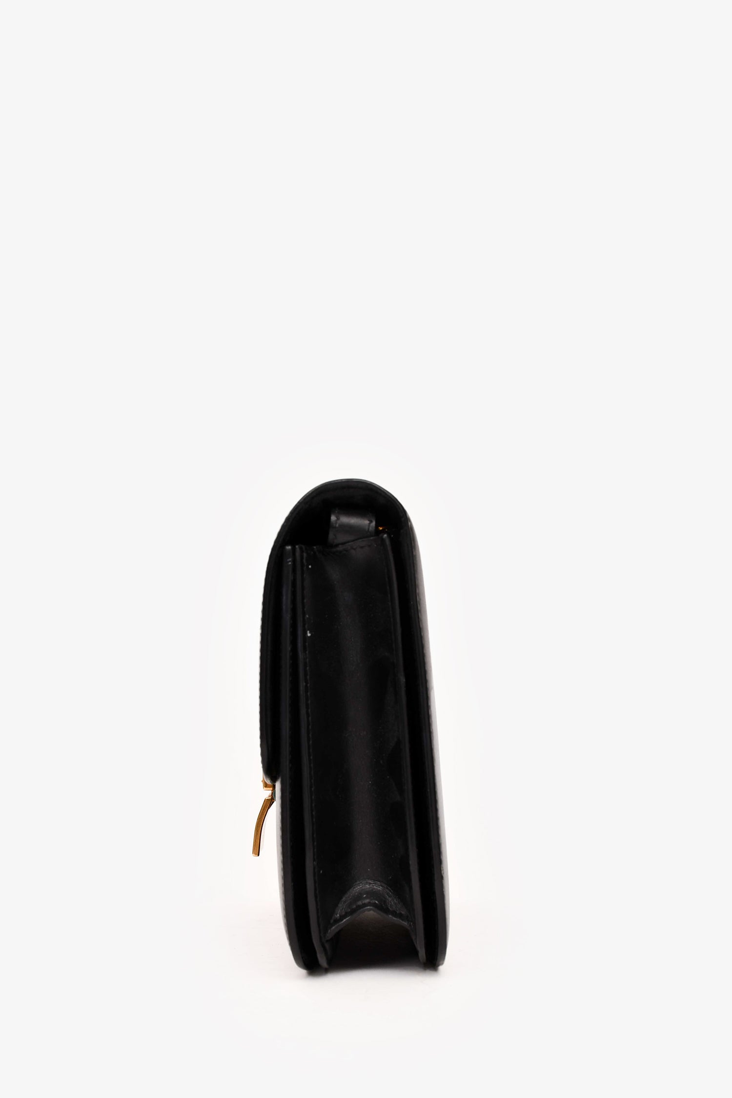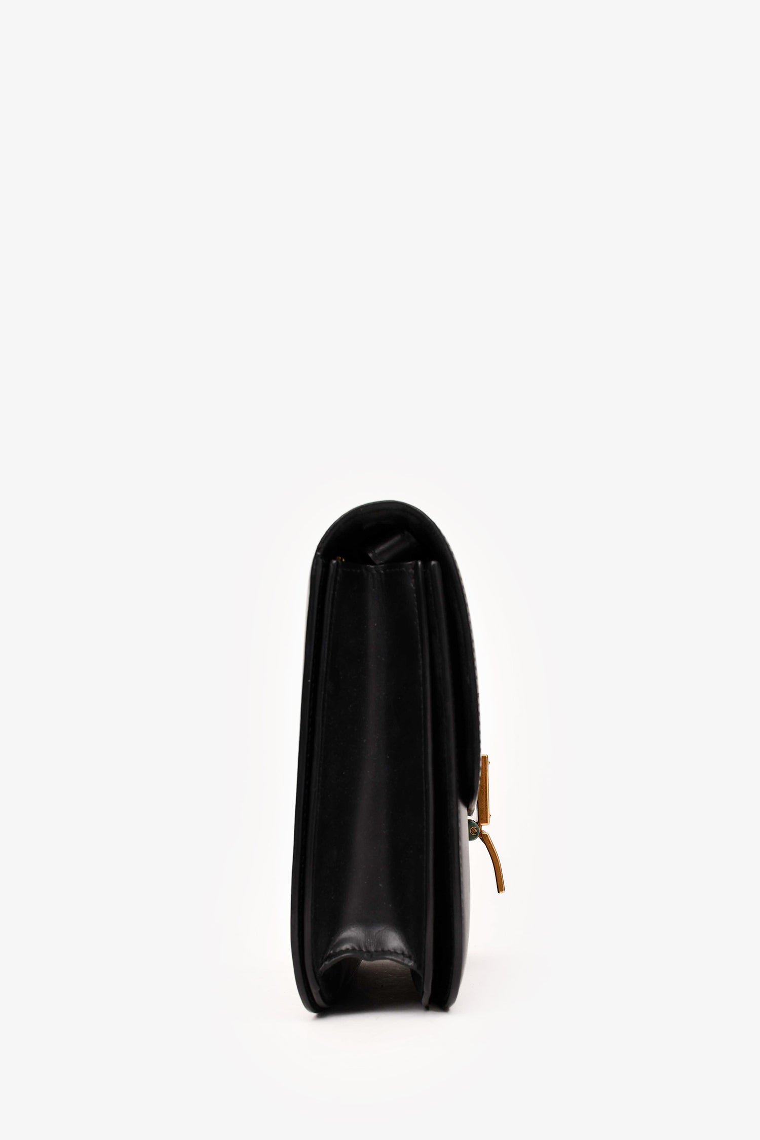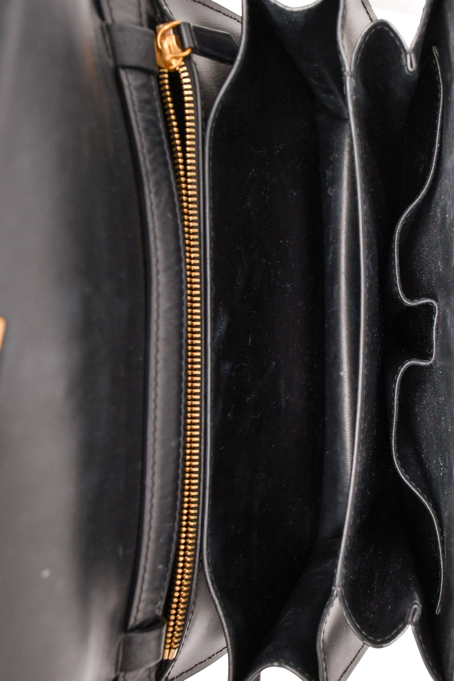 Refresh availabilityCeline Black Leather Medium Box Crossbody. Front fold-over flap with push-lock closure. Adjustable crossbody strap. 3 interior compartments. Single wall compartment with zip closure. 2 interior slip pockets. Gold-toned hardware. Tonal stitching.