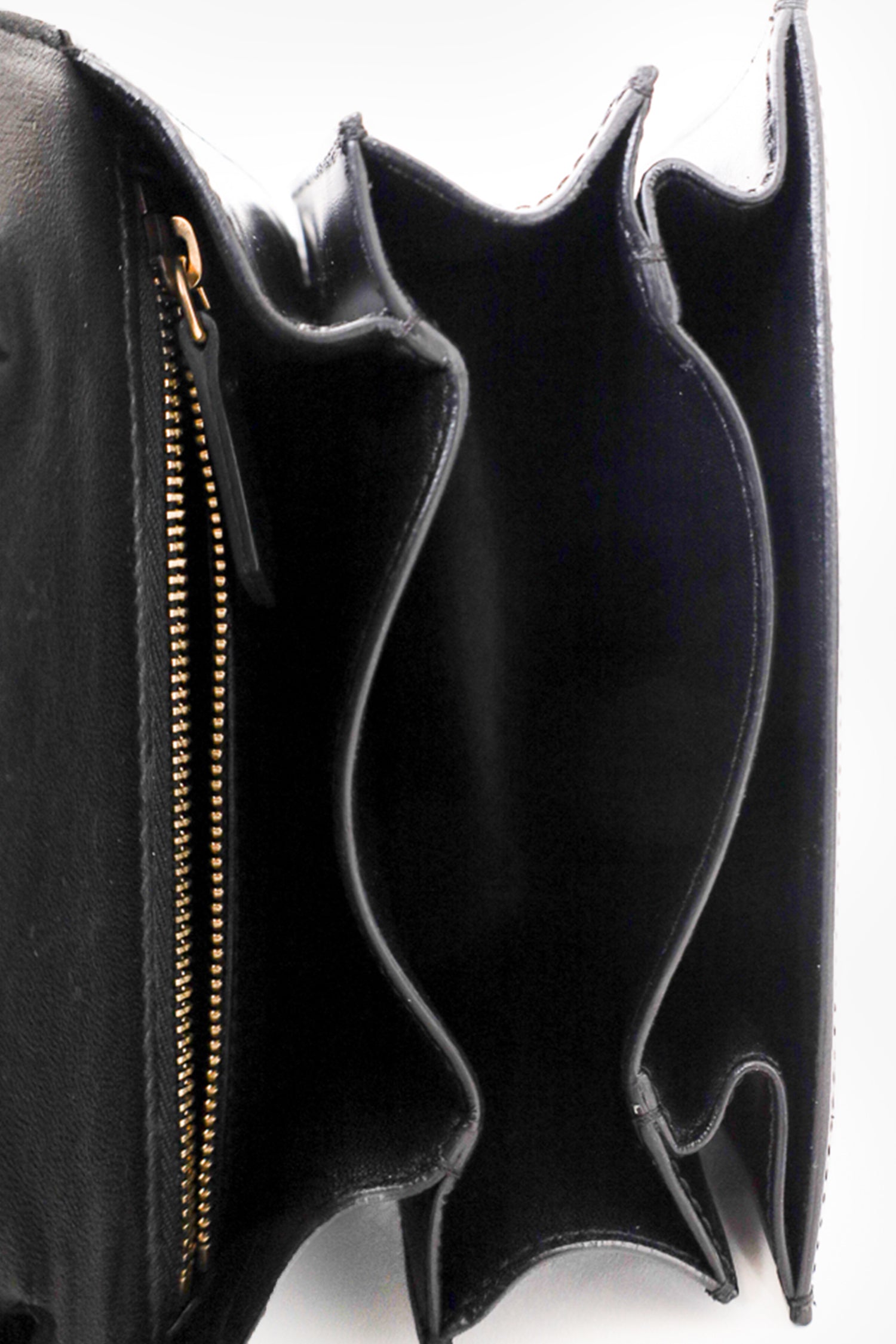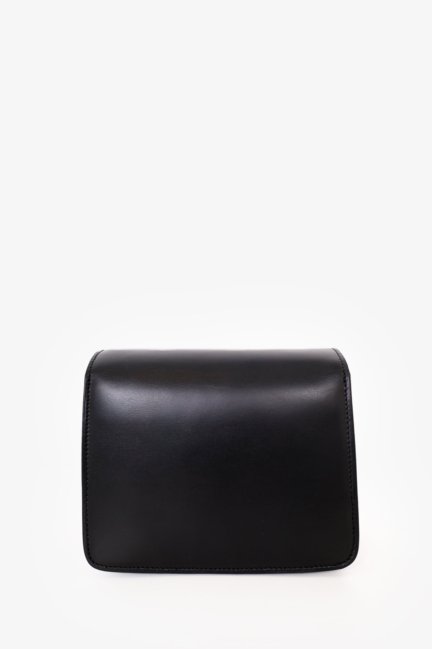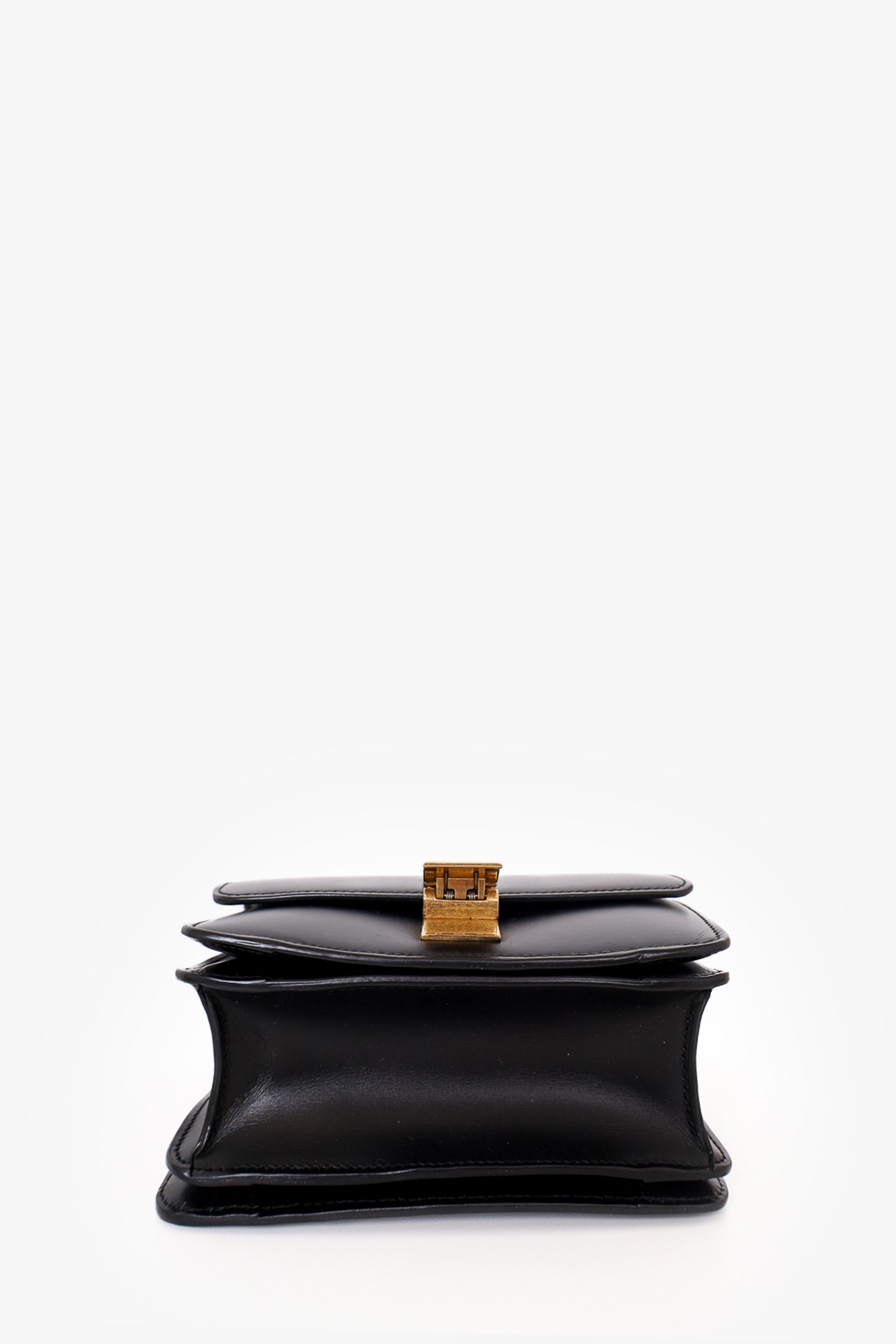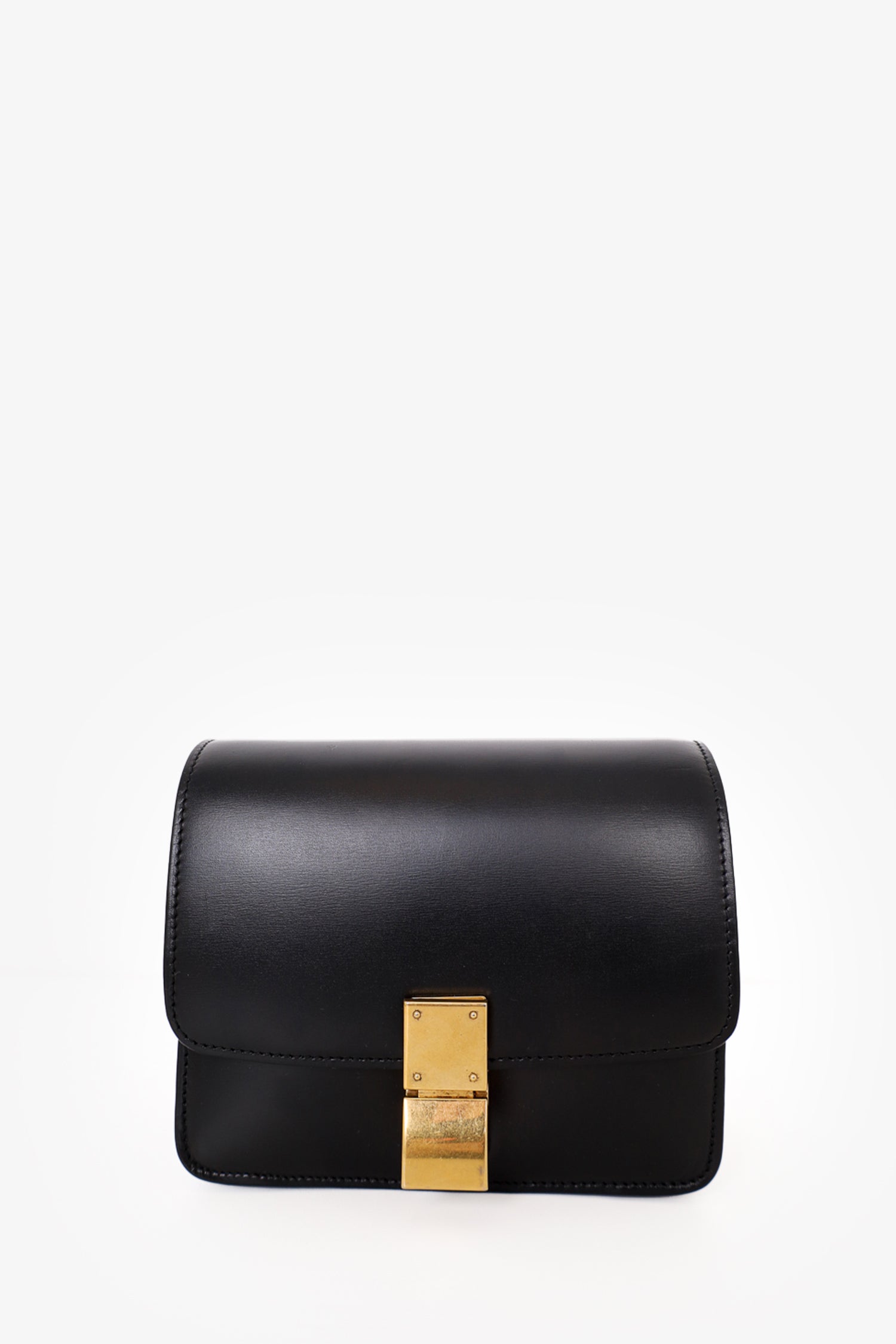 Refresh availabilityCeline Black Leather Small Box Bag. Front fold over flap with push clasp lock. 3 interior sections. Single wall pocket with zipper closure. Adjustable cross-body strap. Gold-tone hardware. Tonal stitching.