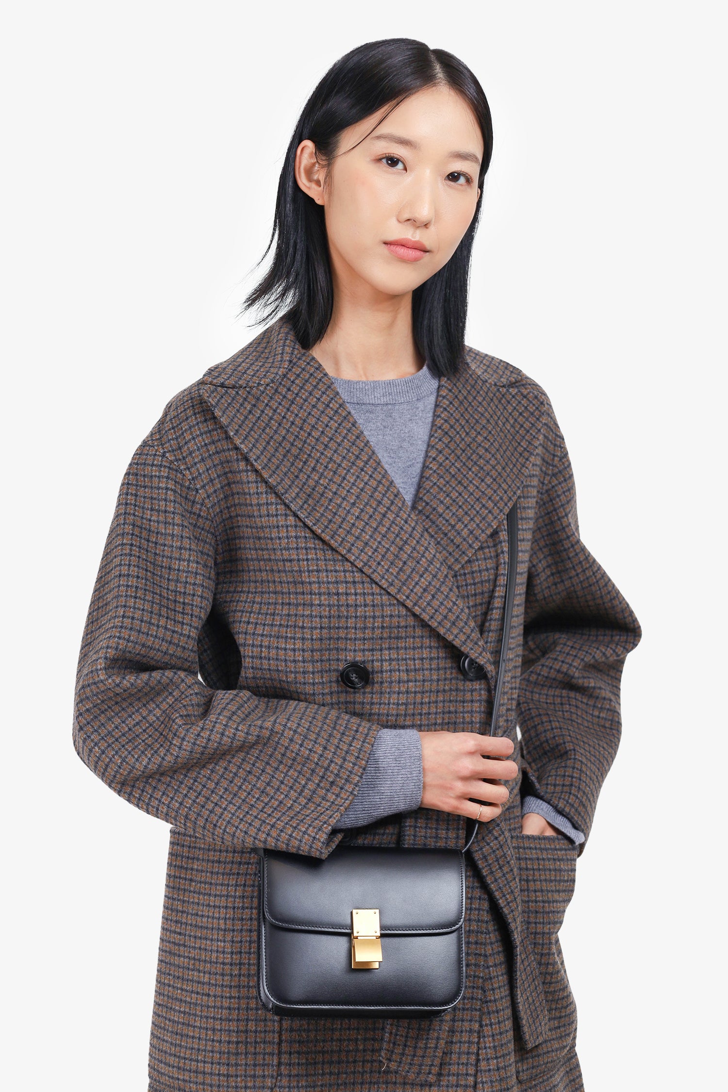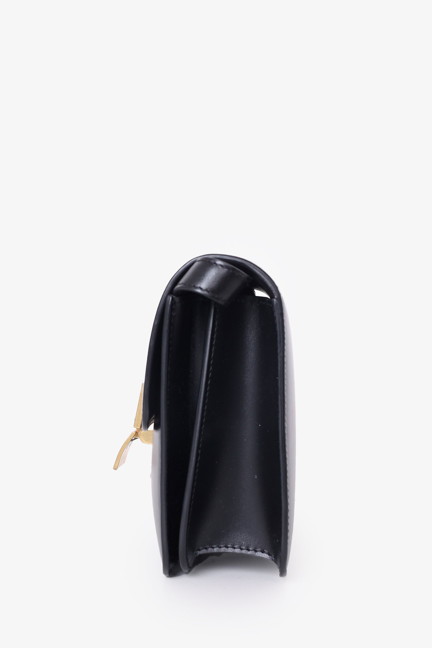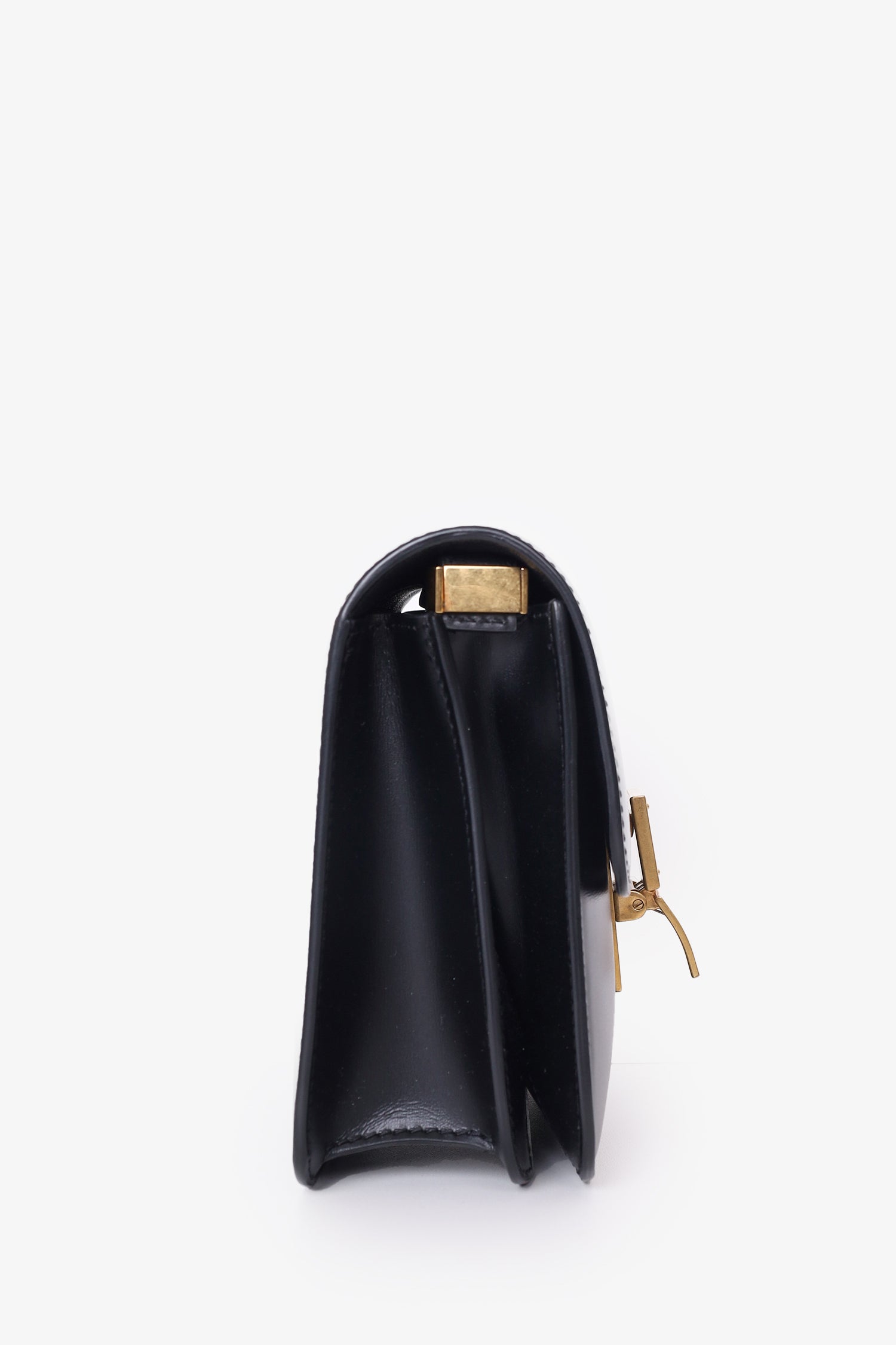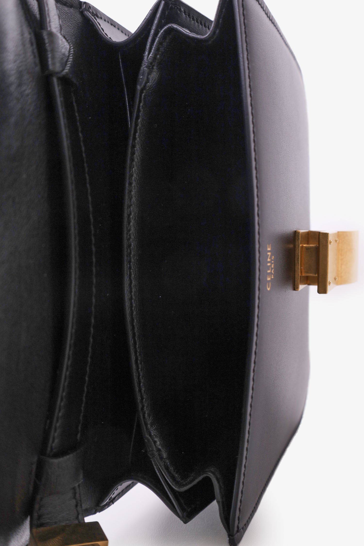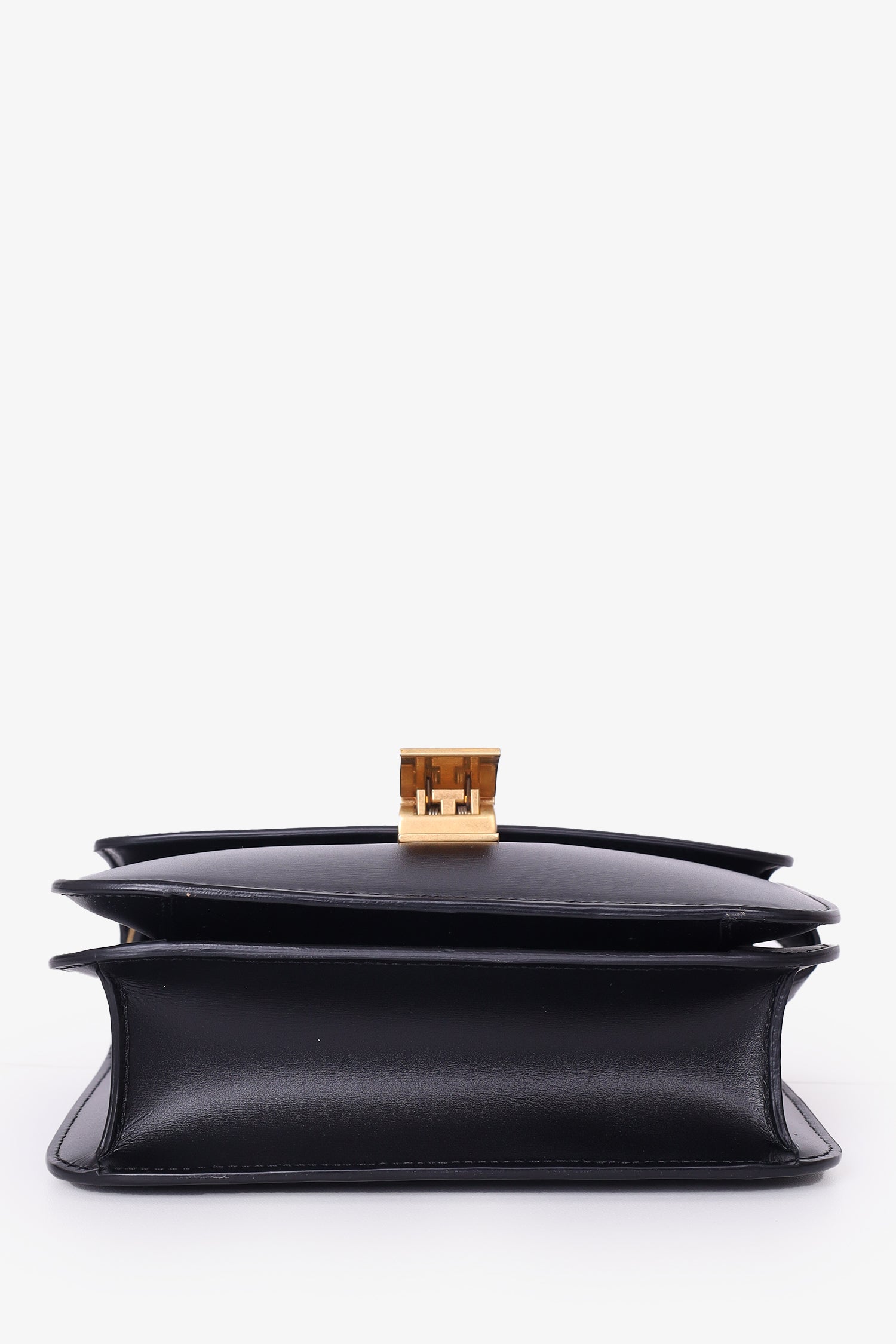 Refresh availabilityCeline Black Leather Small Box Crossbody Bag. Front fold-over flap. Push down lock closure. Interior wall slip pocket. Gold tone hardware. Adjustable crossbody strap. Tonal stitching.