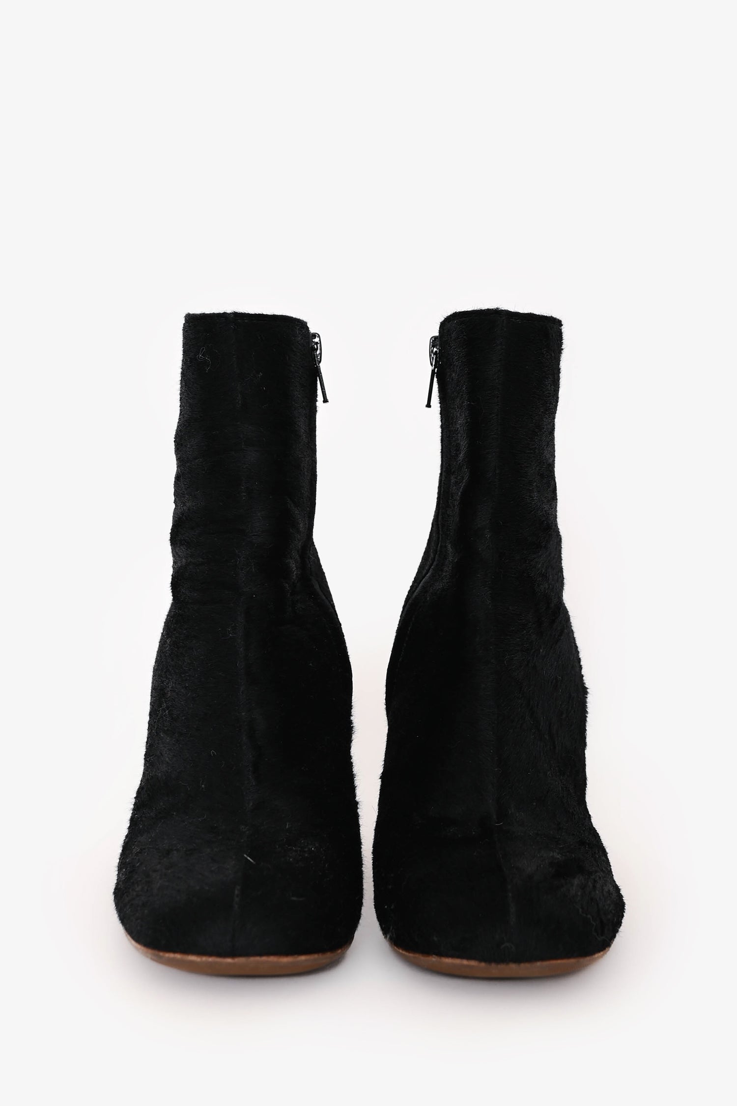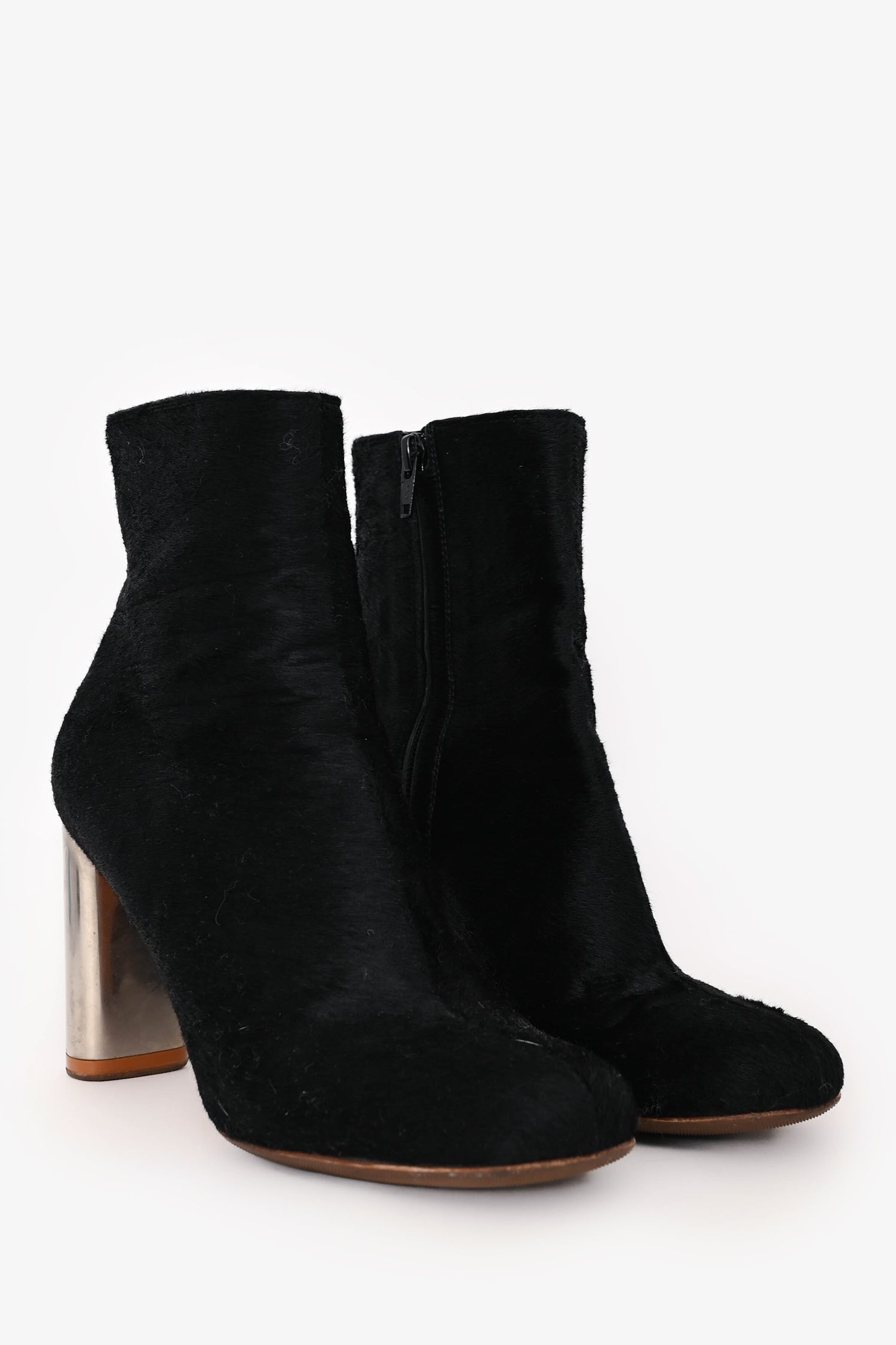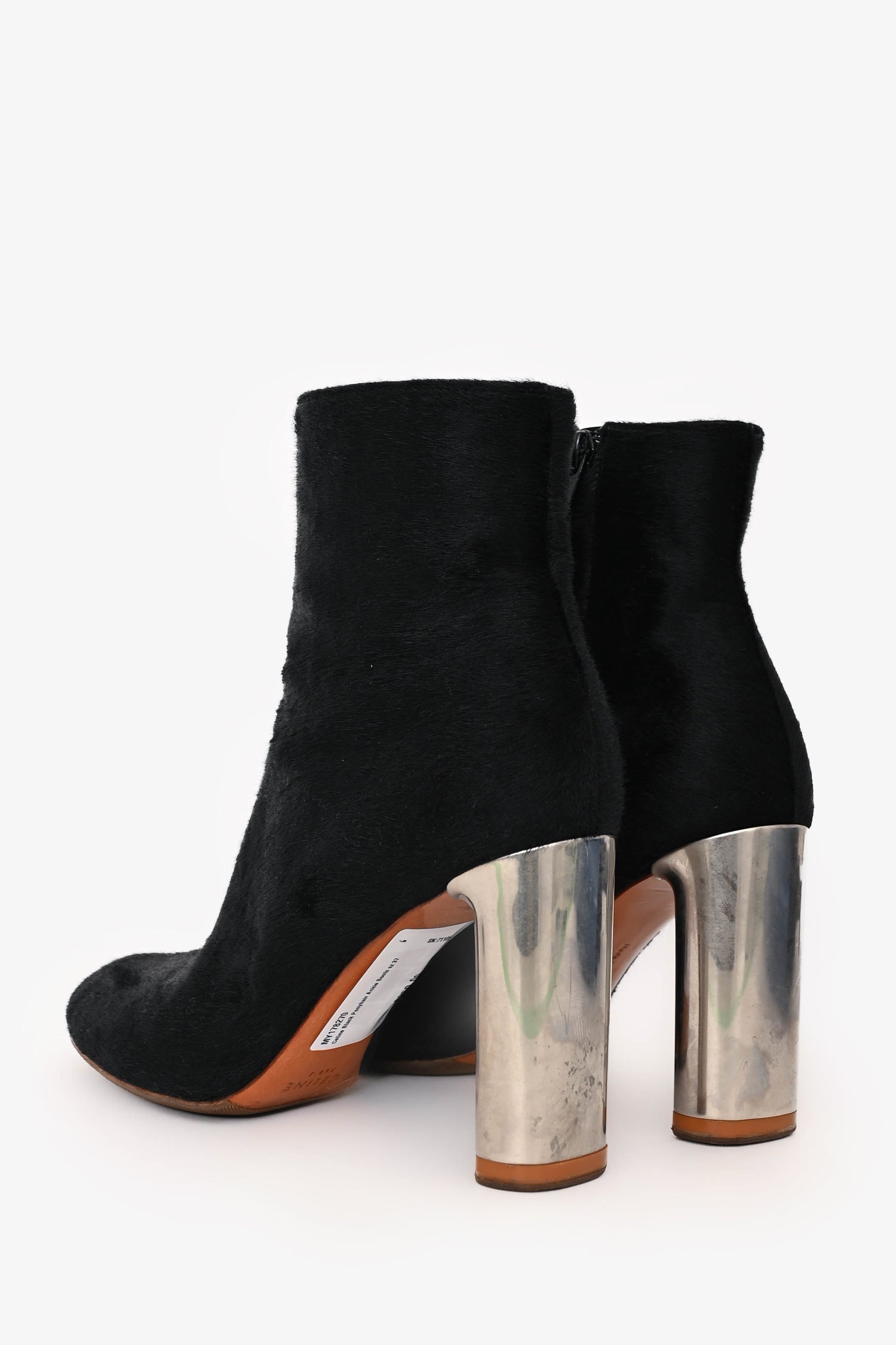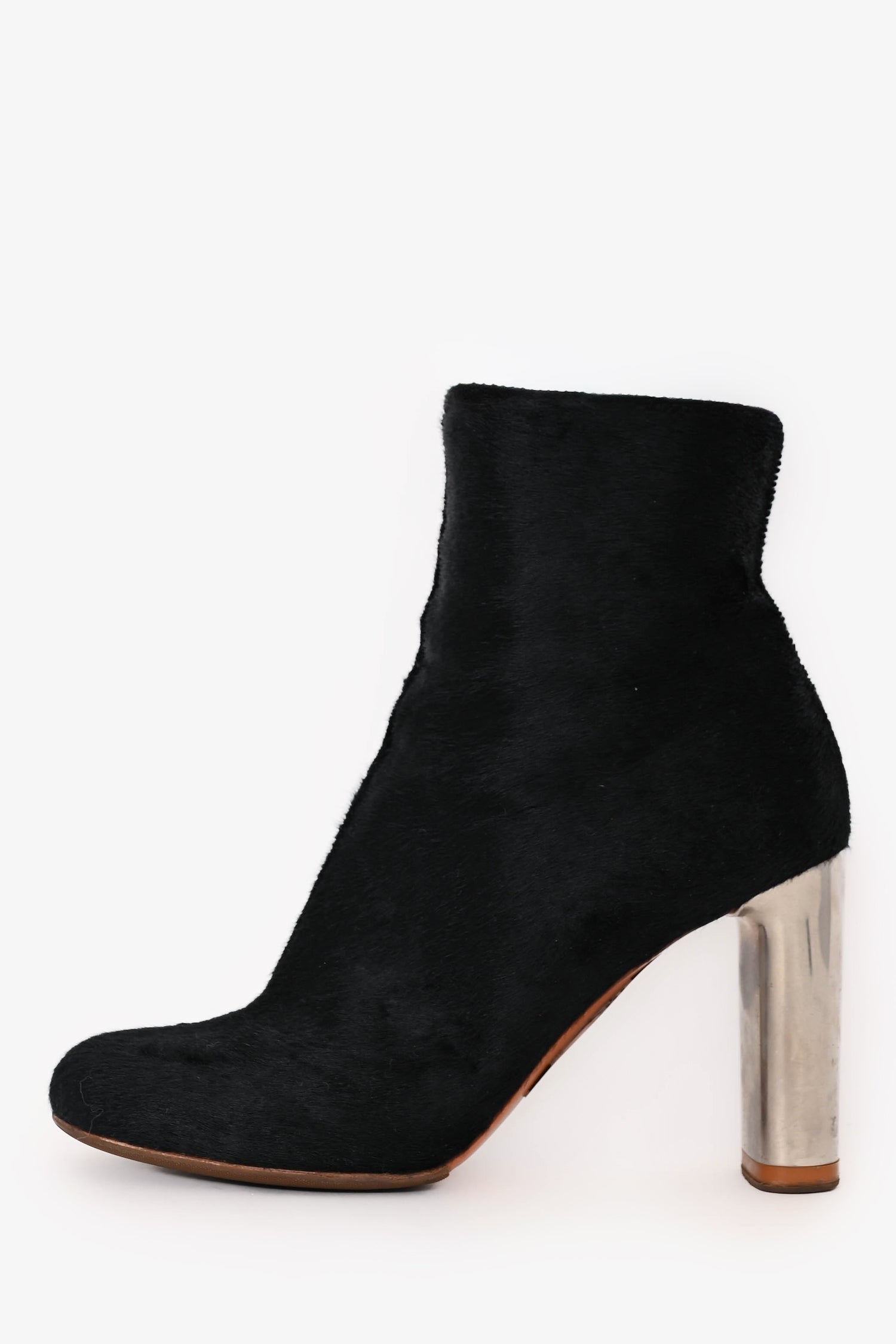 Refresh availabilityCeline Black Ponyhair Ankle Boots. Slip-on. Round toe. Side zip closure. Silver-tone hardware. Tonal stitching.