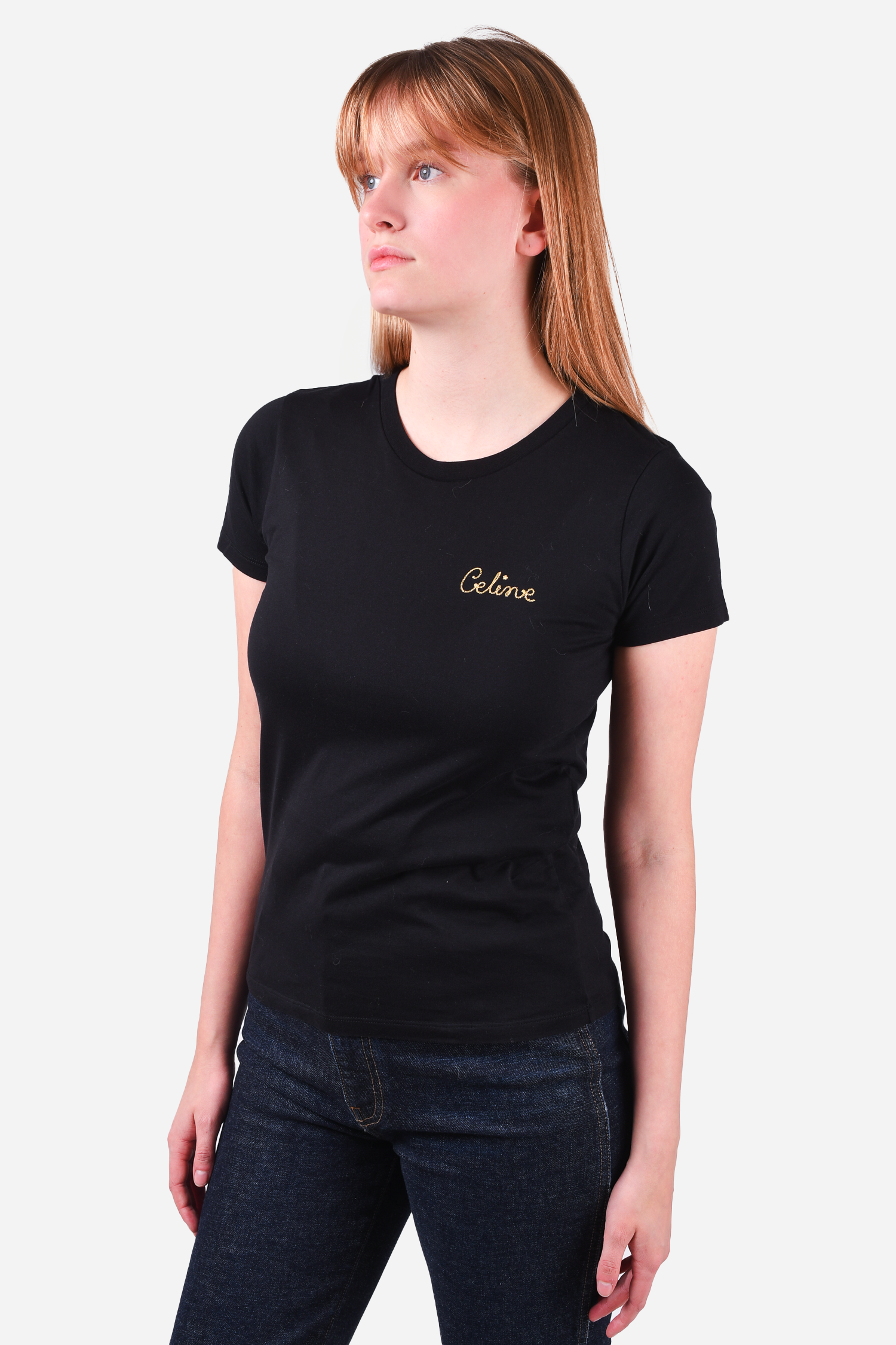 Refresh availabilityCeline Black T-Shirt with Gold Embroidered Logo. Round neckline. Tonal stitching.
