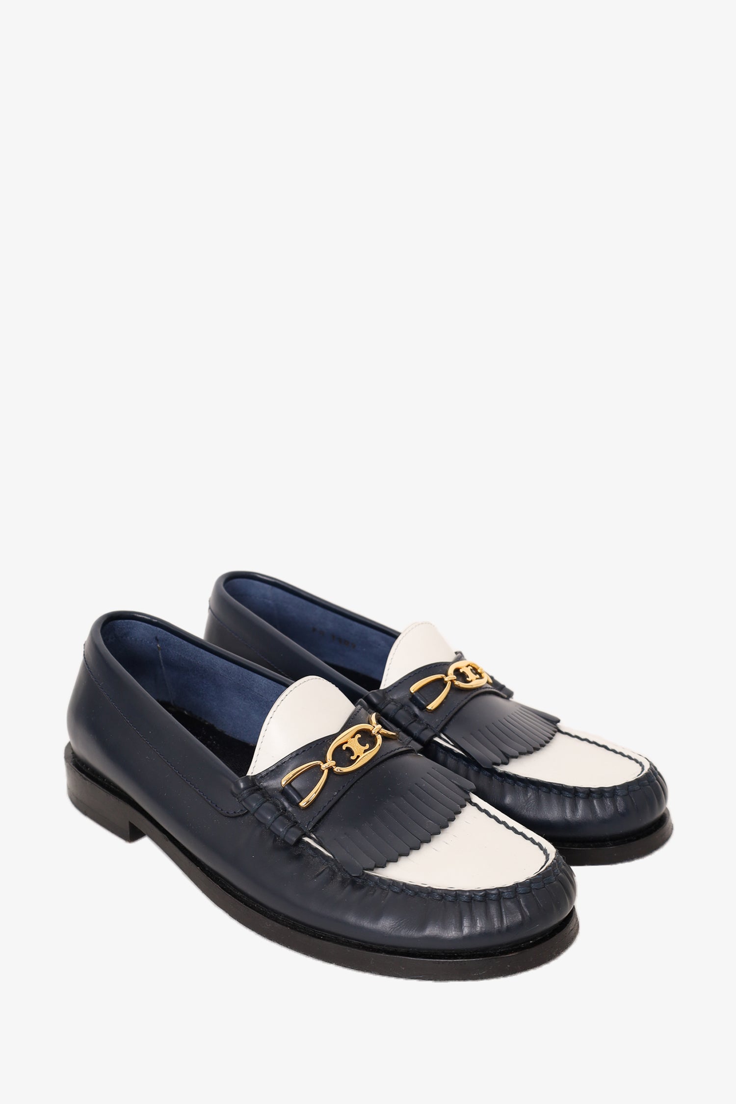 Celine Black/White Leather Triomphe Loafers. Round toe. Slip on. Gold-tone hardware. Tonal stitching.