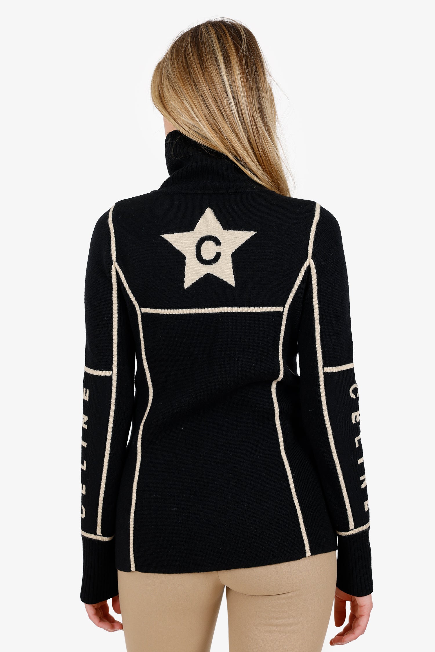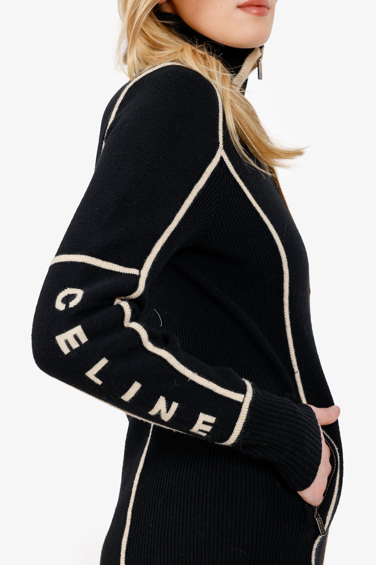 Refresh availabilityCeline Black/White Logo Knit Zip-up Cardigan. Pull-on. High neckline. 2-way front zip-up closure. 2 front zip-up pockets. Gunmetal-tone hardware. Tonal stitching.