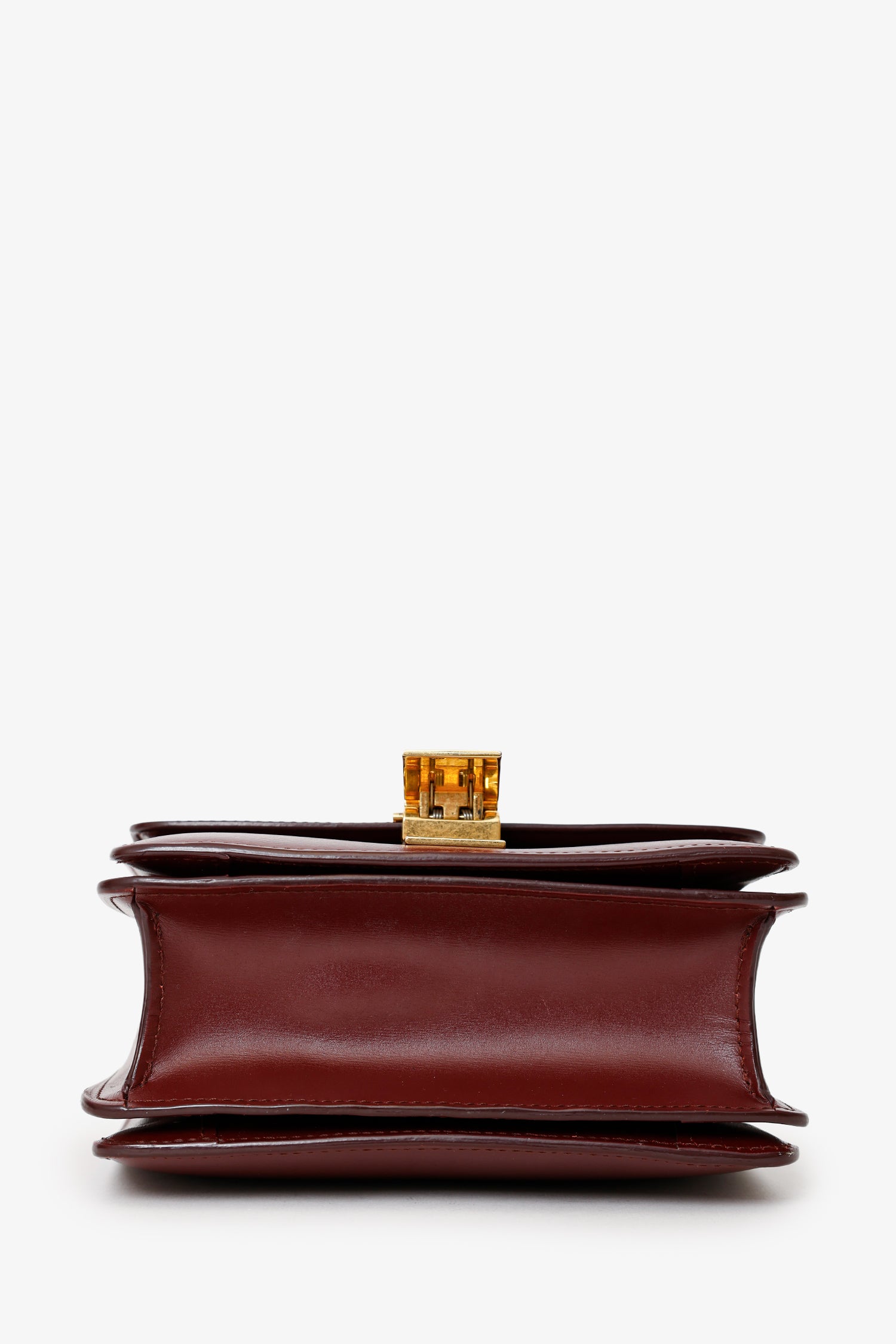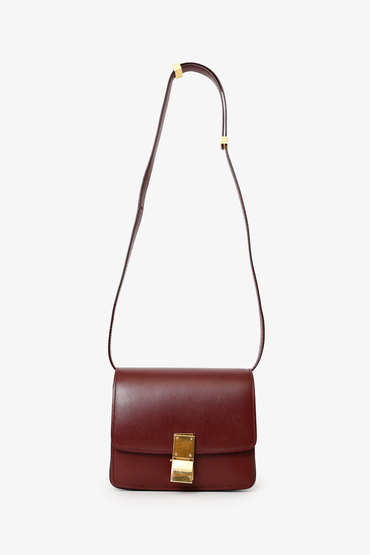 Refresh availabilityCeline Burgundy Leather Small Box Bag. Front fold-over flap with flip-lock closure. Removable shoulder strap with adjustable pull-through push-pin closure. Leather-lined interior with 4 pockets; 3 slip, and 1 zip. Gold-tone hardware. Tonal stitching.