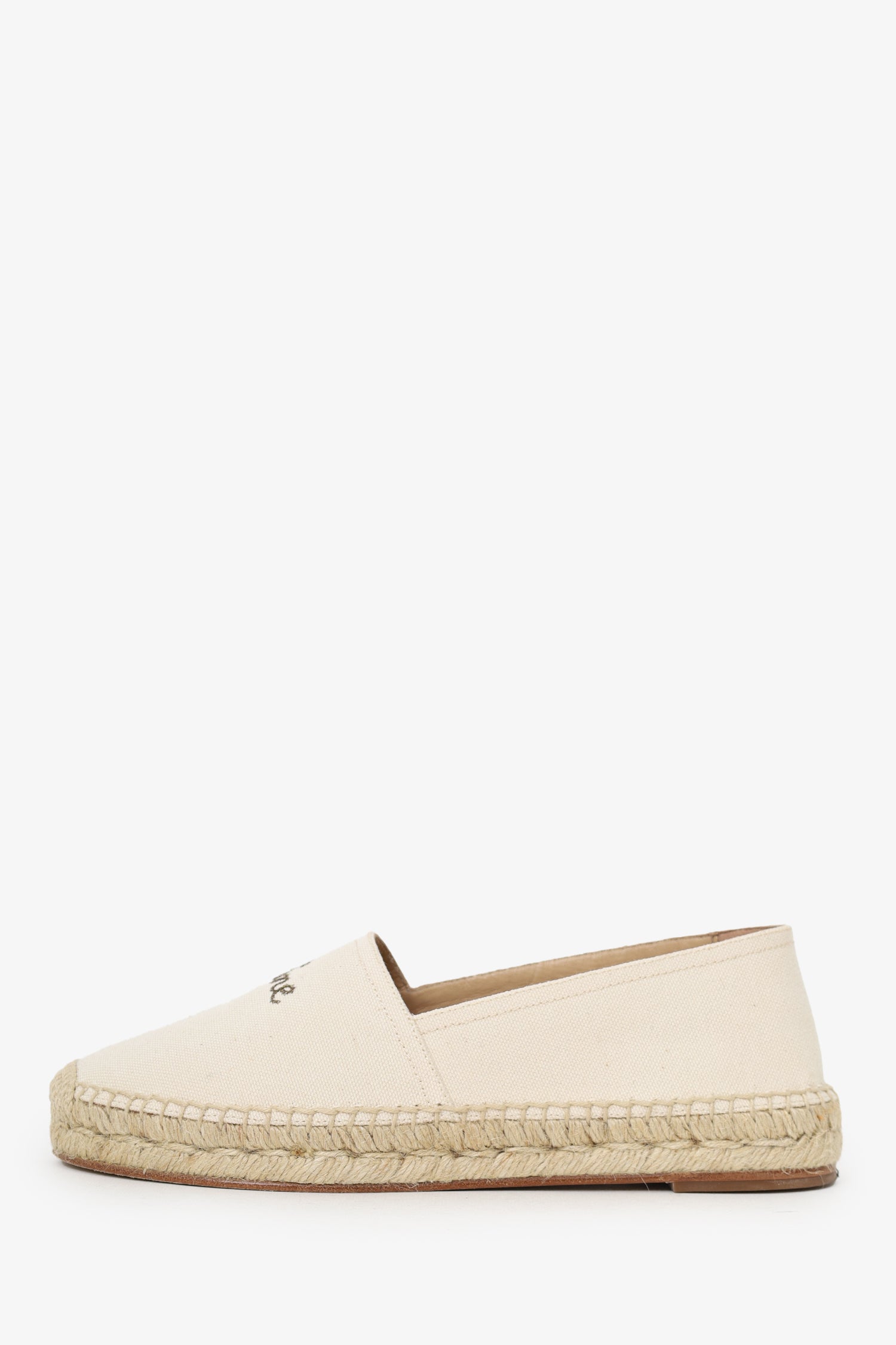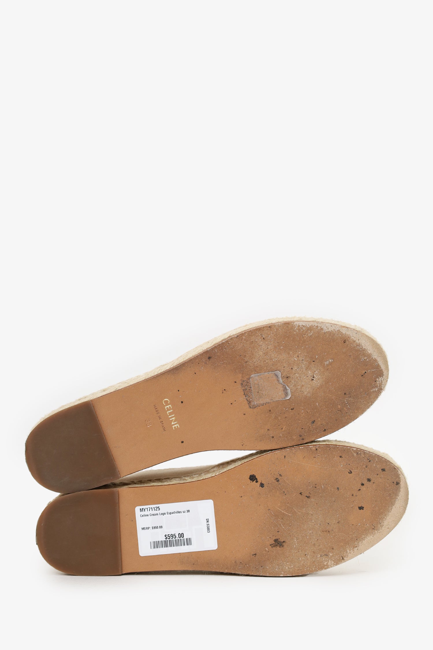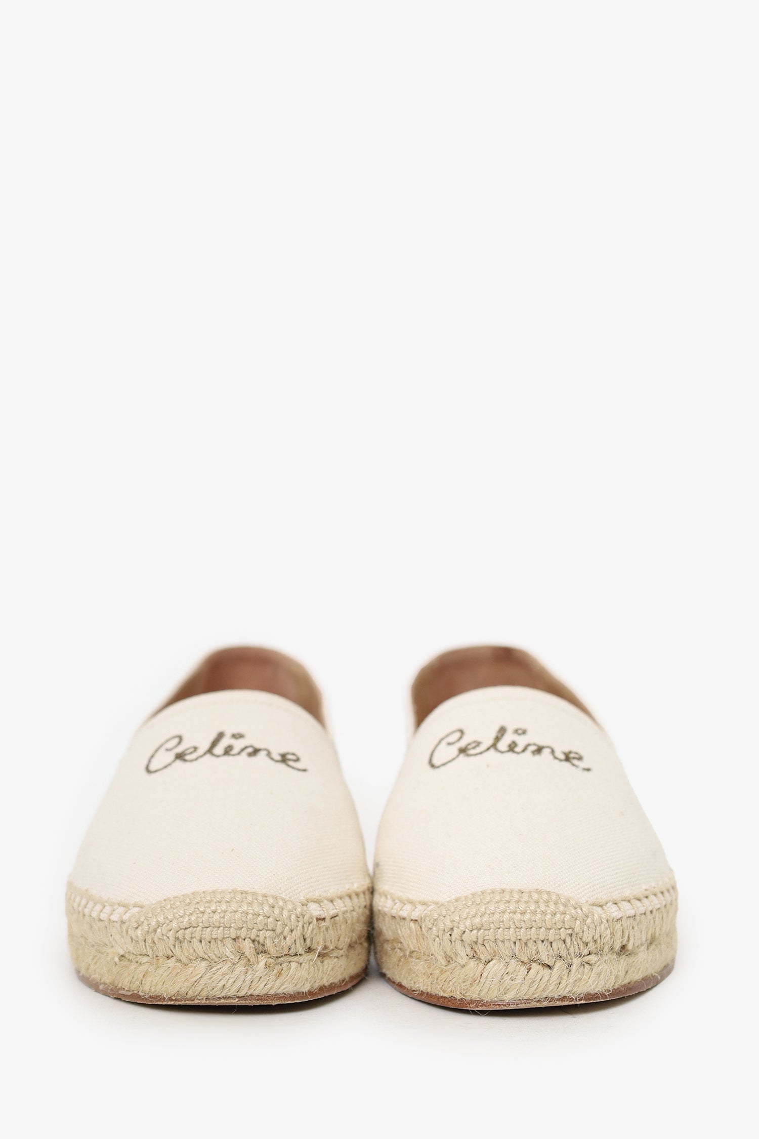 Refresh availabilityCeline Cream Logo Espadrilles. Slip-on. Round toe. Front embroidered logo. Tonal stitching.