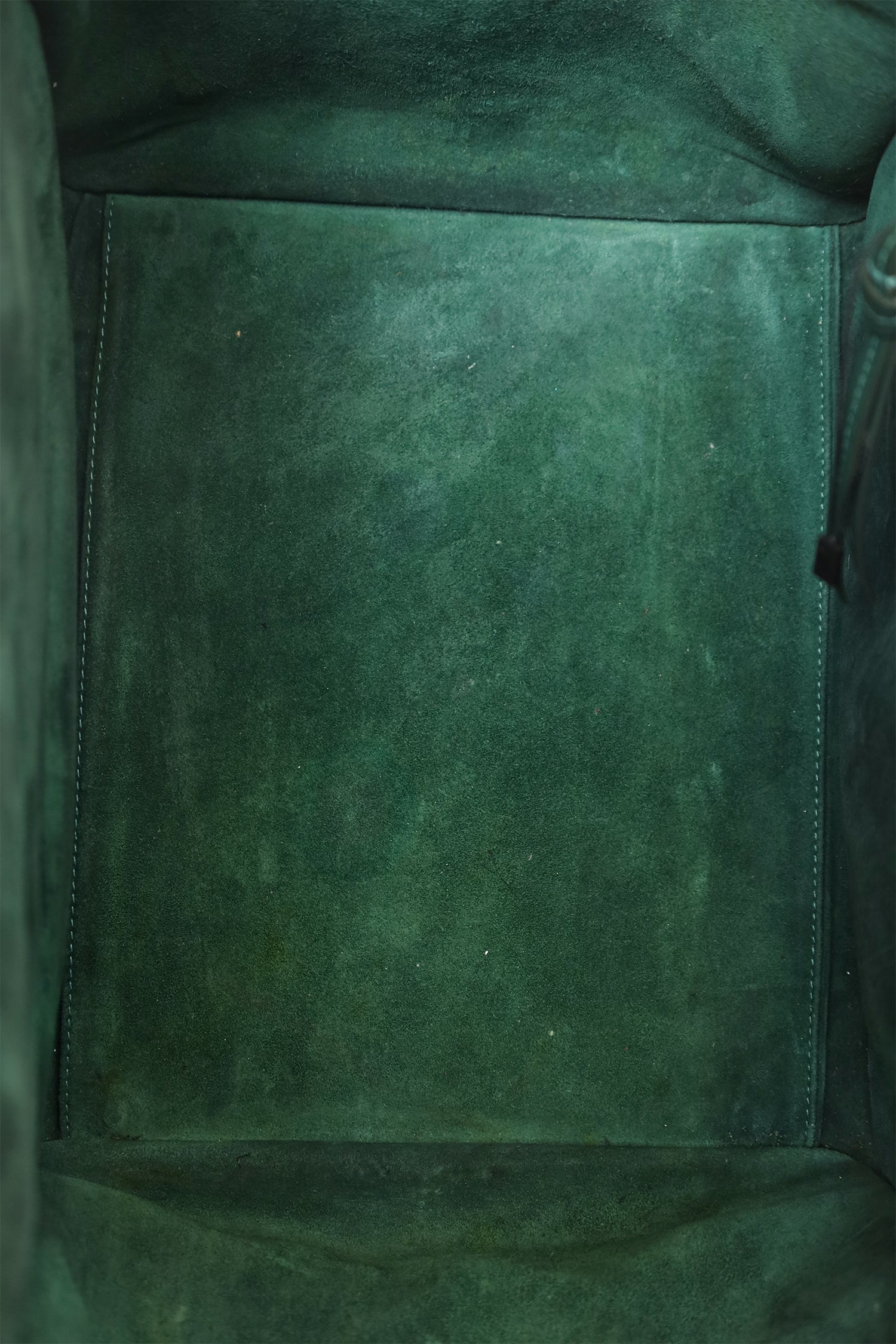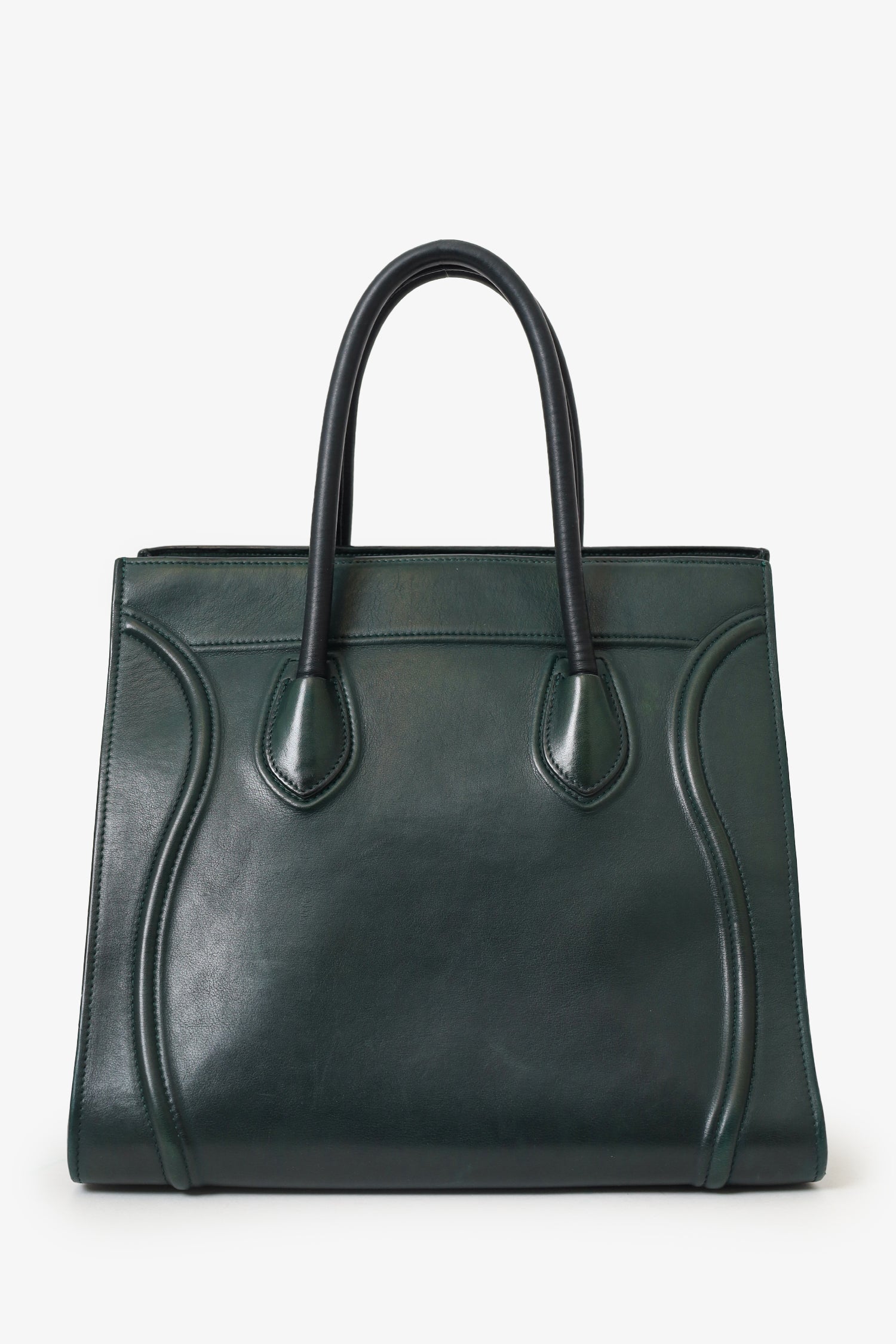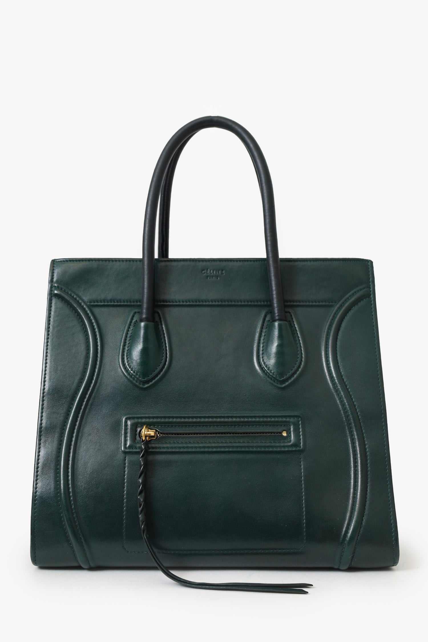 Refresh availabilityCeline Green Calfskin Medium Luggage Phantom Tote. Top open with adjustable strap closure. Twin top handles. Exterior front zip pocket. Suede interior lining. Single interior rear wall zip pocket. Bottom protective studs. Tonal stitching. Gold-tone hardware.