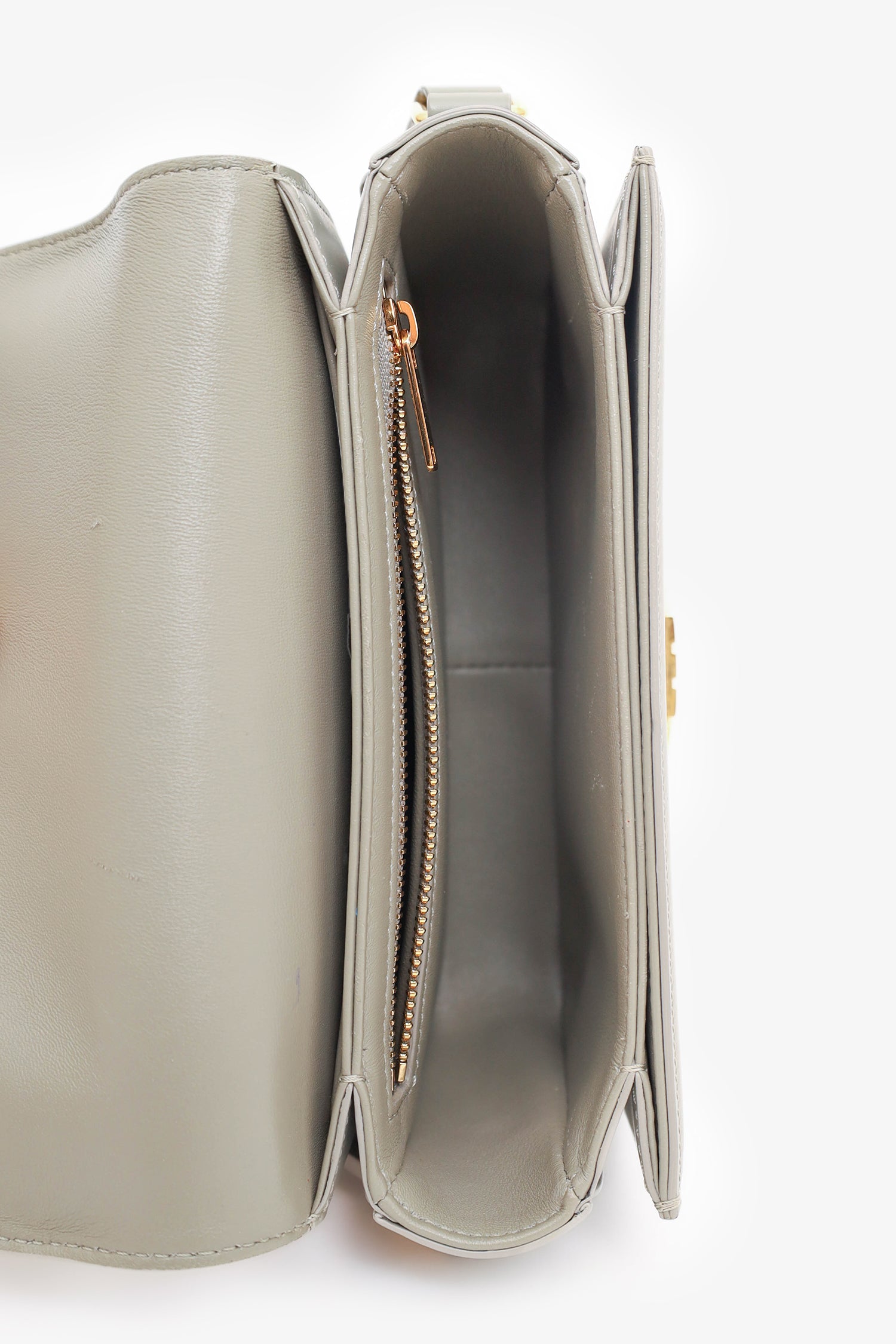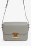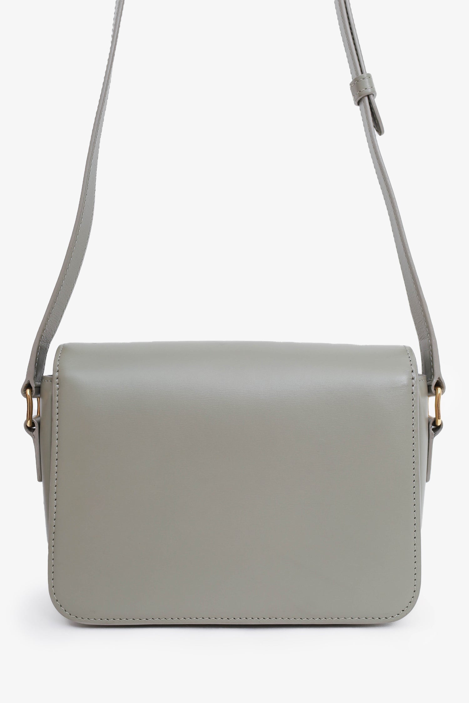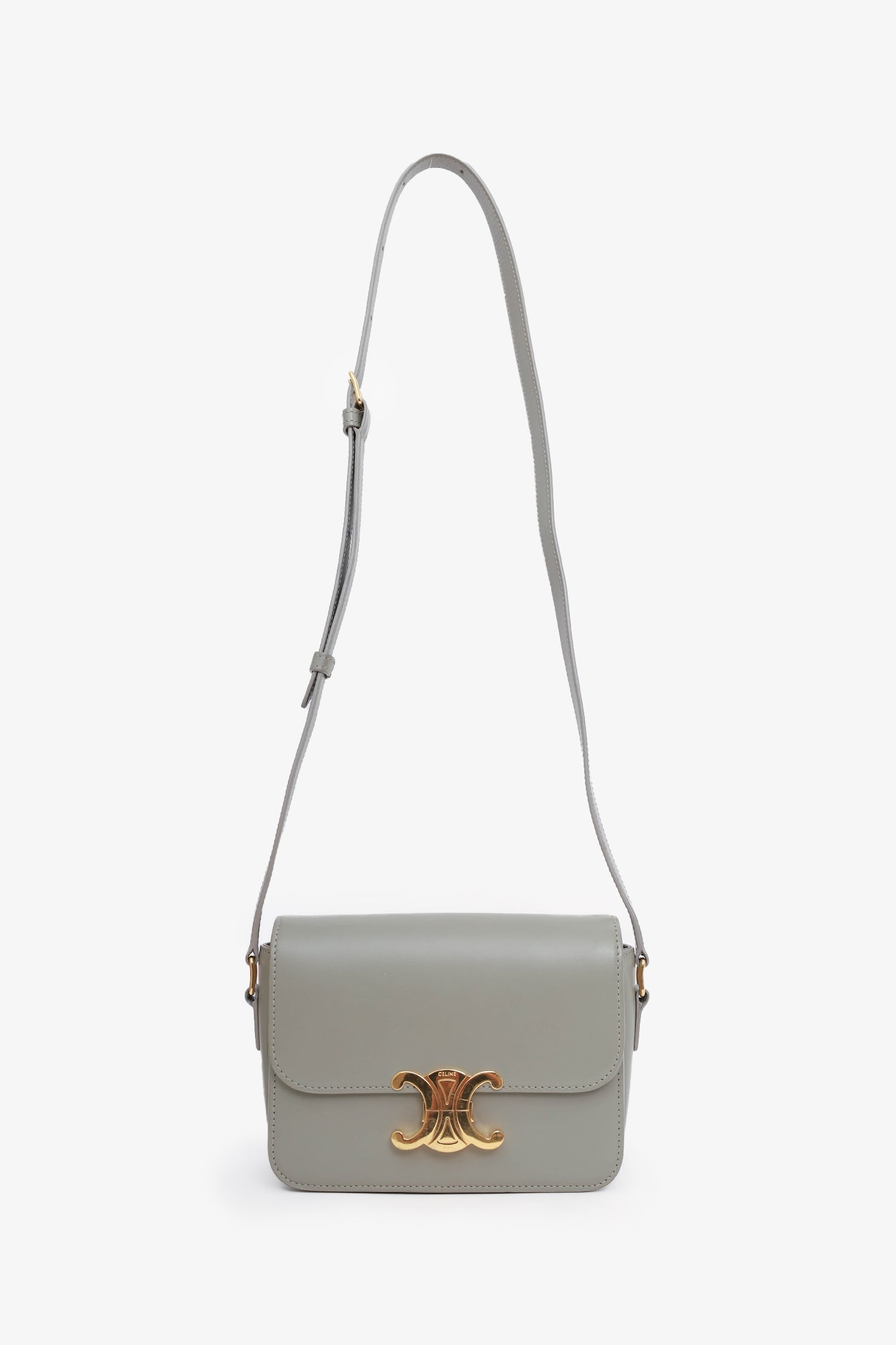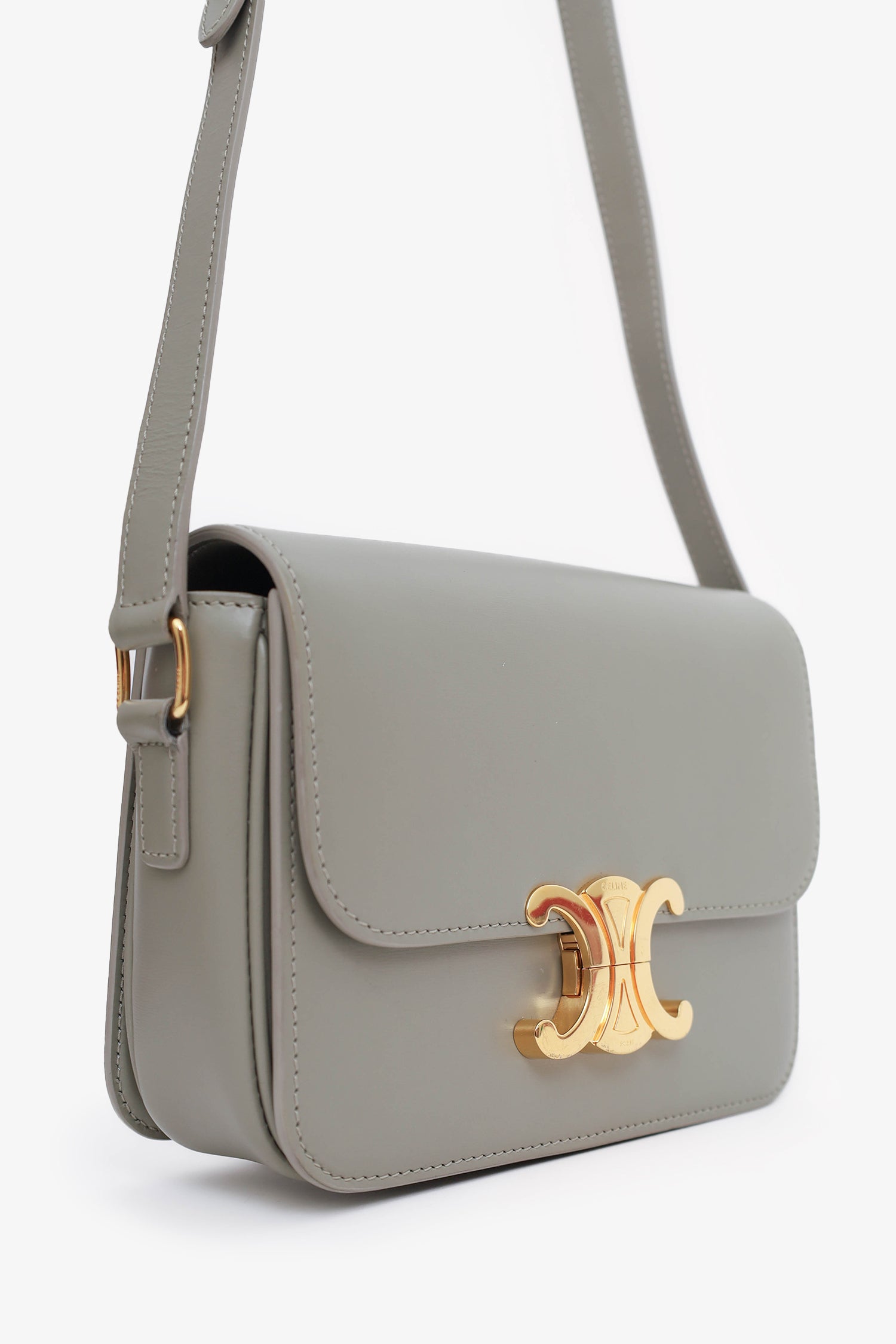 Refresh availabilityCeline Green Clay Calfskin Leather Teen Triomphe Crossbody. Front fold-over with pinch-lock closure. Adjustable crossbody/shoulder strap. Open interior with 3 compartments; 1 slip in back compartment and 1 zip pocket in centre compartment. Gold-tone hardware. Tonal stitching.