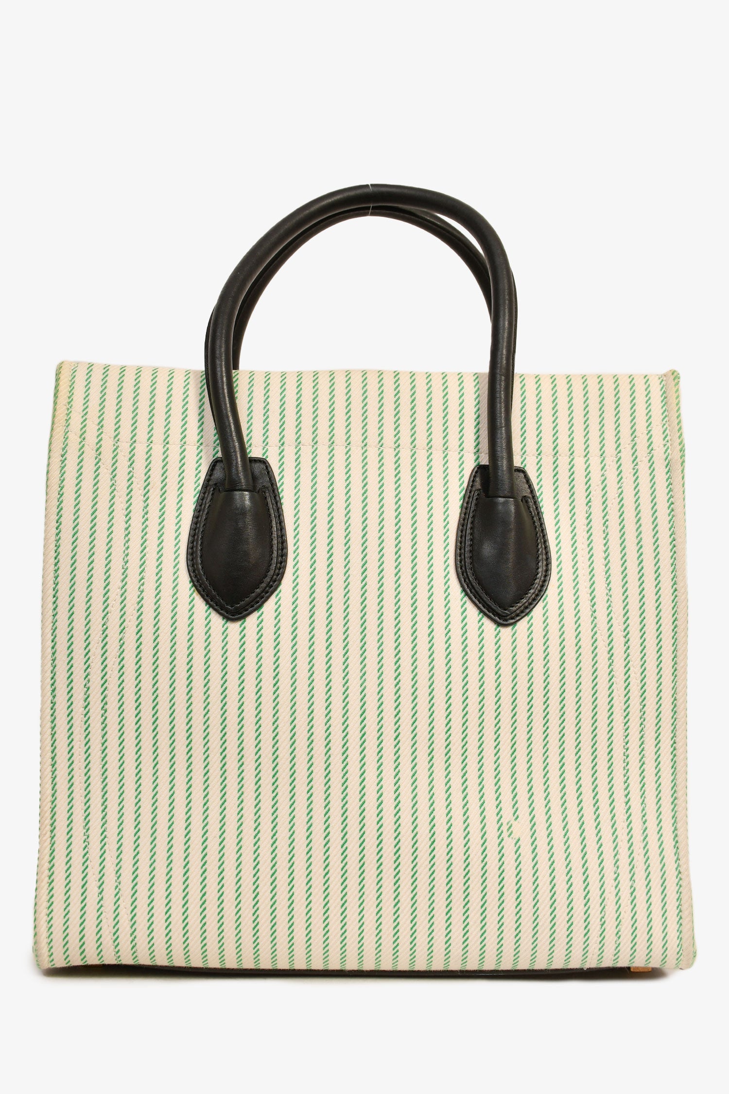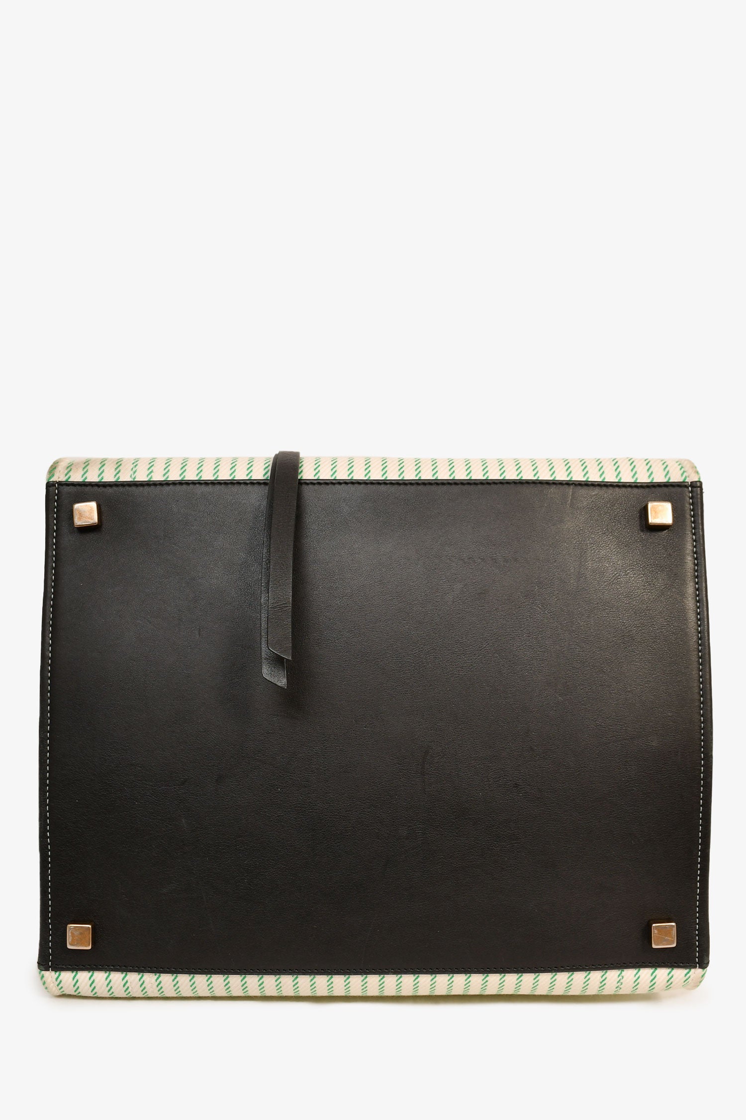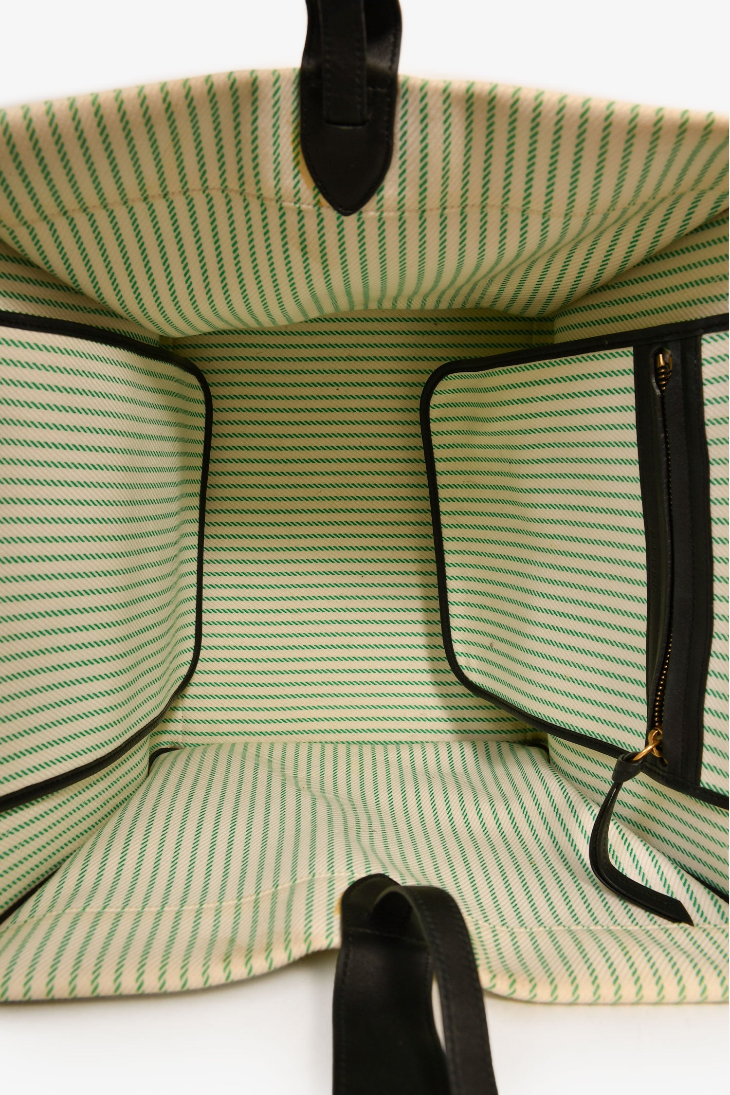 Refresh availabilityCeline Green/Cream Pinstripe Canvas Luggage Phantom Tote. Rolled leather handles. Black-tone leather trimming. 1 zipped exterior compartment. 1 interior compartment. Tonal stitching.