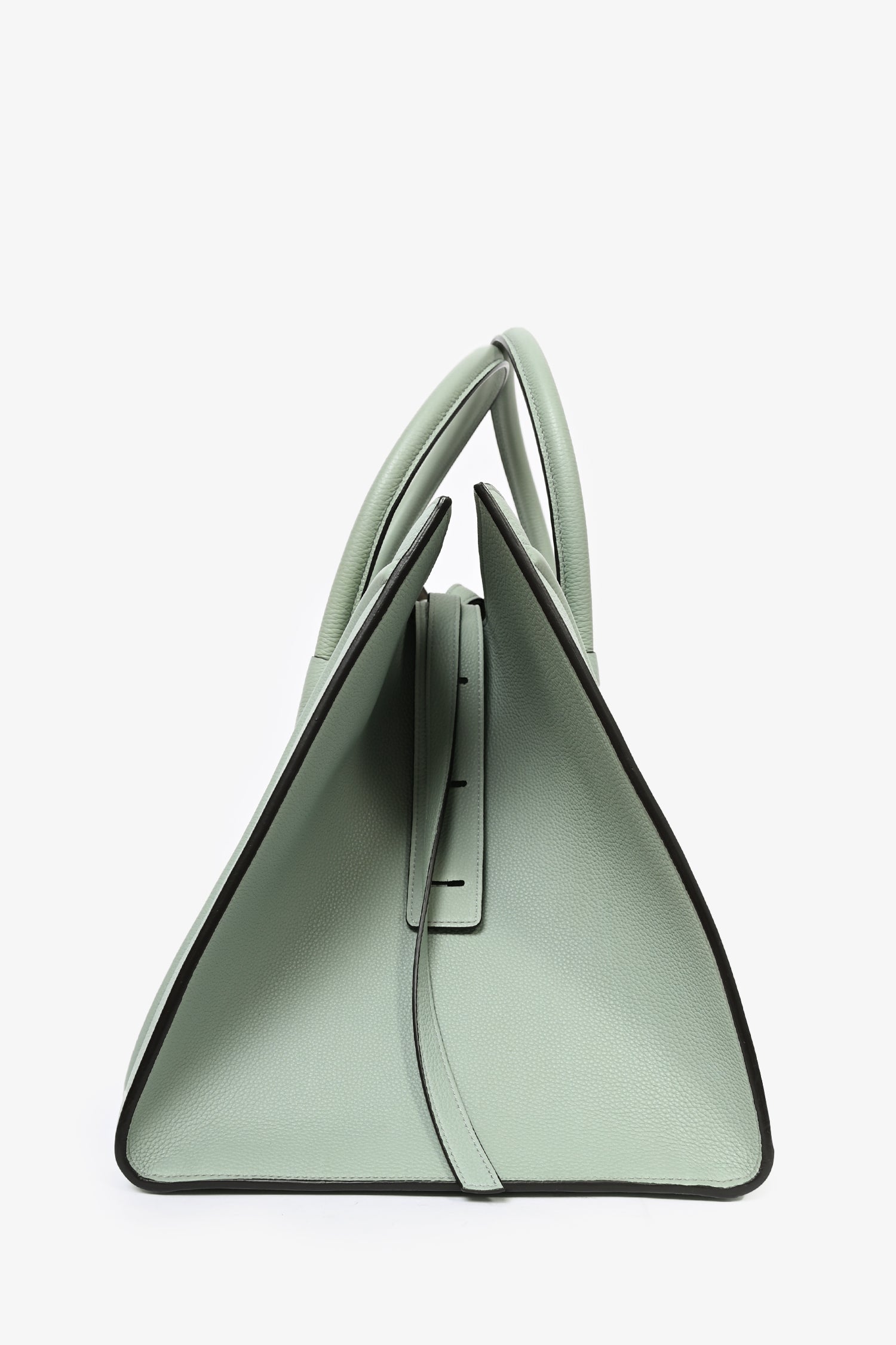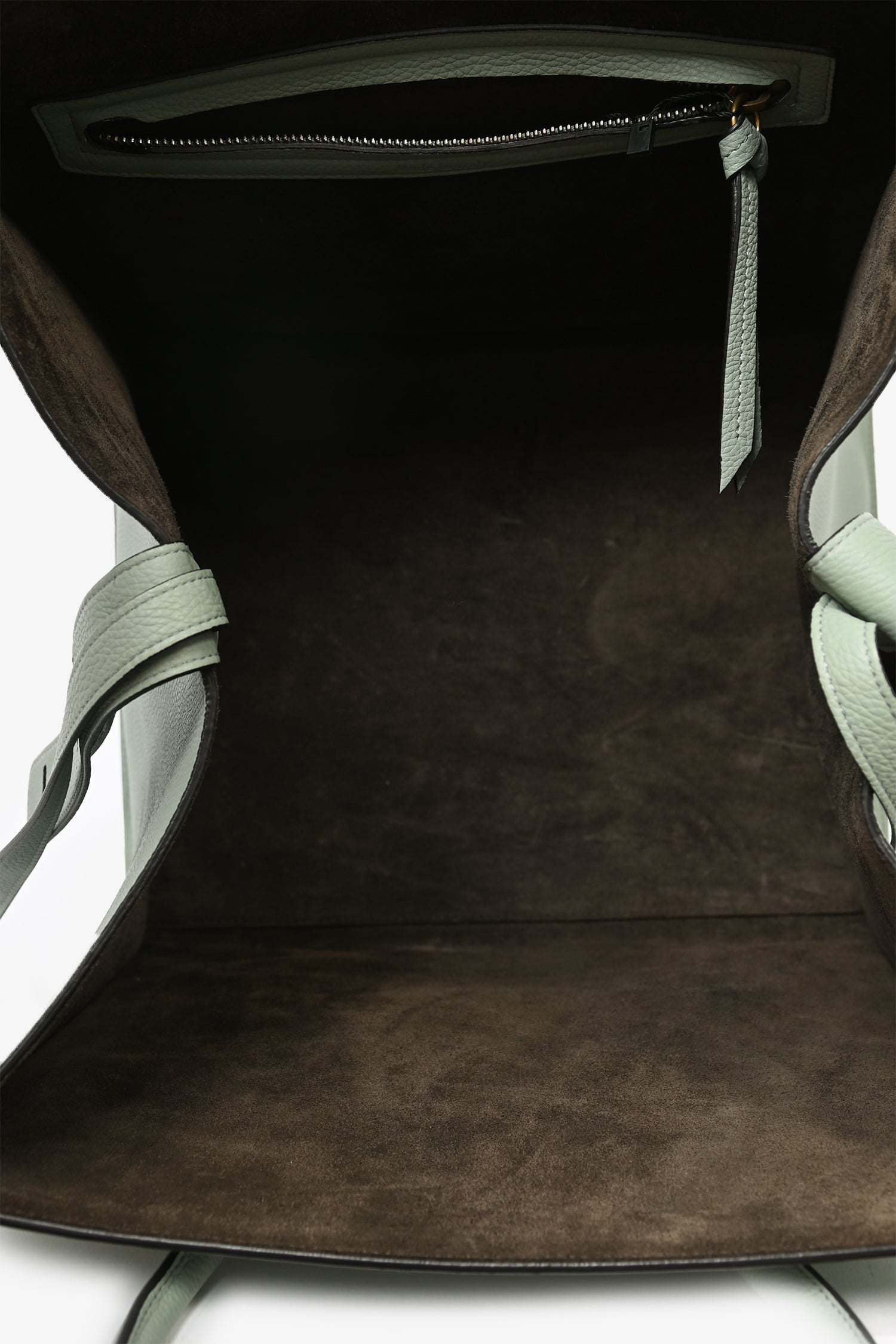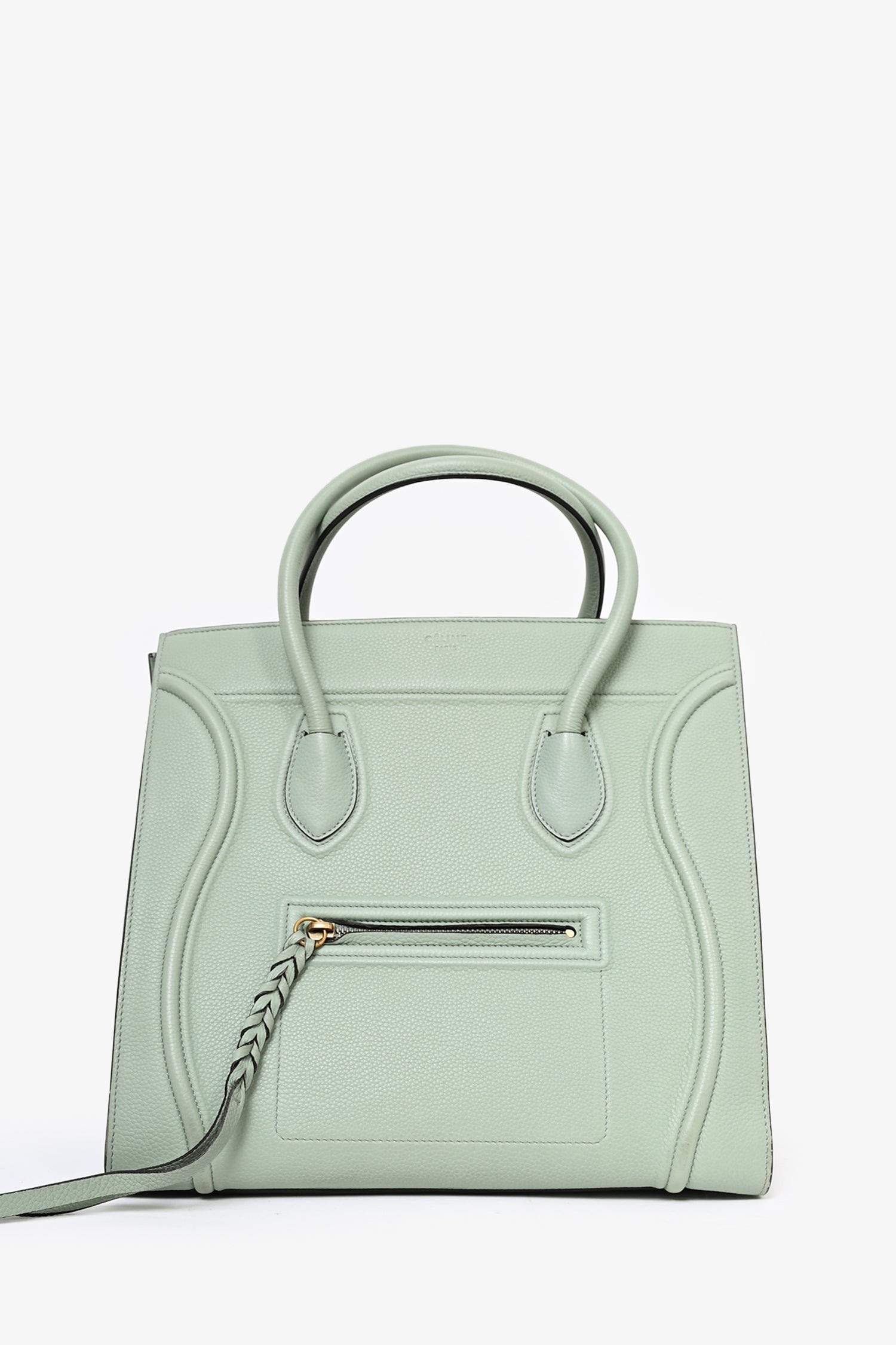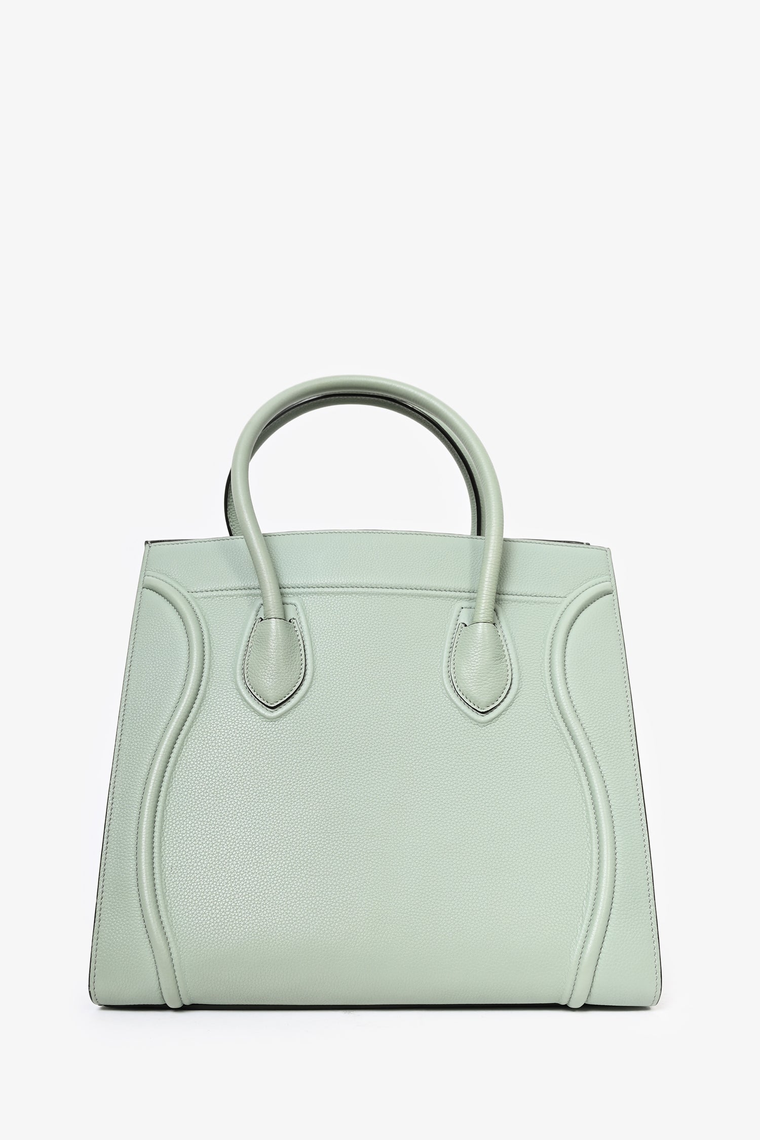 Refresh availabilityCeline Green Leather Phantom Luggage Bag. Rolled top handles. Tonal topstitching. Leather trimming. Suede-lined interior with single interior pocket. Adjustable straps at sides. Front exterior compartment.