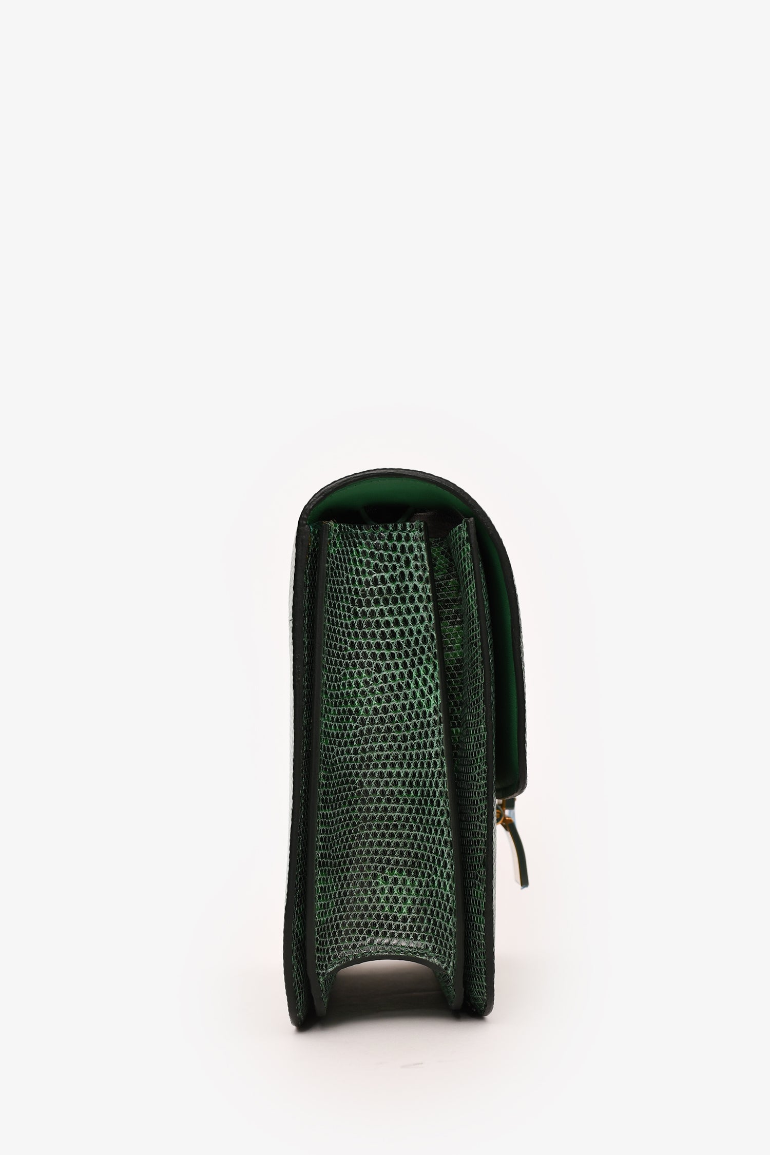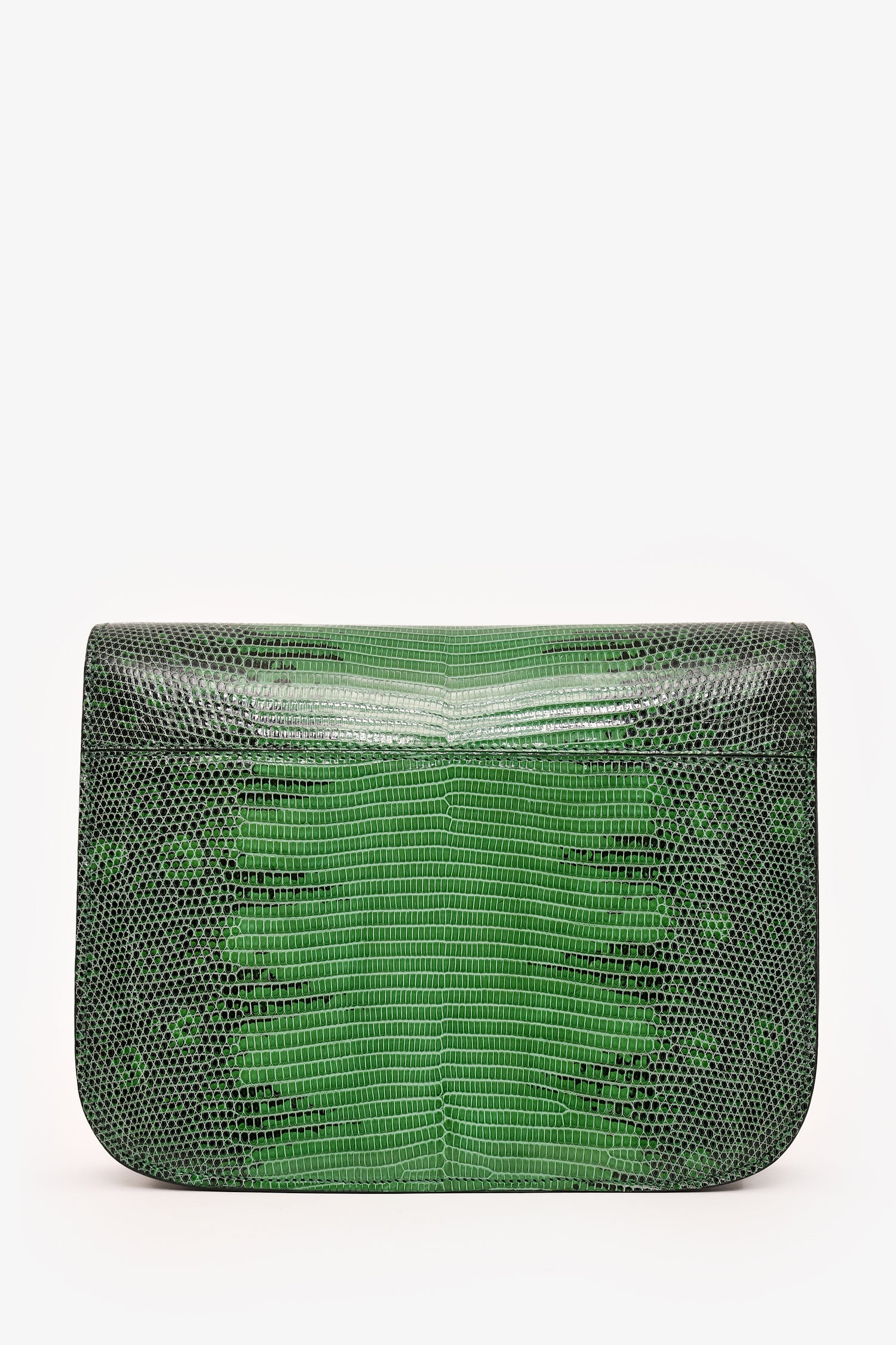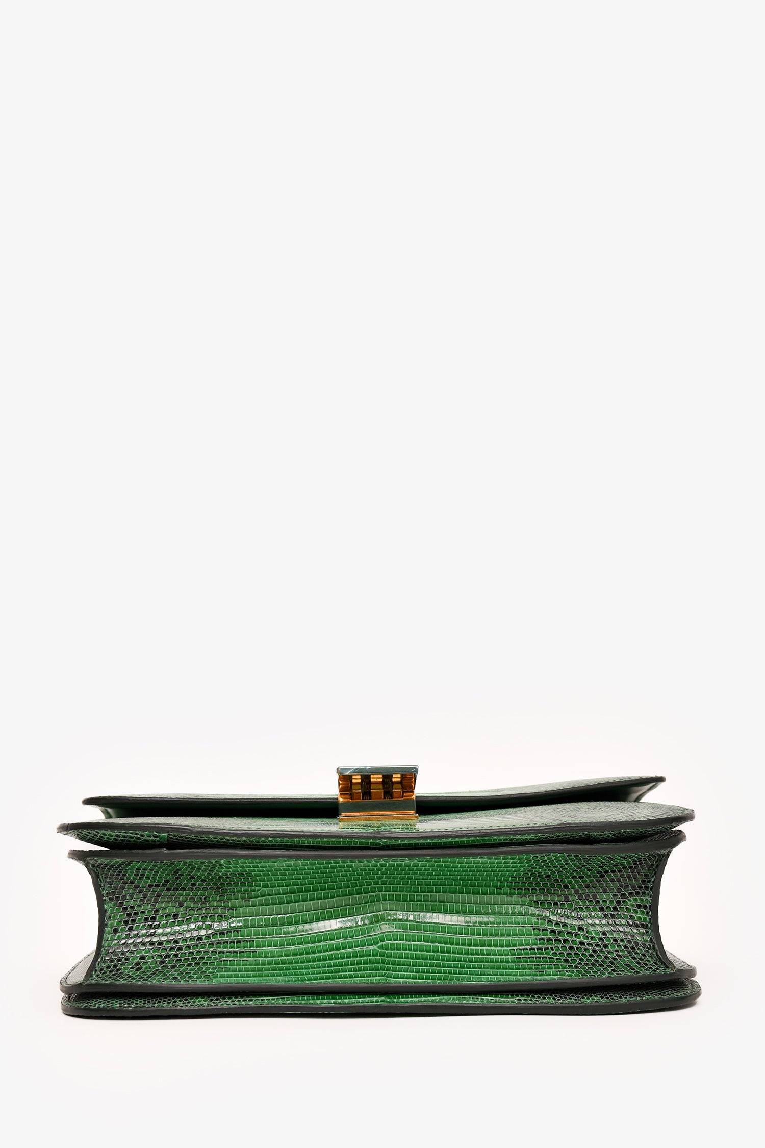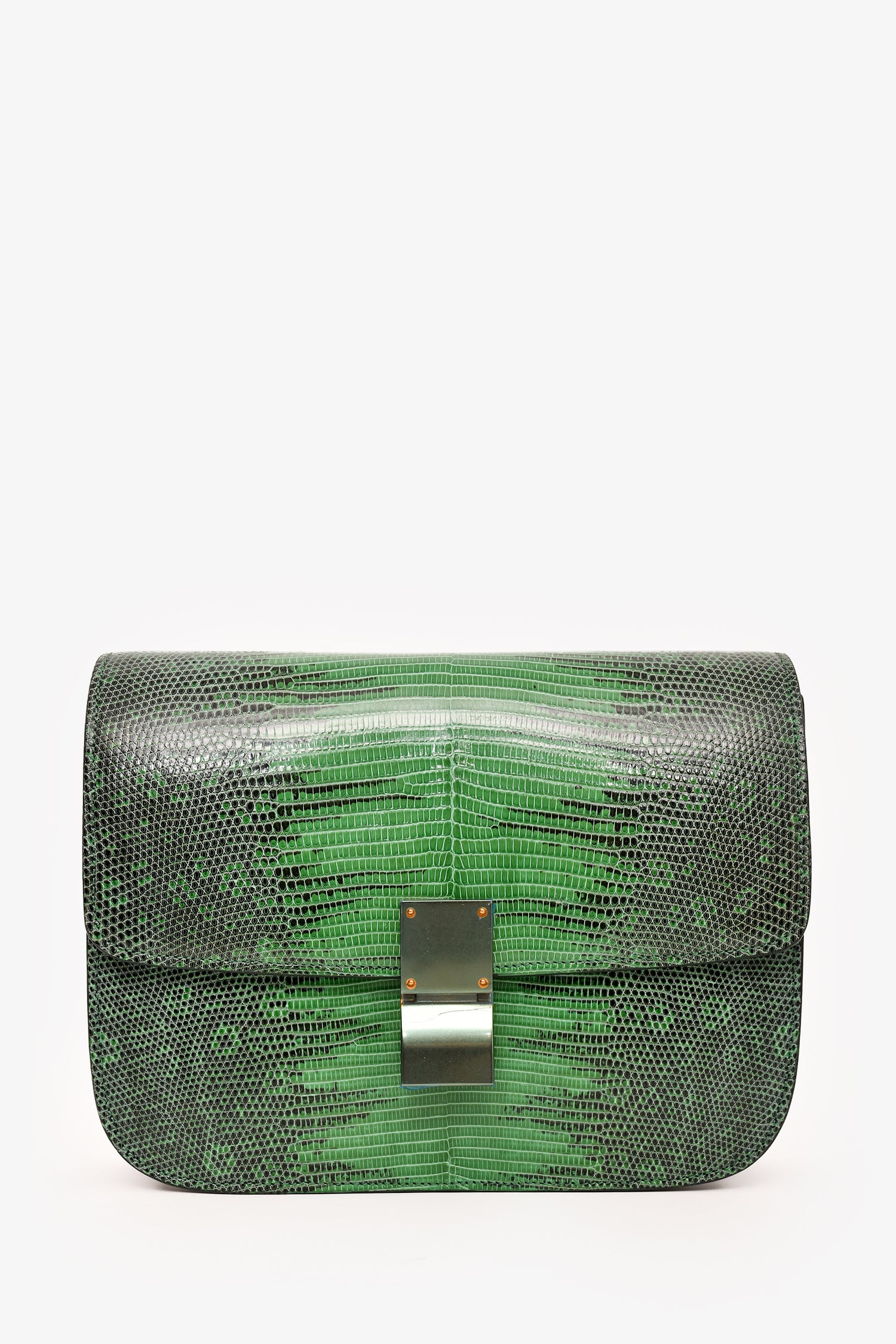 Refresh availabilityCeline Green Lizard Medium Box Bag. Coated trimming. Gold-tone hardware. Fold-over flap with a flip-up lock closure. Interior zipped compartment. 2 spacious compartments with 2 pockets.